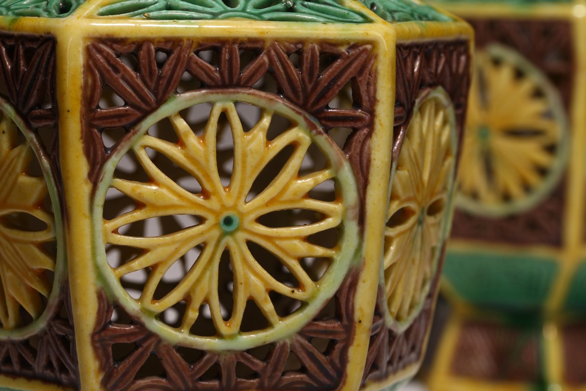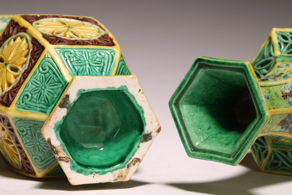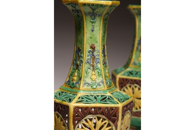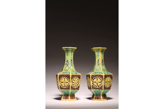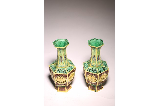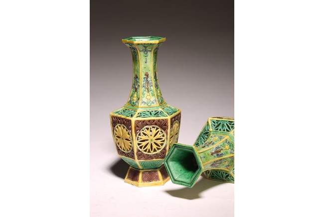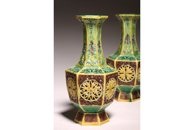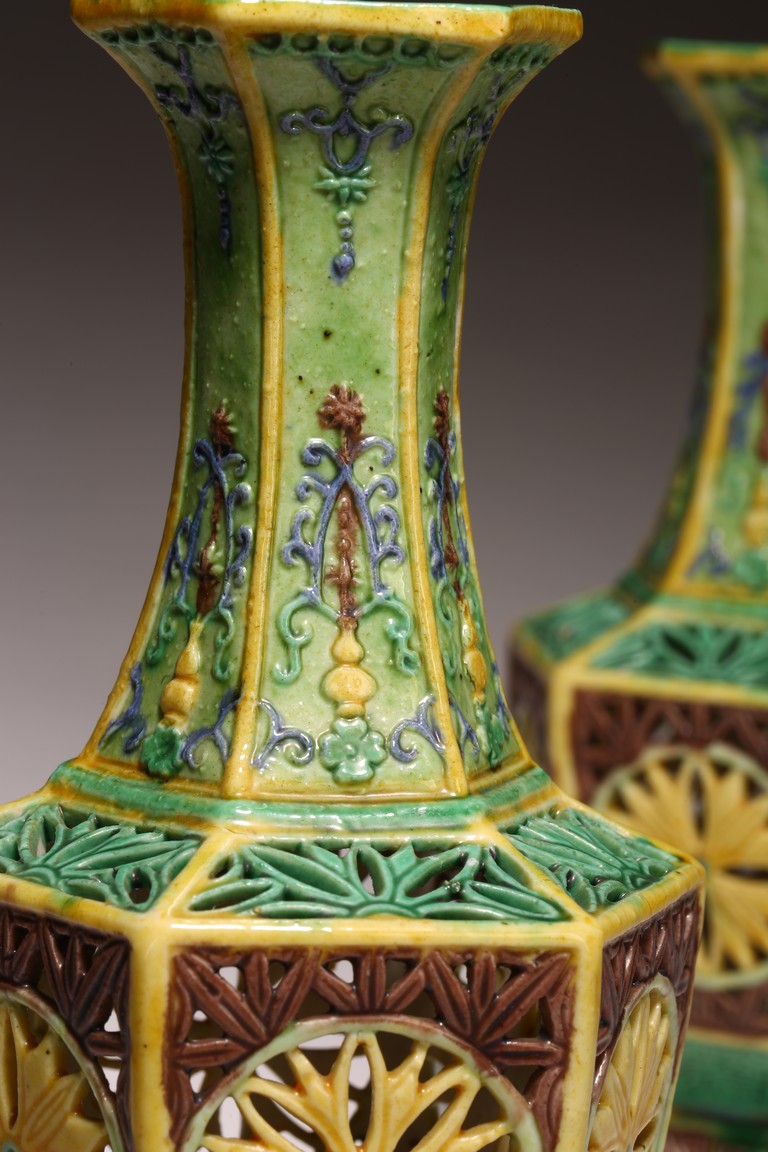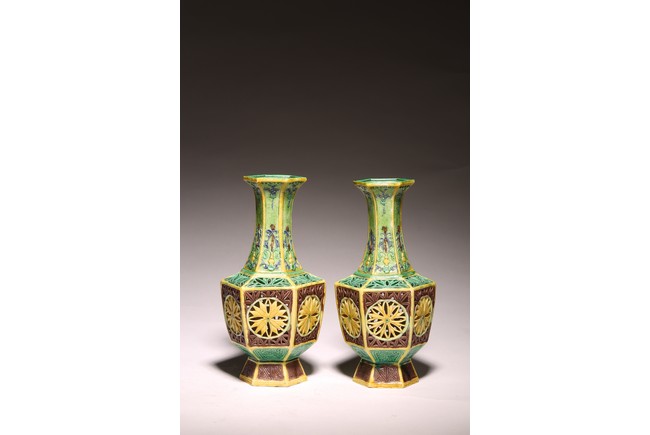 敞口,長頸,型作六方,圈足外撇。施素三彩,頸部繪“花卉紋”“葫蘆紋”, 腹部镂空繪“花瓣紋”,成對保存。