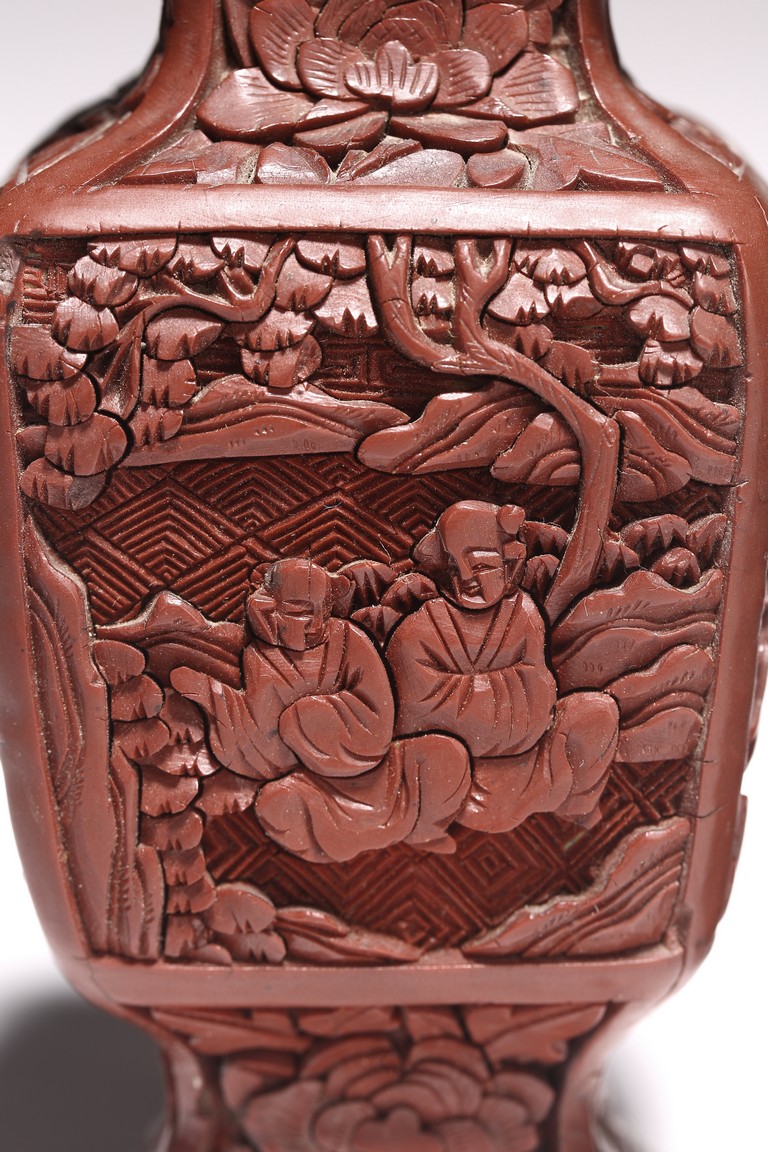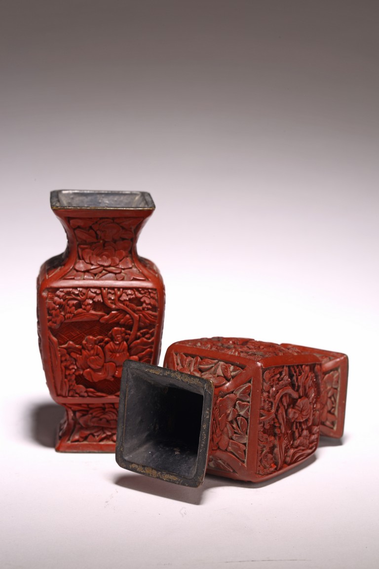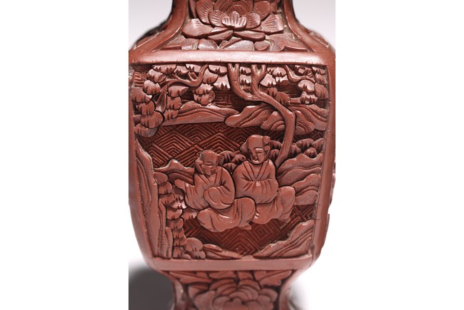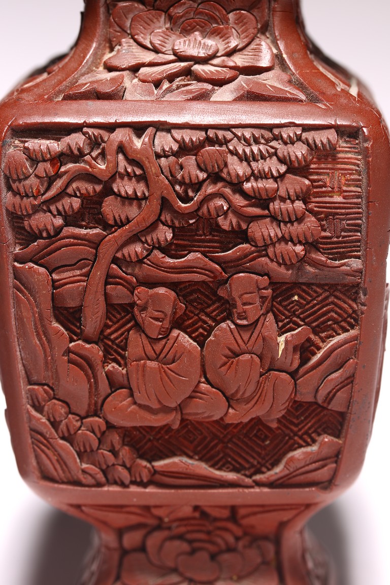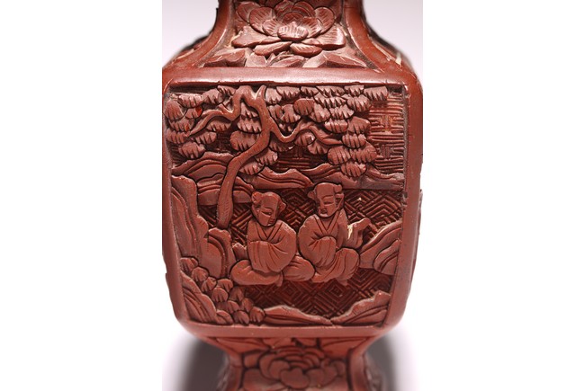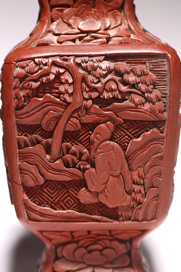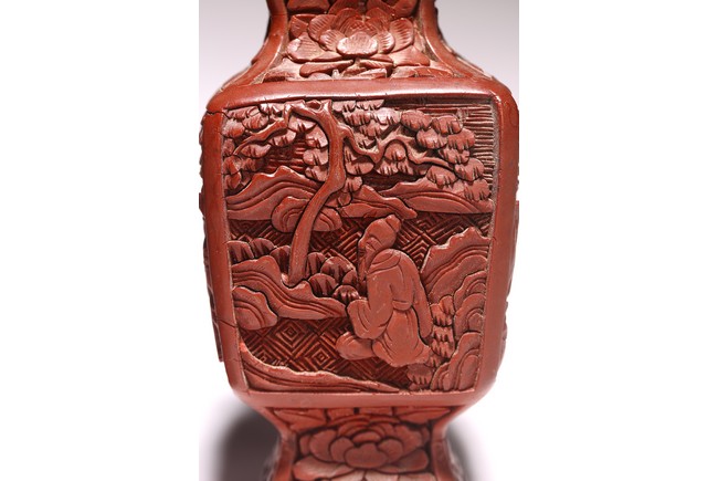 撇口, 束頸, 直腹下收, 圈足外撇。通體髹朱漆,頸 部雕刻 “花卉紋” ,層次豐富,厚 實並富於體量感。腹 部主體雕刻“老者”“ 童子”“ 山石”“ 蒼松”。整器造型規矩, 端莊大方, 穩重典雅, 雕工嫻熟,刀 工細膩, 運刀如筆.
