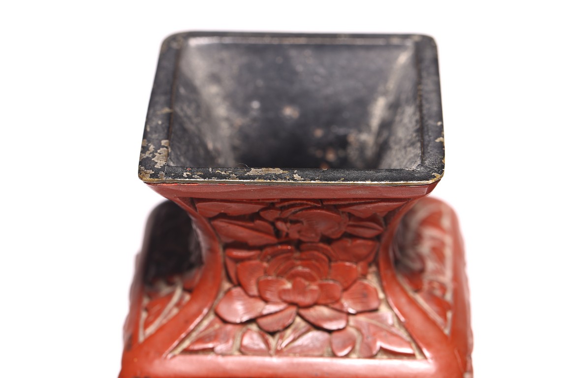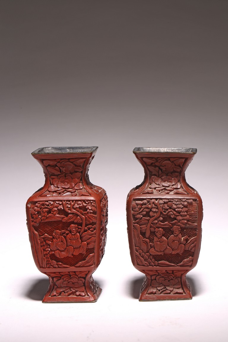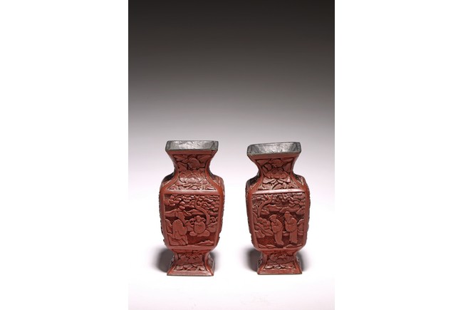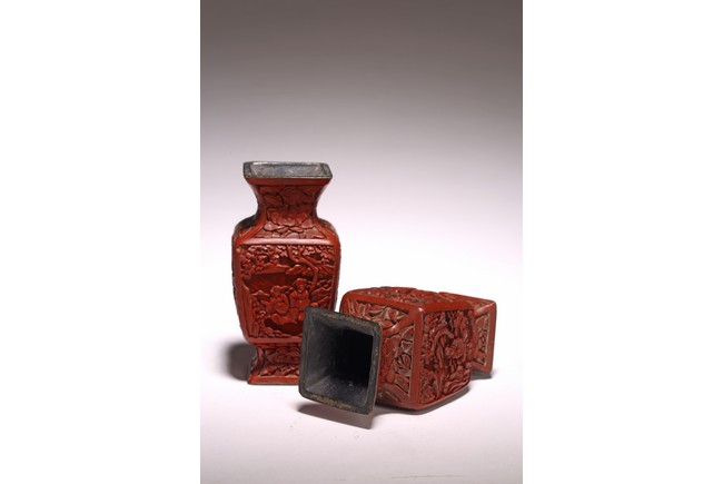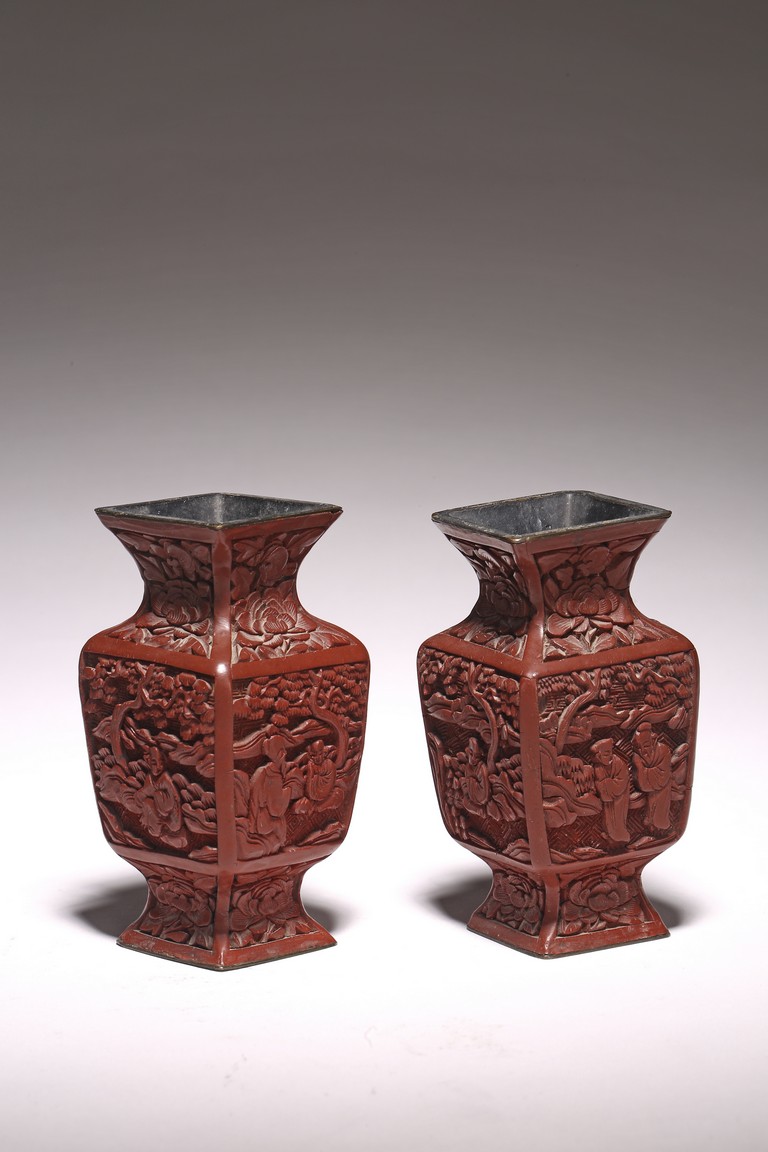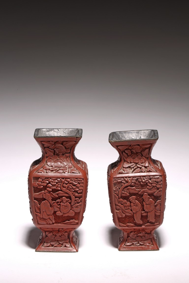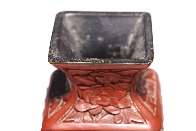 撇口, 束頸, 直腹下收, 圈足外撇。通體髹朱漆,頸 部雕刻 “花卉紋” ,層次豐富,厚 實並富於體量感。腹 部主體雕刻“老者”“ 童子”“ 山石”“ 蒼松”。整器造型規矩, 端莊大方, 穩重典雅, 雕工嫻熟,刀 工細膩, 運刀如筆.