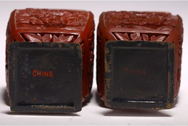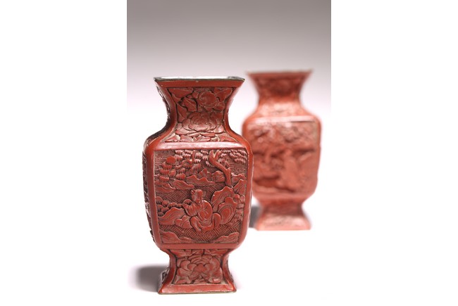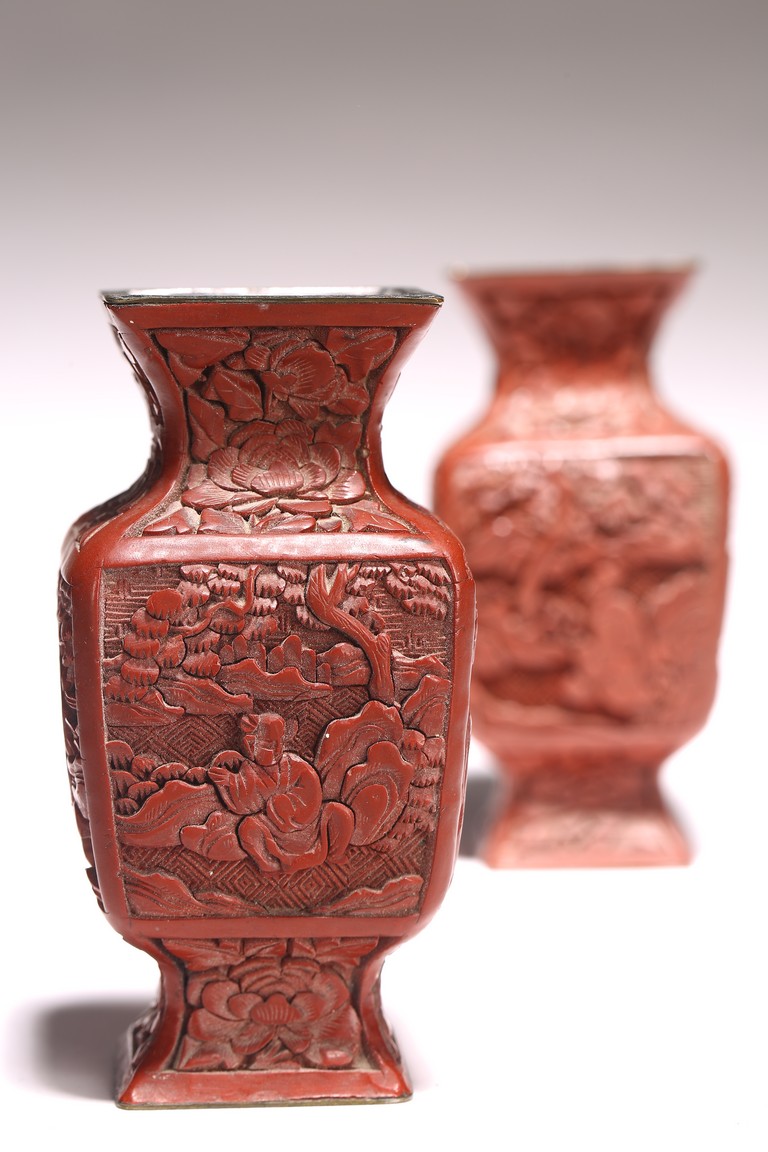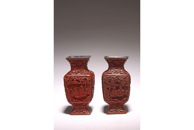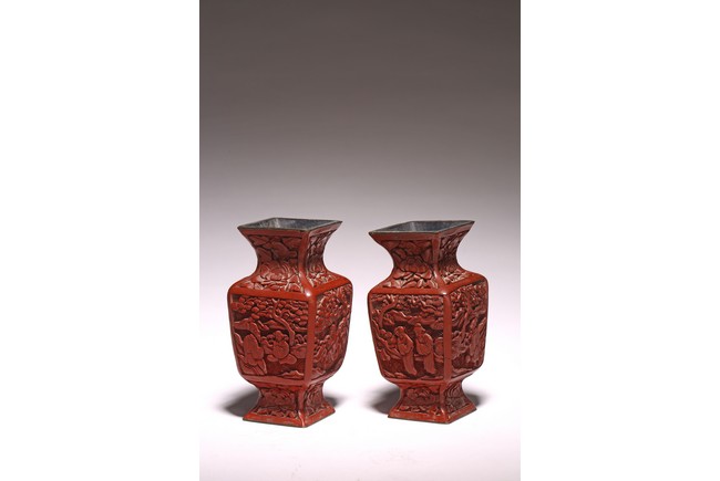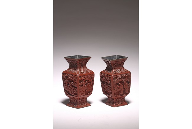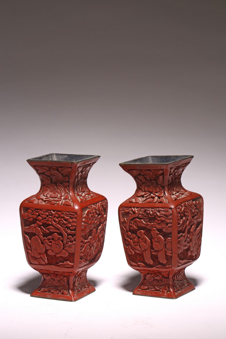 Late Qing/Republic period. Each carved in relief to the body with figures on four sides, the neck carved with peonies, interior and base lacquered in black.