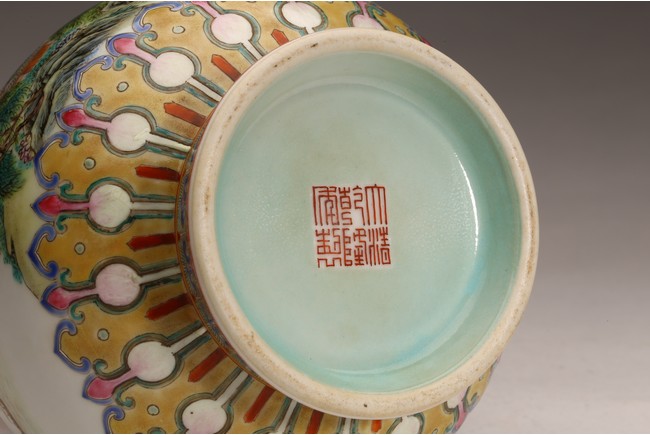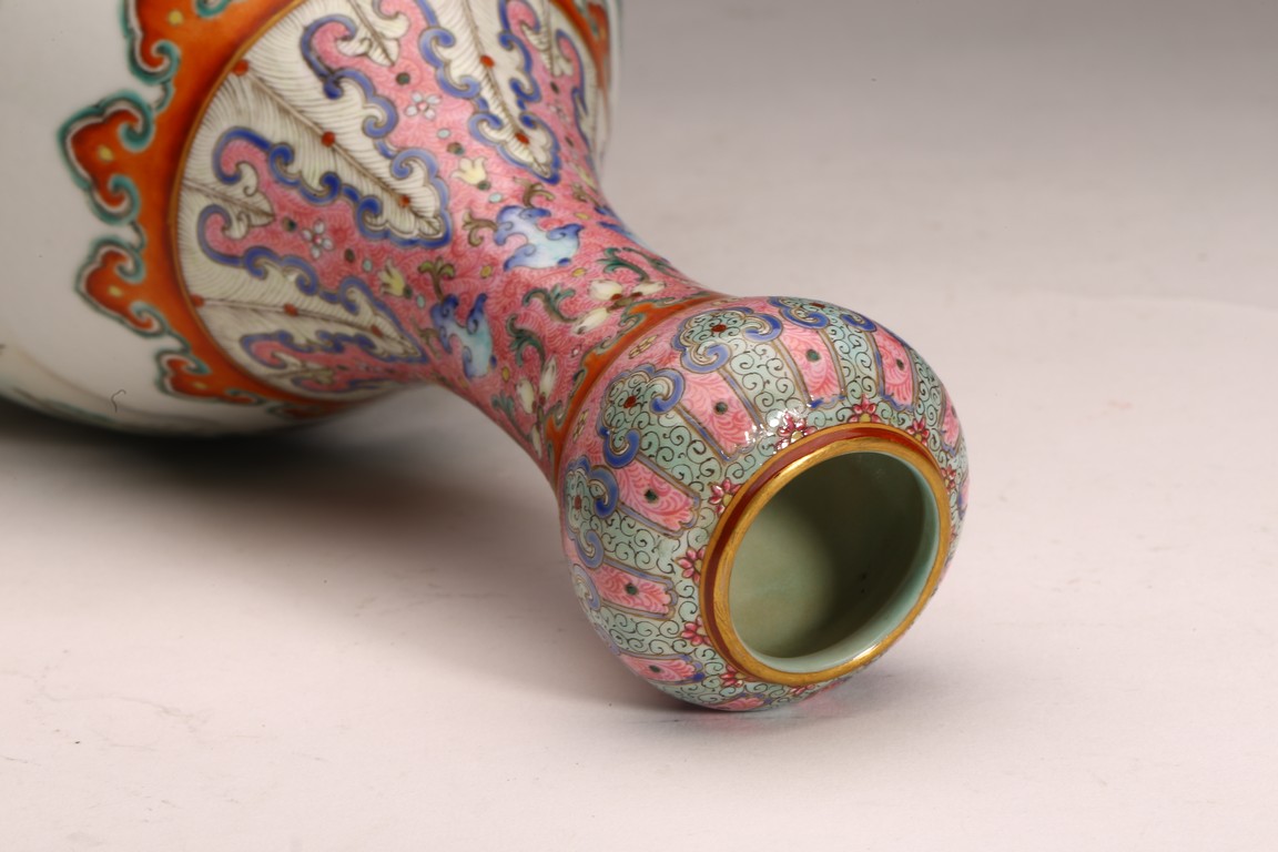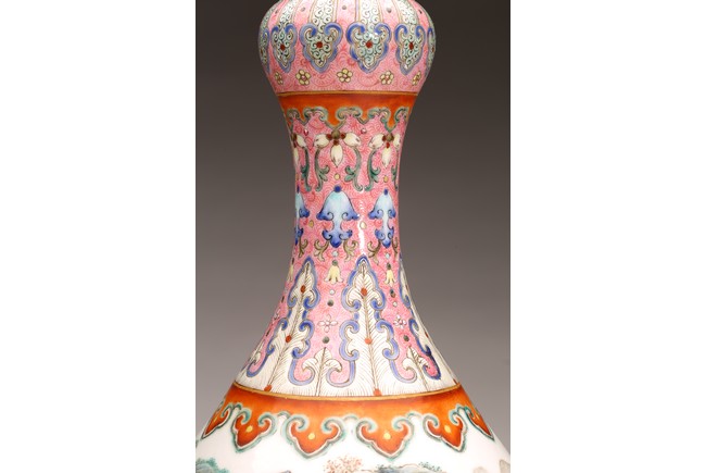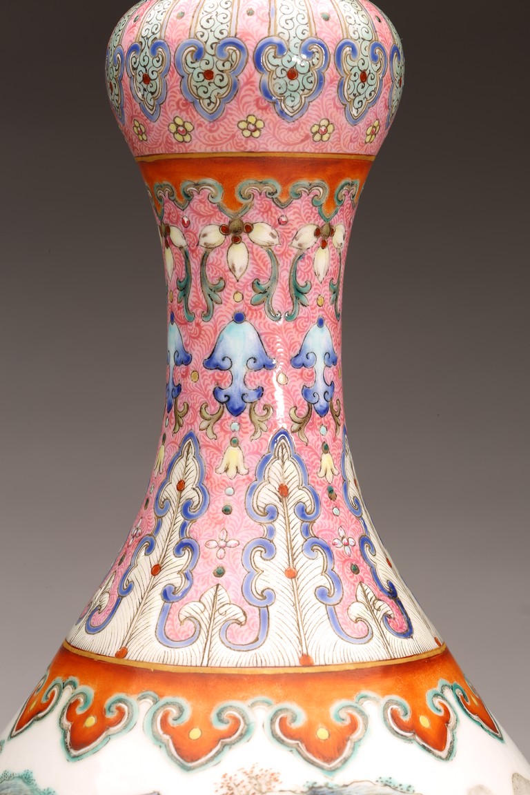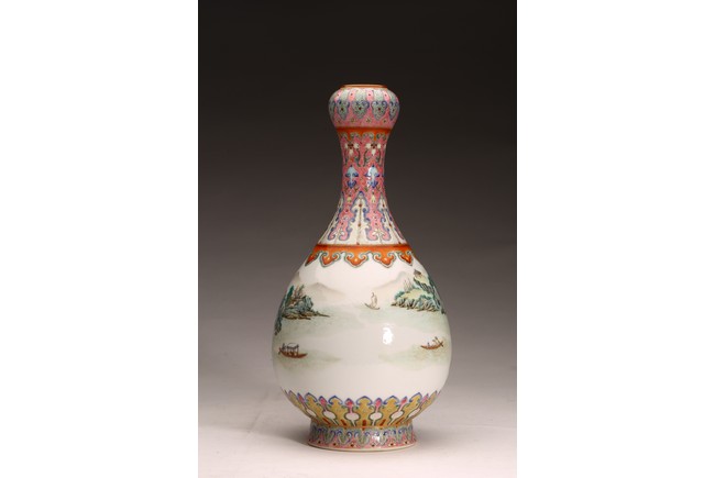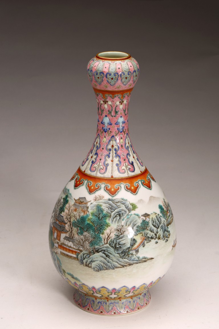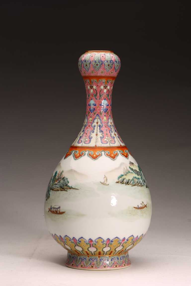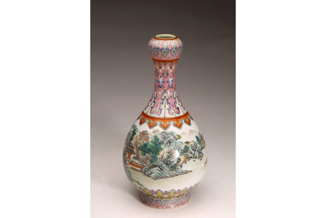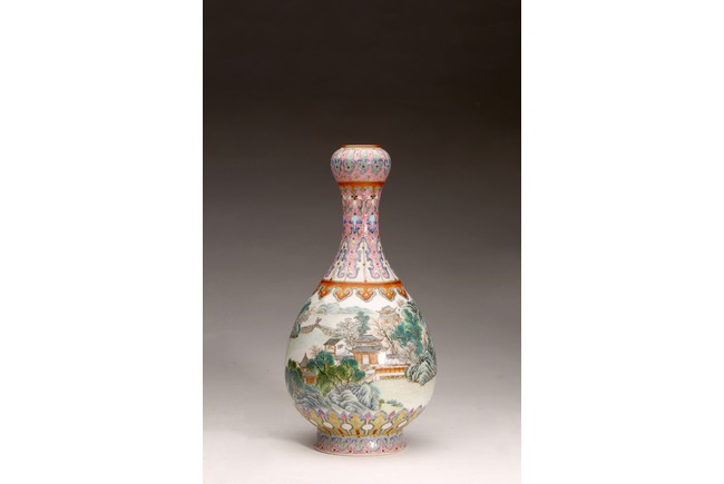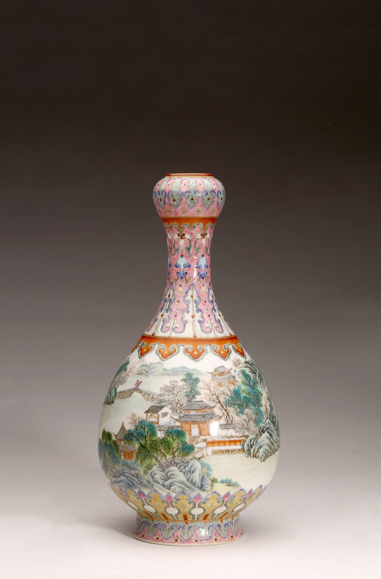 瓶口若蒜頭,因口若蒜頭而得名,長頸,溜肩,垂圓腹,圈足。本器胎骨細薄堅致,麗 質怡人,線條柔美起伏,盡見迤邐之姿。器身滿施粉彩,口部爲“倒掛如意紋”,頸部繪“花卉紋”“芭蕉紋”,腹部通景描繪山水人物,亭台樓閣,小橋流水,山石峭壁,樹木茂盛,構圖清晰,畫工精湛,活靈活現。 “大清乾隆年制”款識。