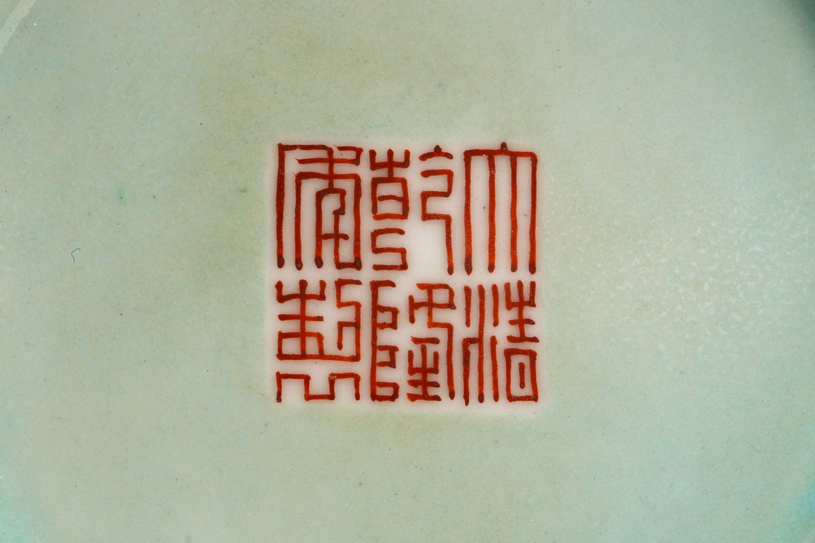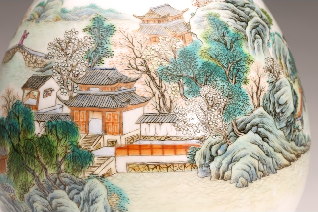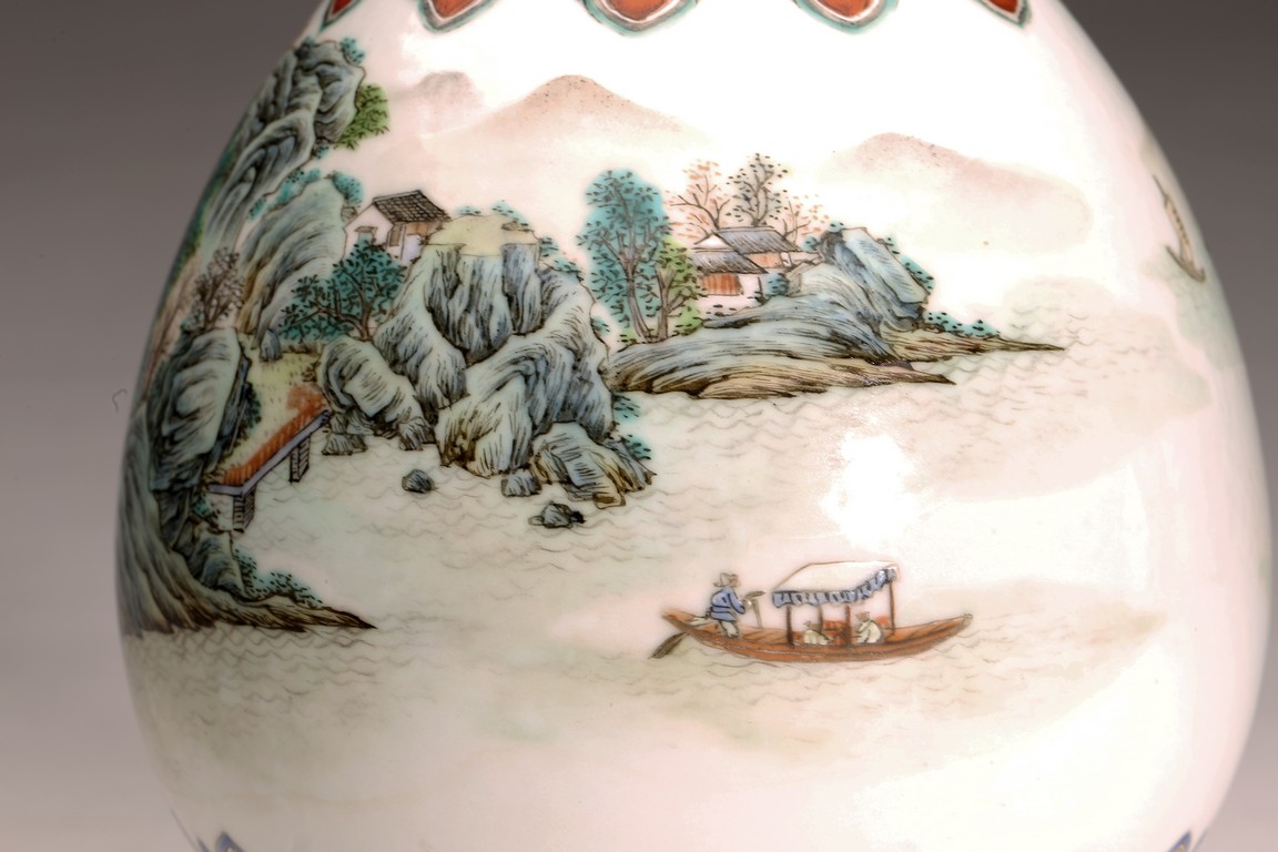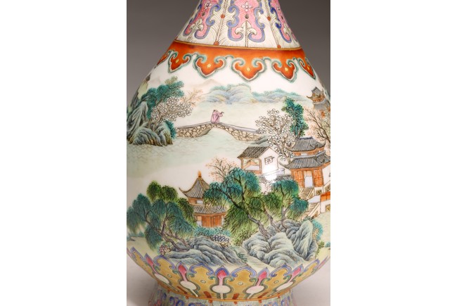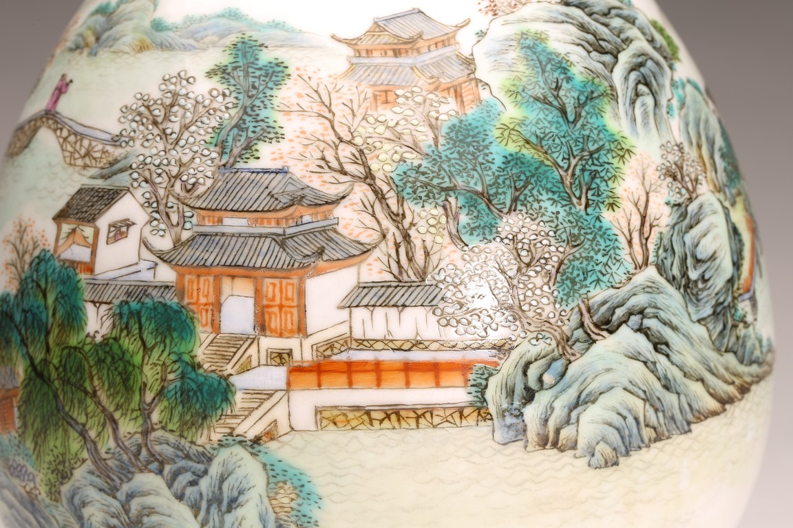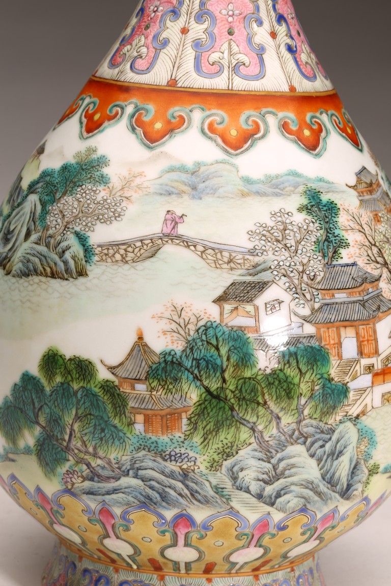 The pear shaped body decorated with lush landscape scene with village, pavilions, bridges, and gardens, the wasted neck decorated with stylized floral motifs, the base bears a apocryphal reign mark. Republic period.