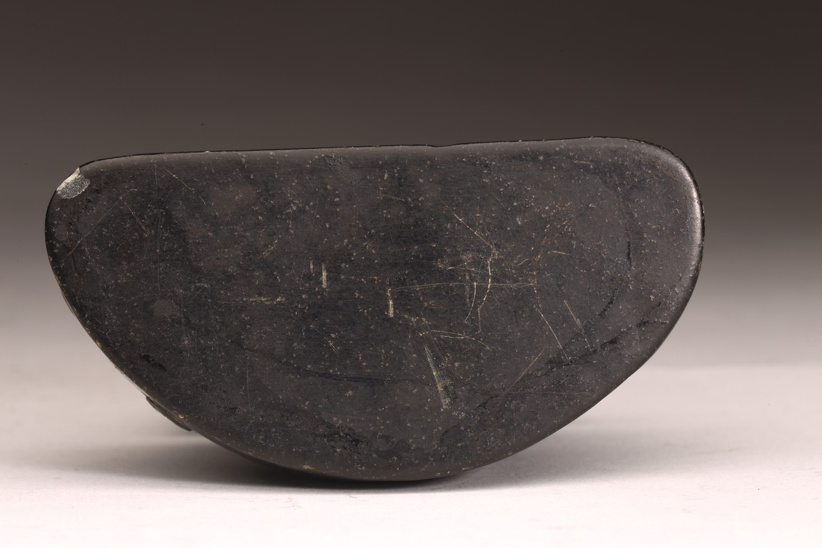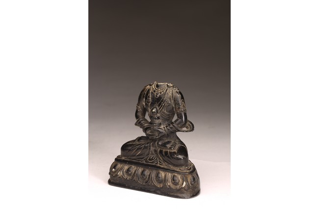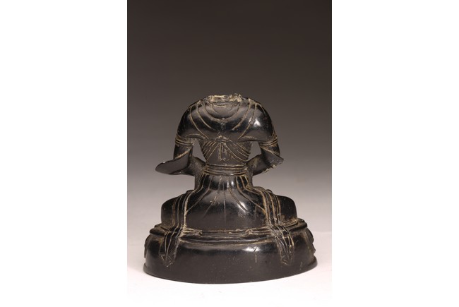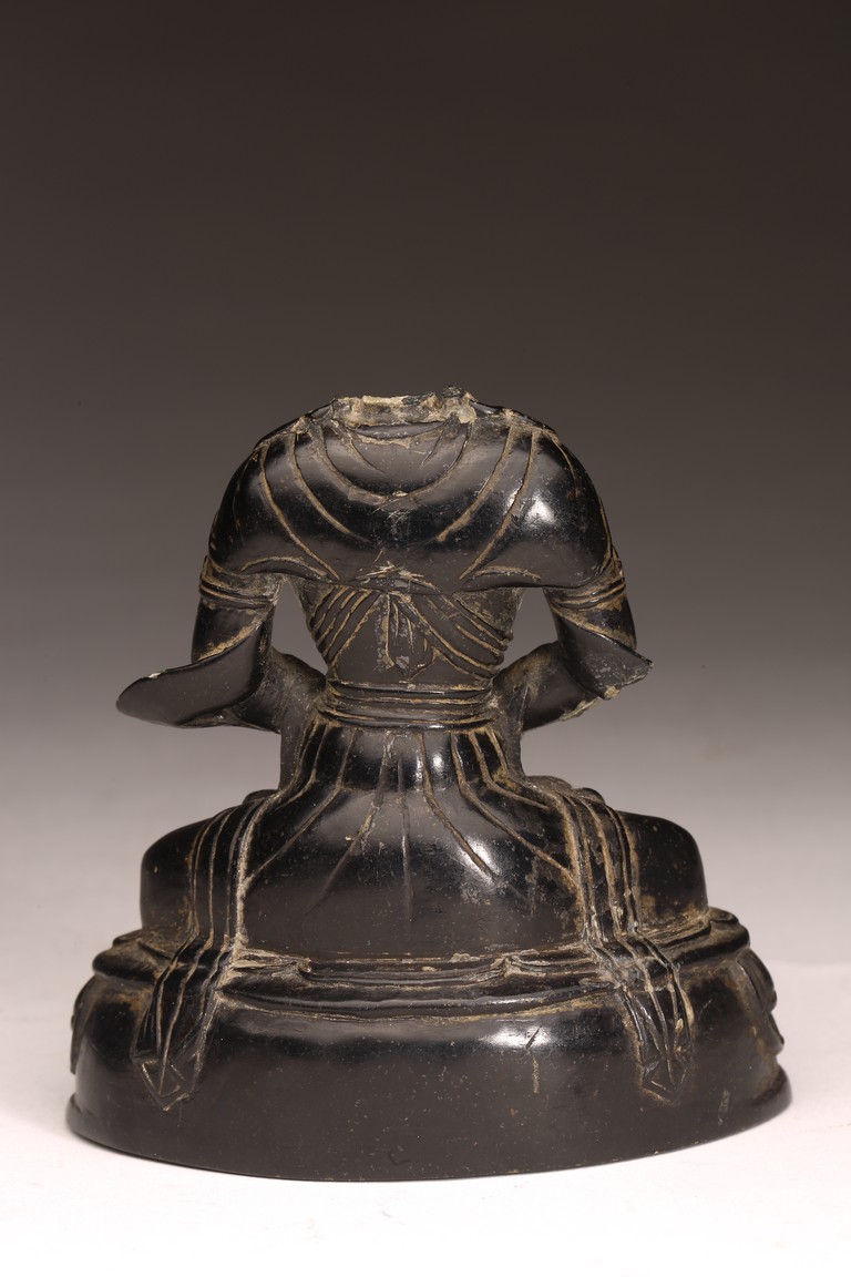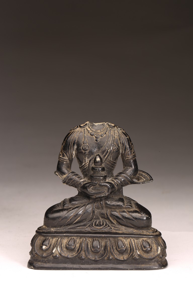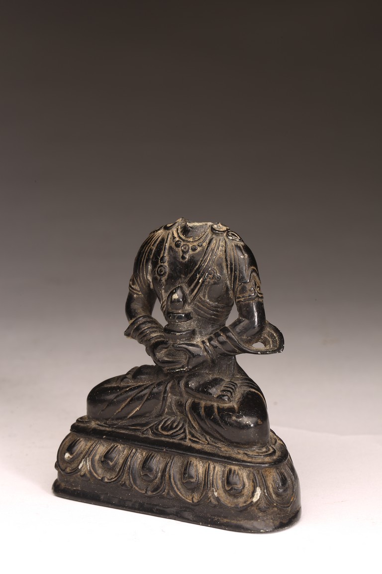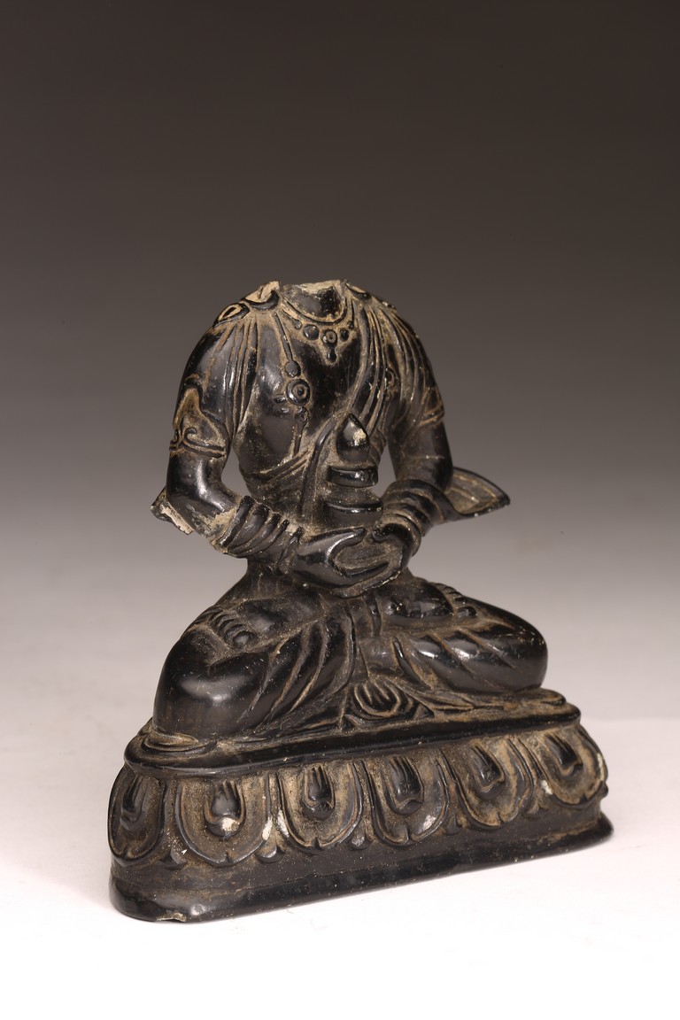 The black polished stone carving depicts a seated bodhisattva on double lotus throne with both hands placed in front of chest holding a vase, missing head.