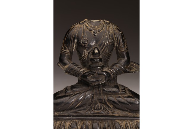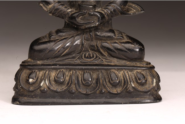 以小葉石雕制成,其木色漆黑,質理堅實細密,無量壽佛頭部缺失,雙肩寬厚,腰部收束, 身軀渾厚敦實。衣紋流暢自然,結跏端坐于雙層束腰蓮花寶座上,雙手置臍下結定印,手心 托長壽寶瓶。蓮花座造型規範,細長飽滿,工藝精細。