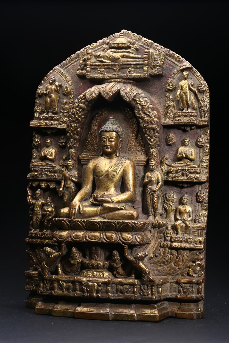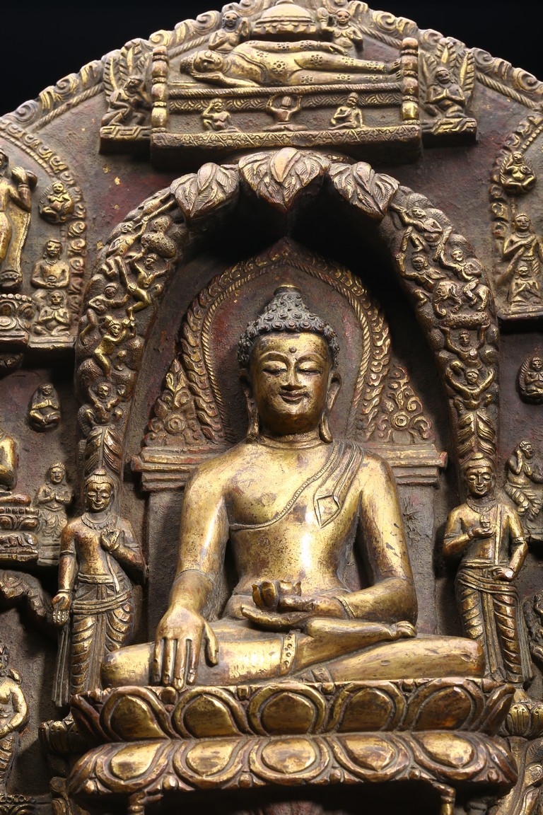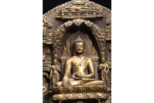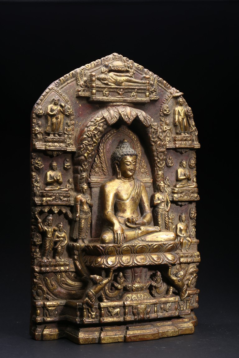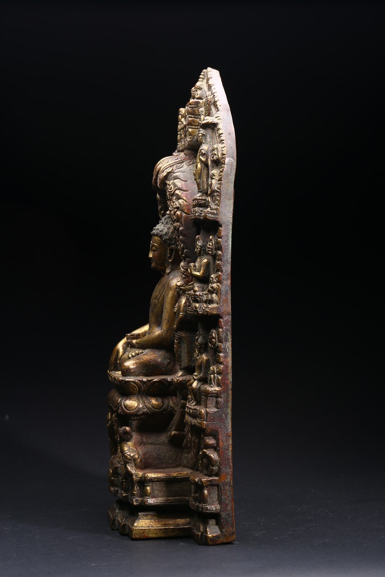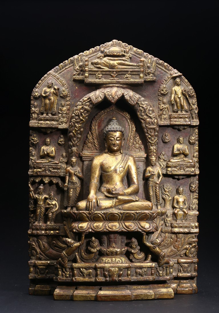 主尊為釋迦摩尼,侍從跟隨其左右,左右為六菩薩,頭頂部為“釋迦摩尼涅槃重生像”。釋 迦摩尼肉髻高聳,寶珠頂嚴,頭飾螺發,排列整齊,眉如初月,雙目沉靜似水,雙唇飽滿, 嘴角微揚,流露出無限智慧和寬廣的慈悲。眉間飾白毫,左手置於腹前結禪定印;右手下垂 結觸地印,表現的是釋迦牟尼佛在菩提樹下戰勝魔軍,大徹大悟、圓滿成佛的重要時刻。雙 腿跌伽安坐雙層蓮座之上,蓮瓣肥厚寬大,左右供養人手托高舉蓮瓣。整器題材特殊,甚為 罕見,鎏金飽滿,色澤沉靜,華麗精美,具有神秘的宗教靈性和加持法力。 來源: 洛杉磯資深私人藏家舊藏