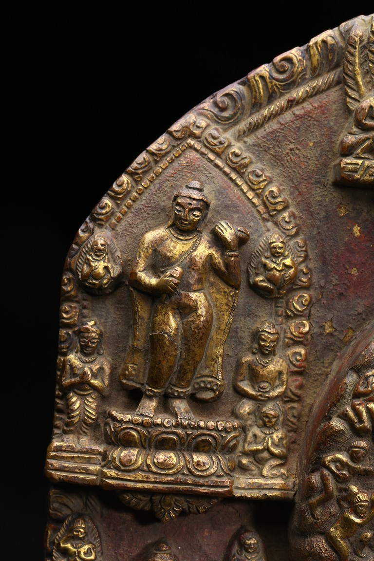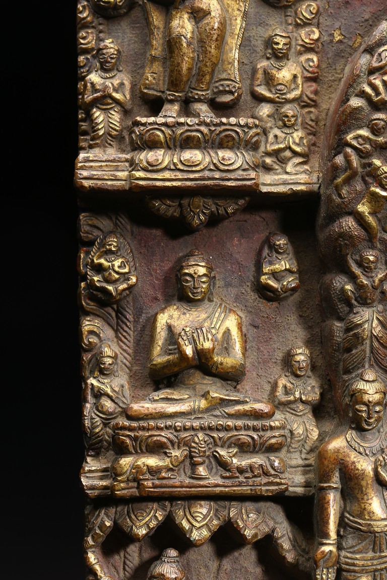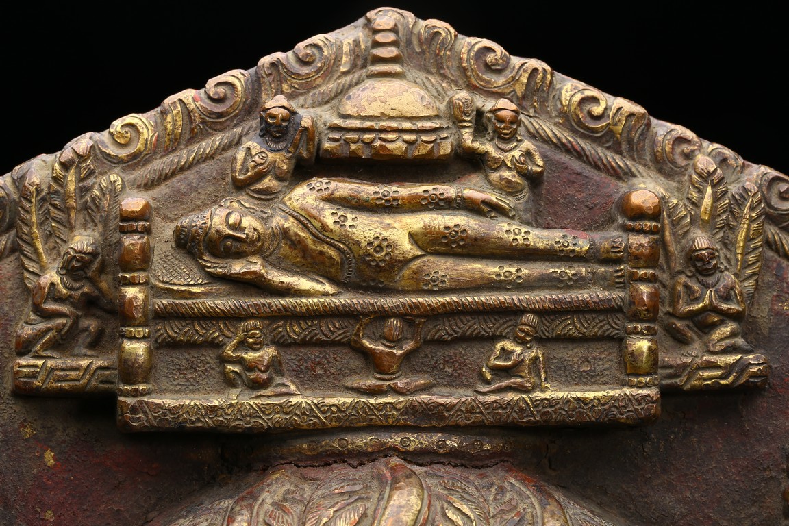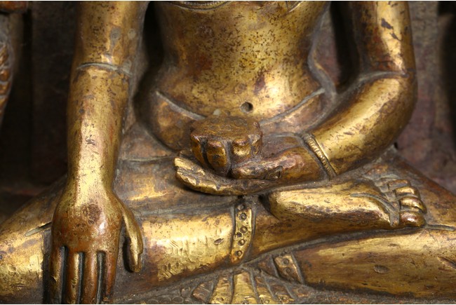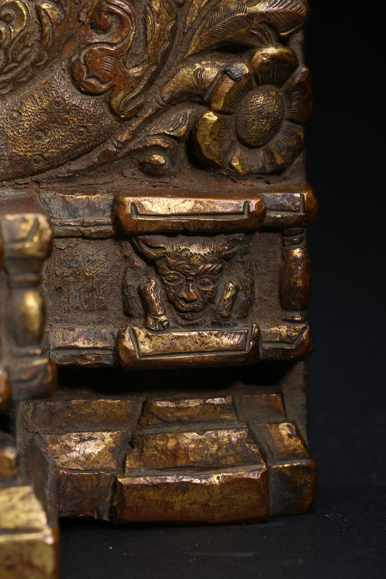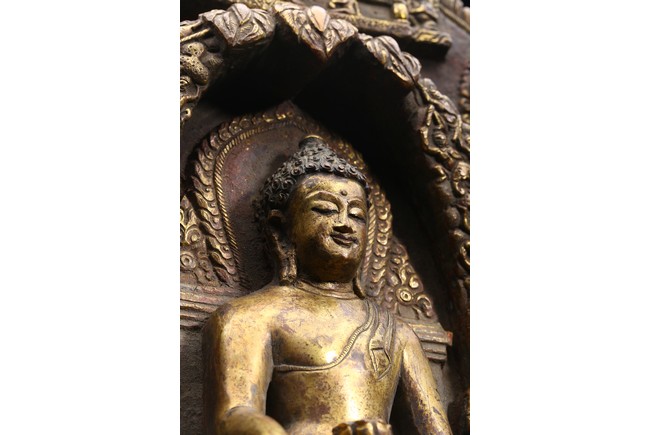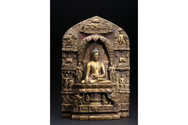 主尊為釋迦摩尼,侍從跟隨其左右,左右為六菩薩,頭頂部為“釋迦摩尼涅槃重生像”。釋 迦摩尼肉髻高聳,寶珠頂嚴,頭飾螺發,排列整齊,眉如初月,雙目沉靜似水,雙唇飽滿, 嘴角微揚,流露出無限智慧和寬廣的慈悲。眉間飾白毫,左手置於腹前結禪定印;右手下垂 結觸地印,表現的是釋迦牟尼佛在菩提樹下戰勝魔軍,大徹大悟、圓滿成佛的重要時刻。雙 腿跌伽安坐雙層蓮座之上,蓮瓣肥厚寬大,左右供養人手托高舉蓮瓣。整器題材特殊,甚為 罕見,鎏金飽滿,色澤沉靜,華麗精美,具有神秘的宗教靈性和加持法力。 來源: 洛杉磯資深私人藏家舊藏