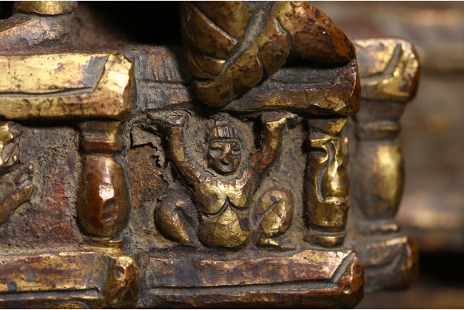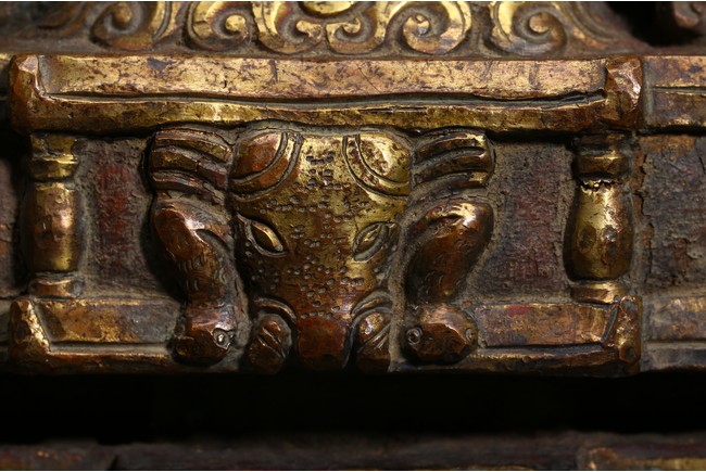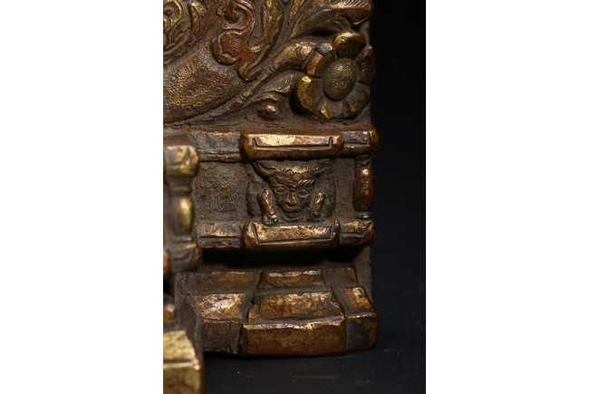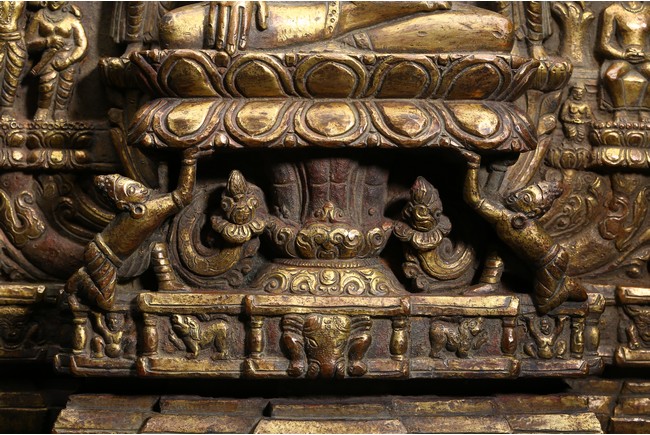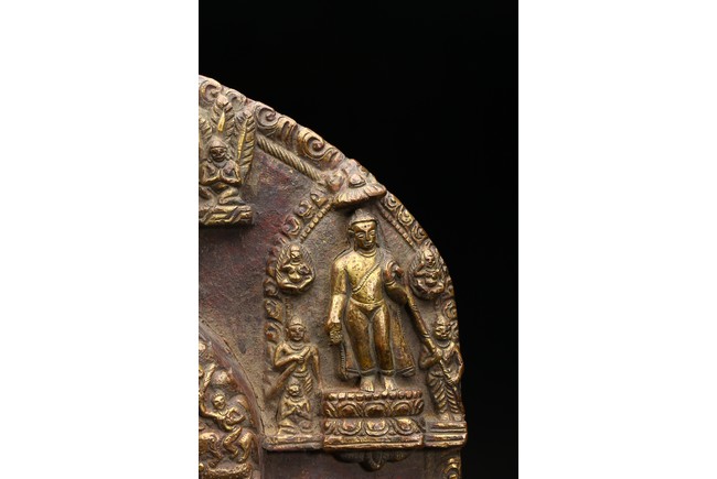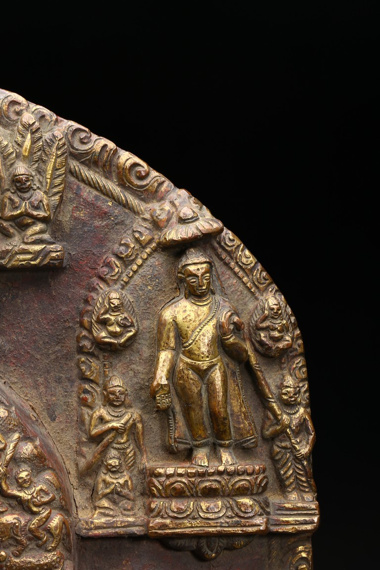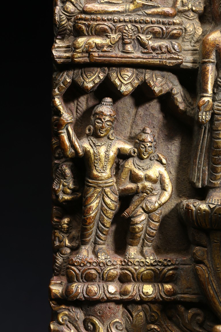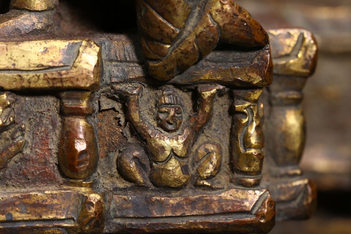 主尊為釋迦摩尼,侍從跟隨其左右,左右為六菩薩,頭頂部為“釋迦摩尼涅槃重生像”。釋 迦摩尼肉髻高聳,寶珠頂嚴,頭飾螺發,排列整齊,眉如初月,雙目沉靜似水,雙唇飽滿, 嘴角微揚,流露出無限智慧和寬廣的慈悲。眉間飾白毫,左手置於腹前結禪定印;右手下垂 結觸地印,表現的是釋迦牟尼佛在菩提樹下戰勝魔軍,大徹大悟、圓滿成佛的重要時刻。雙 腿跌伽安坐雙層蓮座之上,蓮瓣肥厚寬大,左右供養人手托高舉蓮瓣。整器題材特殊,甚為 罕見,鎏金飽滿,色澤沉靜,華麗精美,具有神秘的宗教靈性和加持法力。 來源: 洛杉磯資深私人藏家舊藏