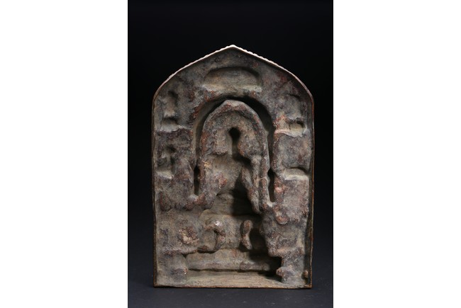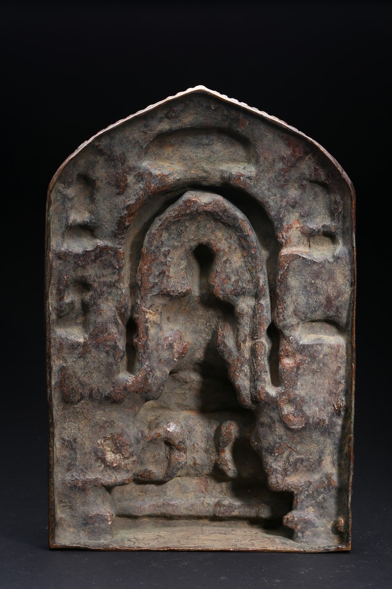 Depicting the seated shakyamuni upon double lotus throne beneath a canopy, flanked by a pair of standing Buddhas at his sides, further cast with various bodhisattva on both sides and above.