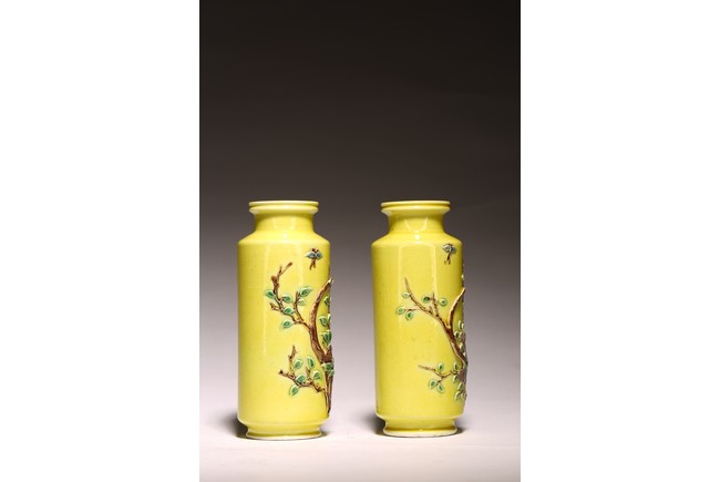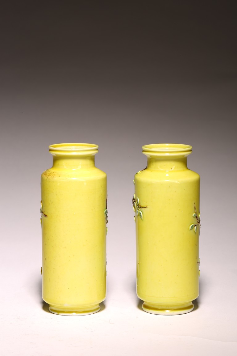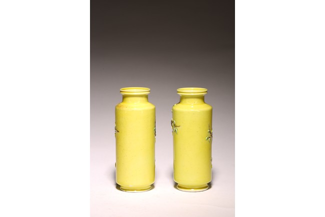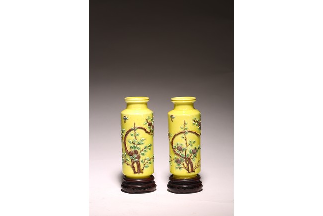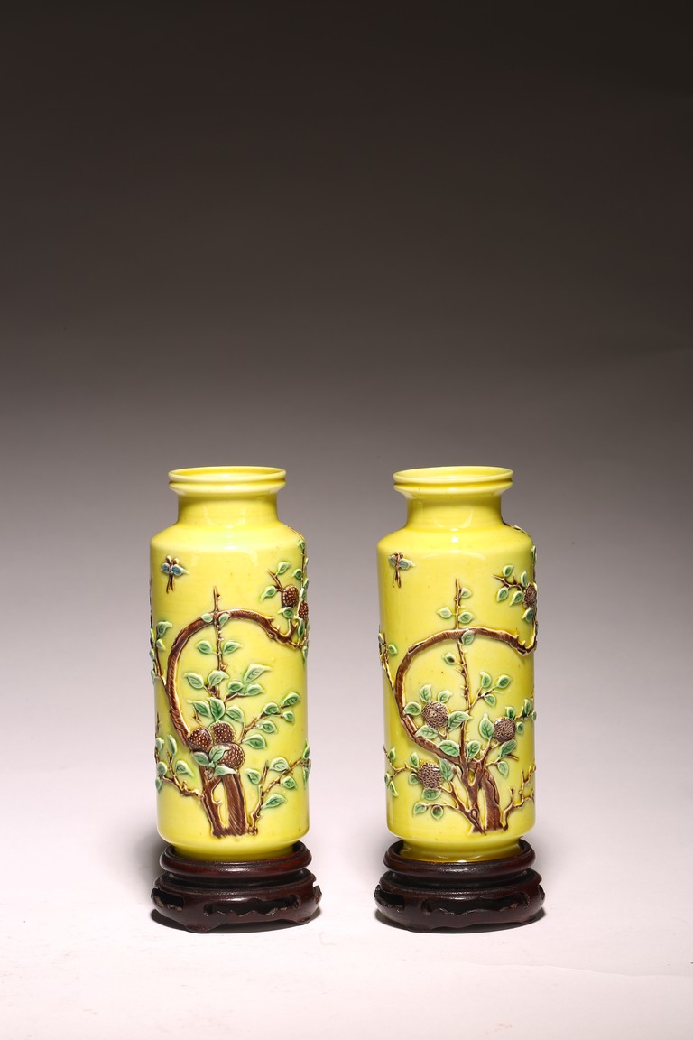 直頸,直腹,圈足。以嬌黃釉爲地,純淨嬌嫩,晶瑩剔透。雕塑繪“花蝶紋”, 紋樣清晰,立體生動,配木質底座,成對保存。