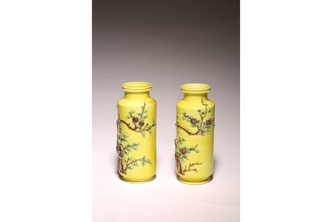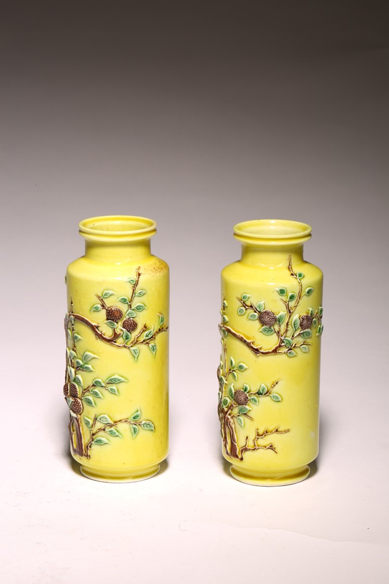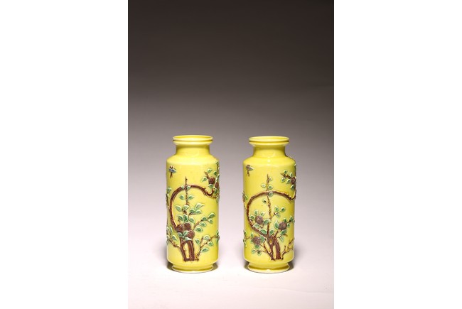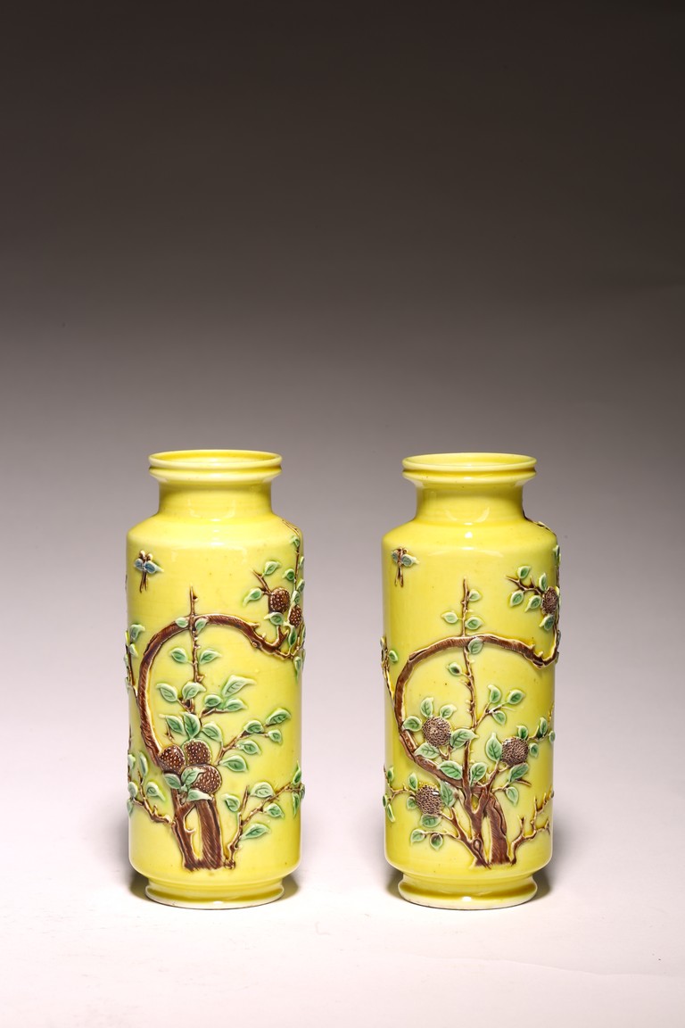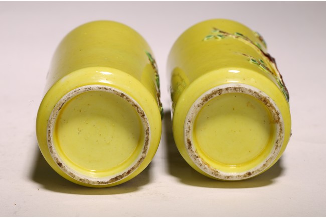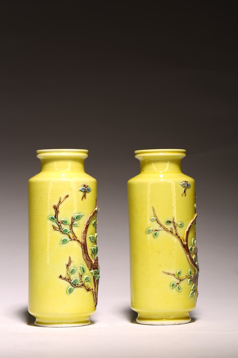 直頸,直腹,圈足。以嬌黃釉爲地,純淨嬌嫩,晶瑩剔透。雕塑繪“花蝶紋”, 紋樣清晰,立體生動,配木質底座,成對保存。