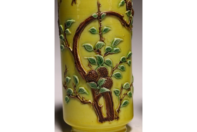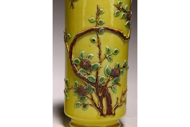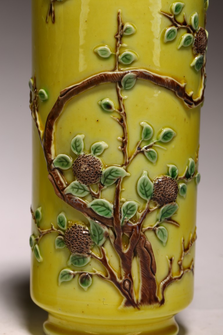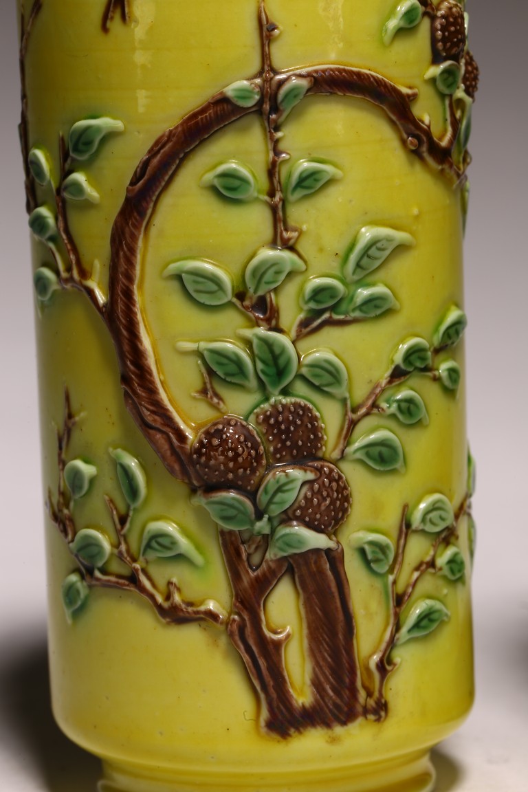 Qing Dynasty period. Of cylindrical form, the body carved in relief with leafy fruit branches extending upward in sancai against yellow ground.