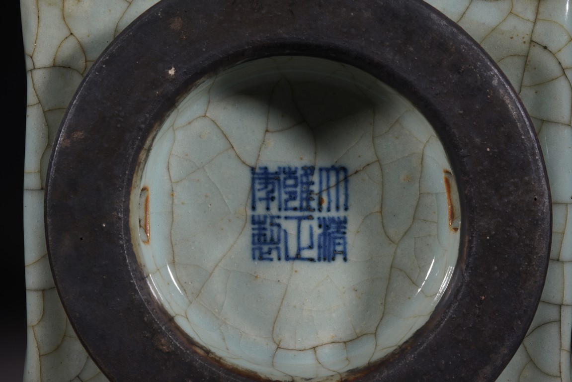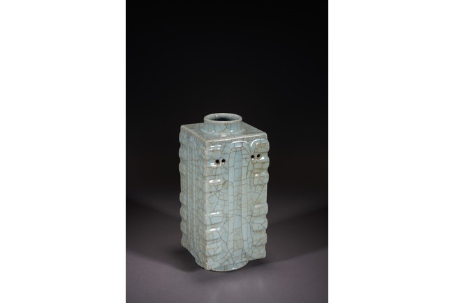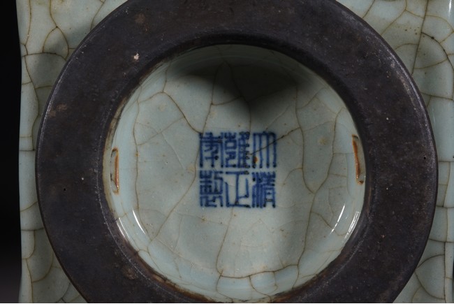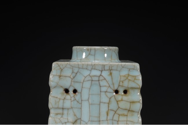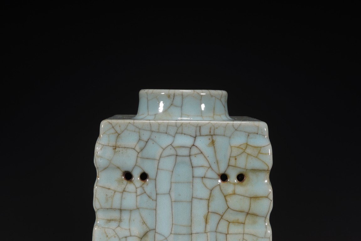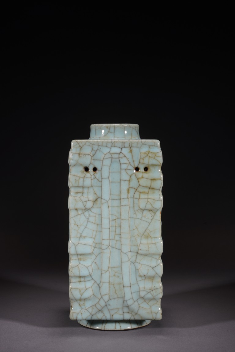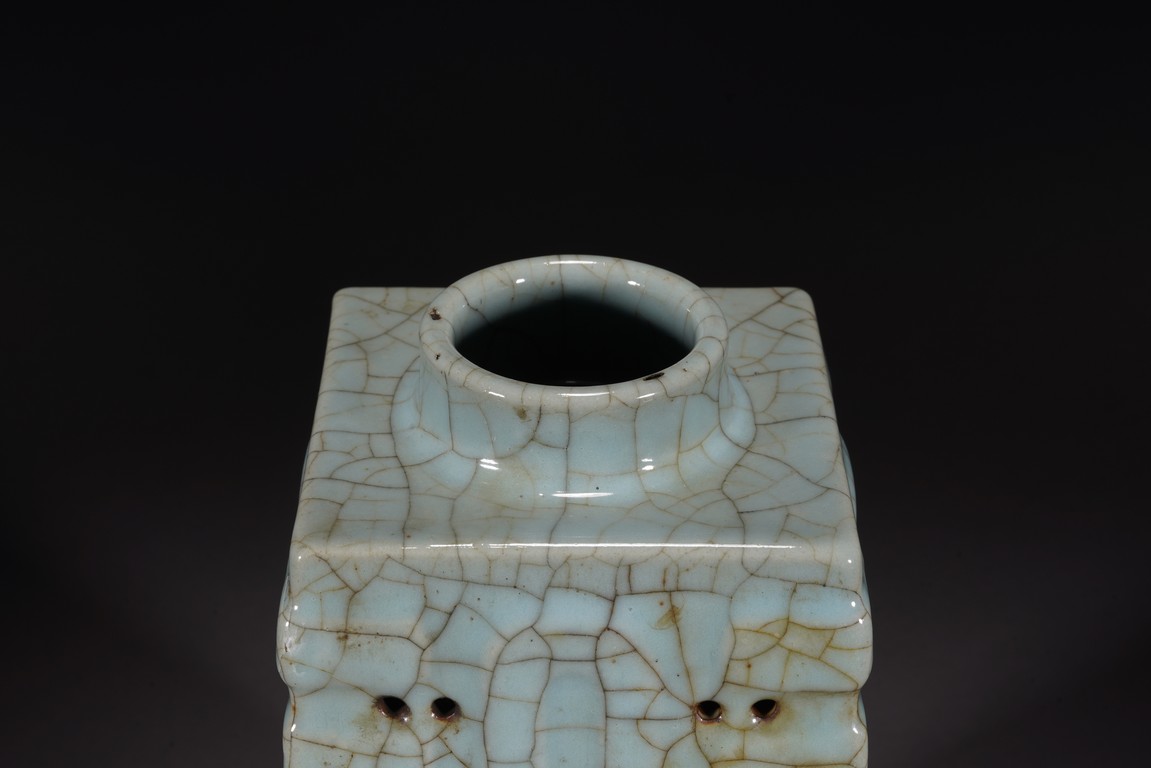 琮式瓶最早出現于南宋,仿自上古玉琮造型。清朝盛行摹古之風,雍正一朝瓷藝精進, 禦窯廠集曆代名品之大成,所出之仿古顔色釉,斑斓多彩,成就空前絕後,奠定了雍正禦瓷 無與倫比的藝術地位,這一切是與胤禛的喜好情趣密切有關,其對宋器的鍾情源于獨特的傳 統文人情懷,以宋人審美爲自身品味追求的典範。 本品圓口,方身,直腹,圈足。釉質堅致細膩,釉色肥腴瑩潤,開片分明,釉面金絲鐵線 縱橫交錯,紋線變幻莫測,以自然天成的開片釉裝飾,極具古樸凝重的美感,口部釉薄處微 呈褐黃色,足際刷鐵黑色釉,乃仿宋哥窯“紫口鐵足”的特征。瓶身一側上方有兩組對稱的 象鼻穿眼,穿眼內緣的積釉在出窯後曾予打磨修整,以確保通暢,這兩組象鼻穿眼和圈足兩 側的方形孔洞,應爲穿綁绶帶固定之用。明高濂《遵生八箋》中記載:“故官哥古瓶,下有 二方眼者,爲穿皮條,縛于幾足,不令失損。”雖然此穿帶已無實用之處,但保留其式樣, 令人觀之頓覺古意盎然。整器古樸清麗,溫婉爾雅,置于案頭,可解思古之幽情。“大清雍 正年制”款識。