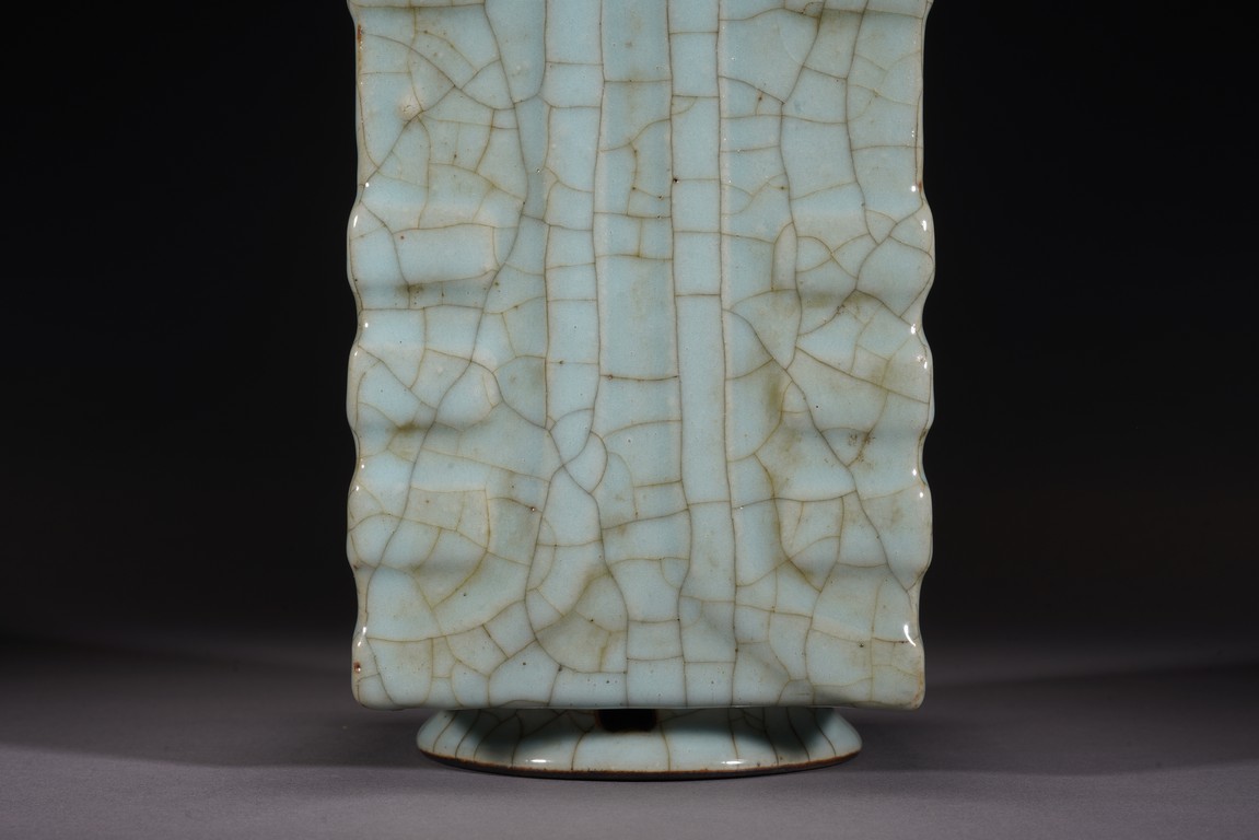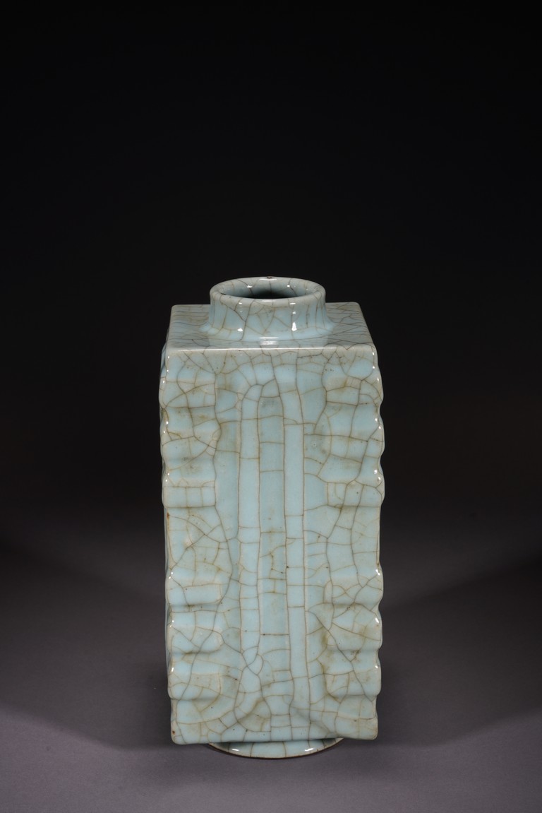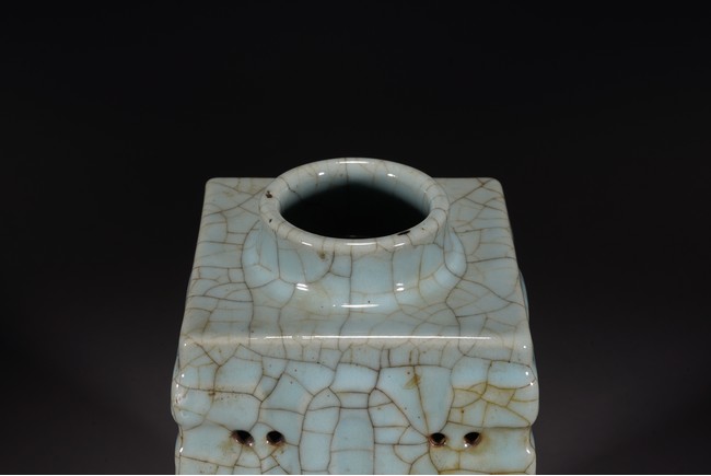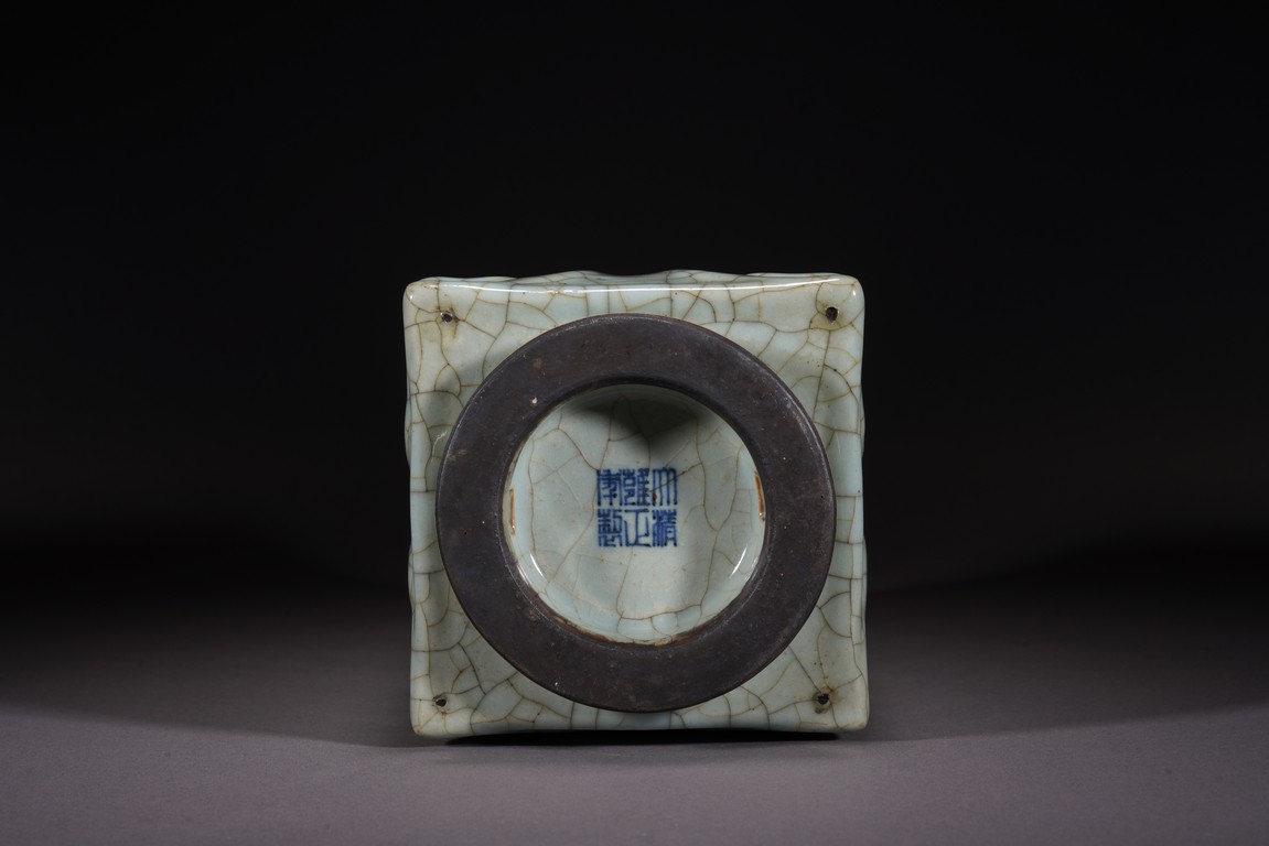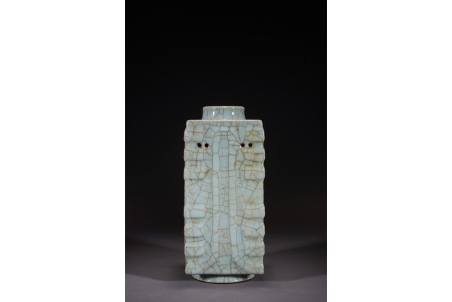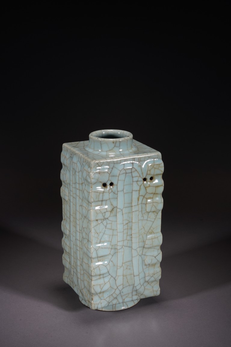 琮式瓶最早出現于南宋,仿自上古玉琮造型。清朝盛行摹古之風,雍正一朝瓷藝精進, 禦窯廠集曆代名品之大成,所出之仿古顔色釉,斑斓多彩,成就空前絕後,奠定了雍正禦瓷 無與倫比的藝術地位,這一切是與胤禛的喜好情趣密切有關,其對宋器的鍾情源于獨特的傳 統文人情懷,以宋人審美爲自身品味追求的典範。 本品圓口,方身,直腹,圈足。釉質堅致細膩,釉色肥腴瑩潤,開片分明,釉面金絲鐵線 縱橫交錯,紋線變幻莫測,以自然天成的開片釉裝飾,極具古樸凝重的美感,口部釉薄處微 呈褐黃色,足際刷鐵黑色釉,乃仿宋哥窯“紫口鐵足”的特征。瓶身一側上方有兩組對稱的 象鼻穿眼,穿眼內緣的積釉在出窯後曾予打磨修整,以確保通暢,這兩組象鼻穿眼和圈足兩 側的方形孔洞,應爲穿綁绶帶固定之用。明高濂《遵生八箋》中記載:“故官哥古瓶,下有 二方眼者,爲穿皮條,縛于幾足,不令失損。”雖然此穿帶已無實用之處,但保留其式樣, 令人觀之頓覺古意盎然。整器古樸清麗,溫婉爾雅,置于案頭,可解思古之幽情。“大清雍 正年制”款識。