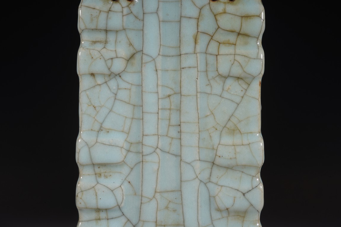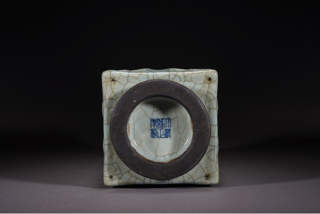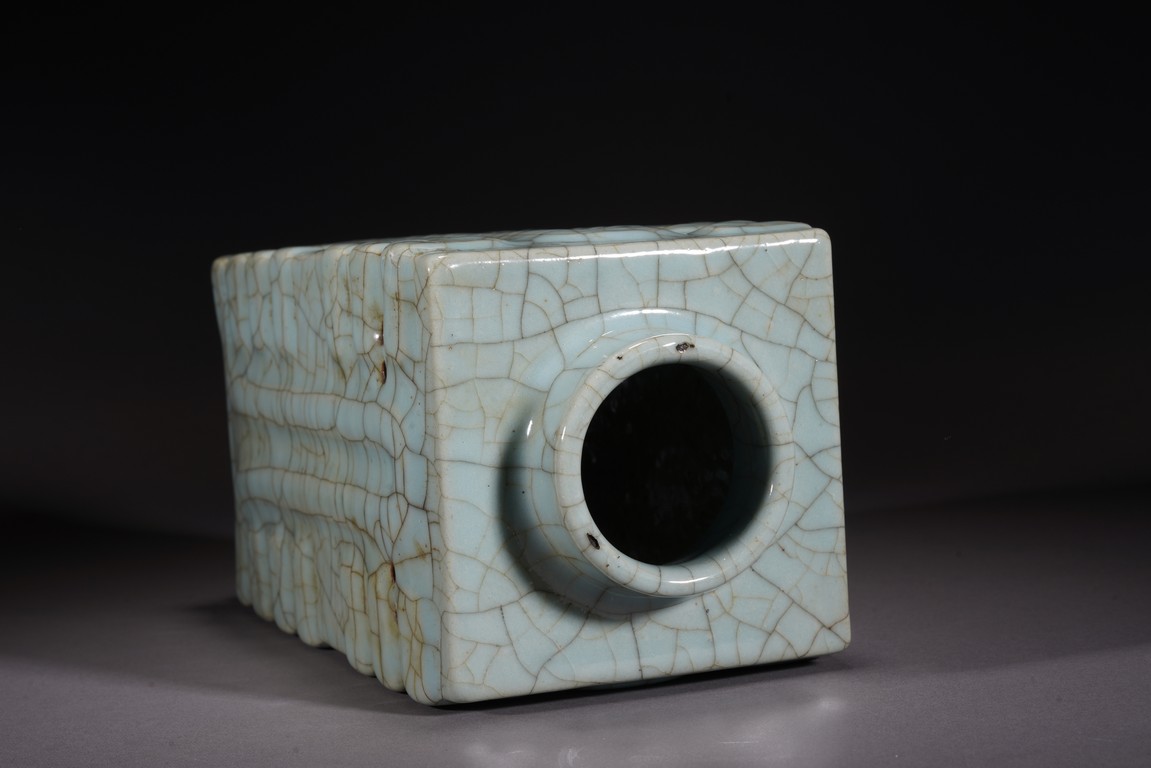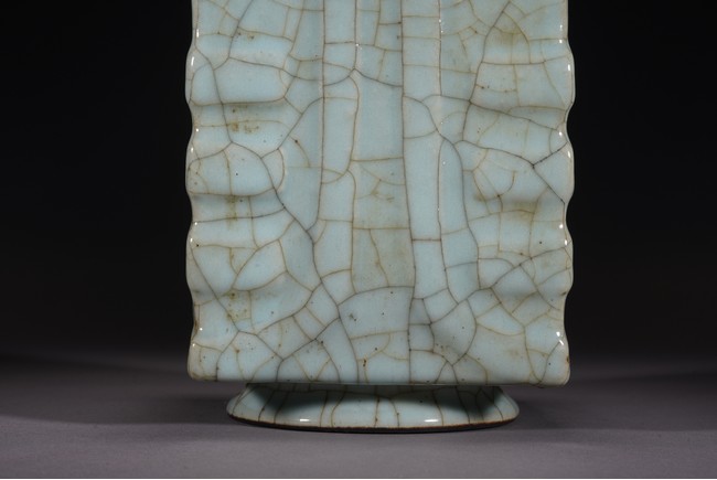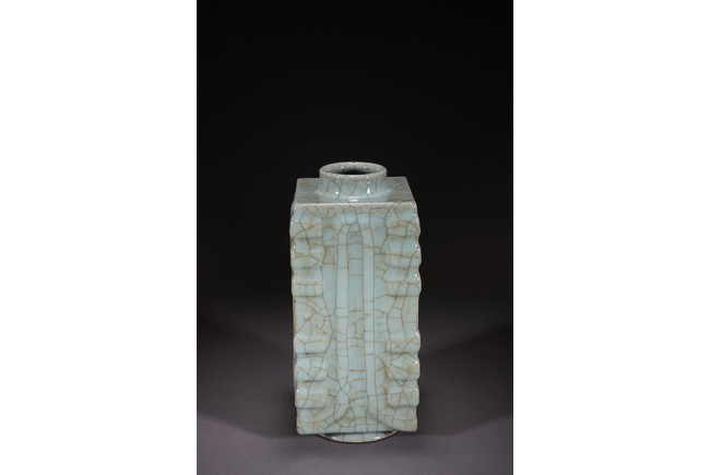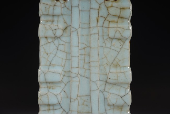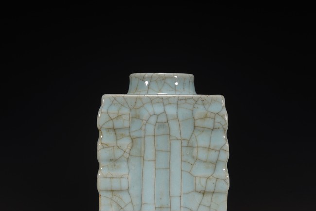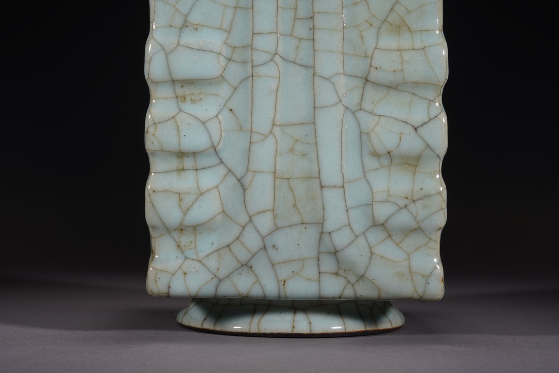 琮式瓶最早出現于南宋,仿自上古玉琮造型。清朝盛行摹古之風,雍正一朝瓷藝精進, 禦窯廠集曆代名品之大成,所出之仿古顔色釉,斑斓多彩,成就空前絕後,奠定了雍正禦瓷 無與倫比的藝術地位,這一切是與胤禛的喜好情趣密切有關,其對宋器的鍾情源于獨特的傳 統文人情懷,以宋人審美爲自身品味追求的典範。 本品圓口,方身,直腹,圈足。釉質堅致細膩,釉色肥腴瑩潤,開片分明,釉面金絲鐵線 縱橫交錯,紋線變幻莫測,以自然天成的開片釉裝飾,極具古樸凝重的美感,口部釉薄處微 呈褐黃色,足際刷鐵黑色釉,乃仿宋哥窯“紫口鐵足”的特征。瓶身一側上方有兩組對稱的 象鼻穿眼,穿眼內緣的積釉在出窯後曾予打磨修整,以確保通暢,這兩組象鼻穿眼和圈足兩 側的方形孔洞,應爲穿綁绶帶固定之用。明高濂《遵生八箋》中記載:“故官哥古瓶,下有 二方眼者,爲穿皮條,縛于幾足,不令失損。”雖然此穿帶已無實用之處,但保留其式樣, 令人觀之頓覺古意盎然。整器古樸清麗,溫婉爾雅,置于案頭,可解思古之幽情。“大清雍 正年制”款識。