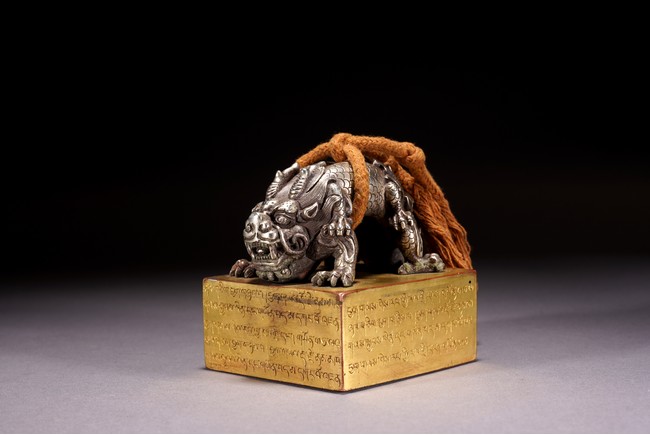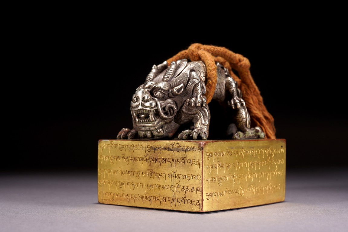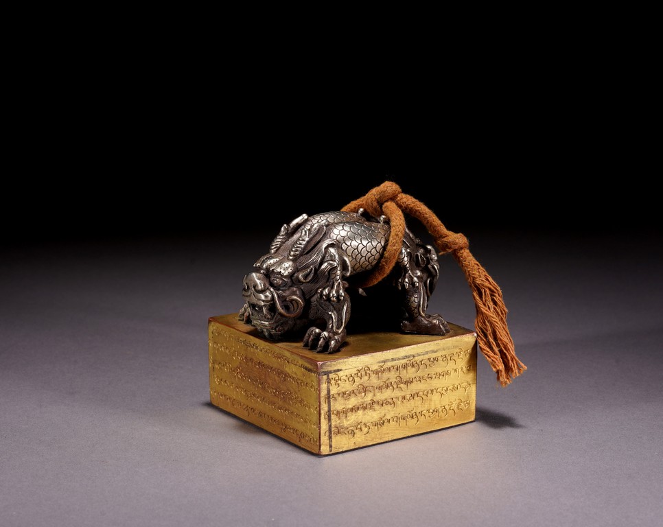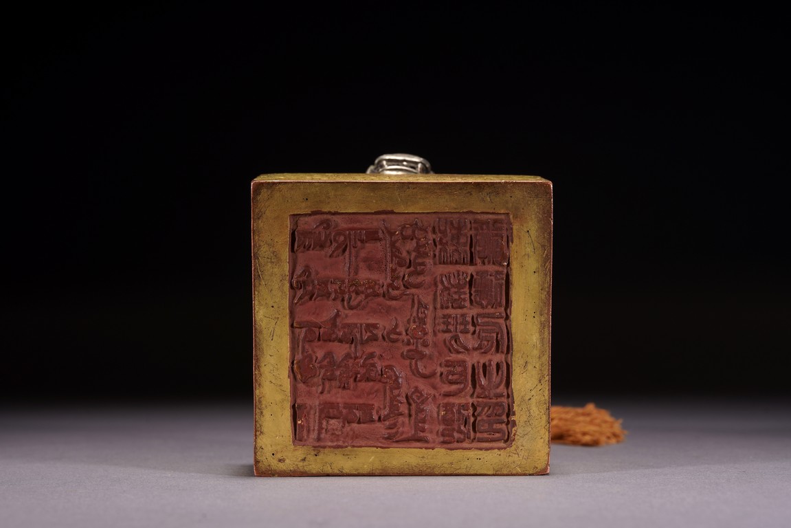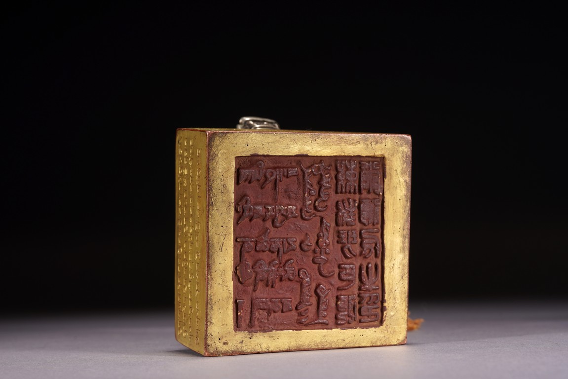 Cast in the form of a pair of seated mythical dragons as finial, the seal body incised with Tibetan inscription, the seal face cast in three distinct inscriptions.