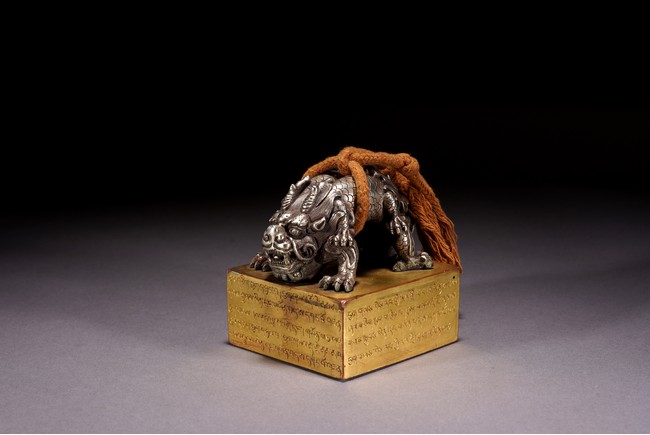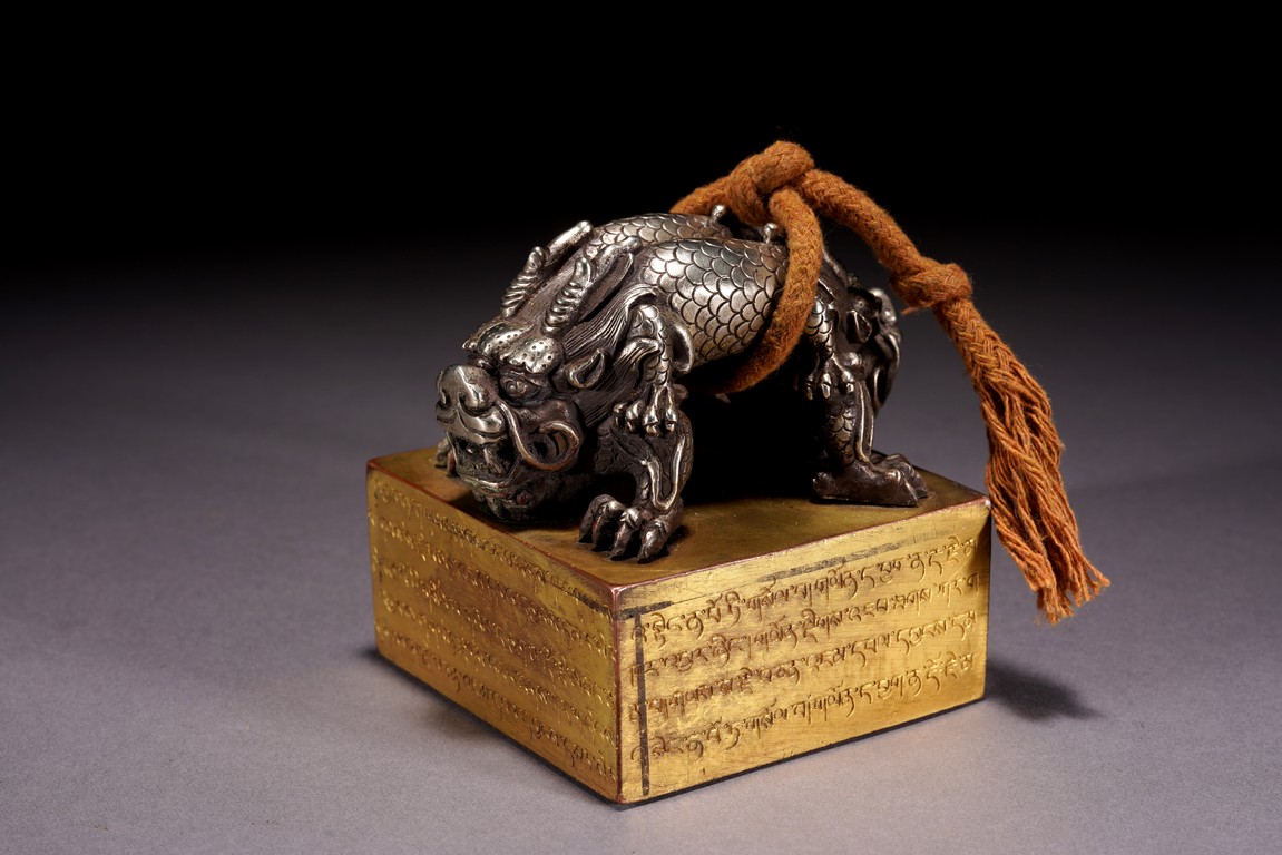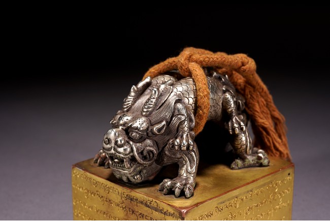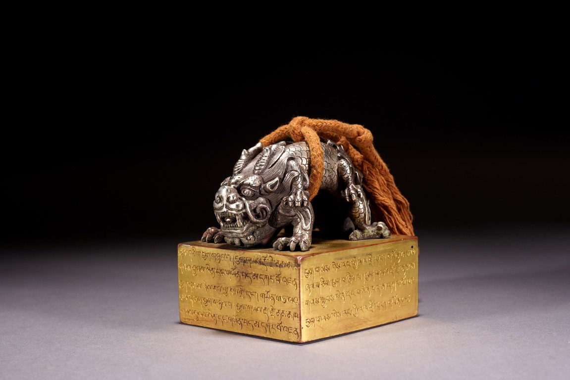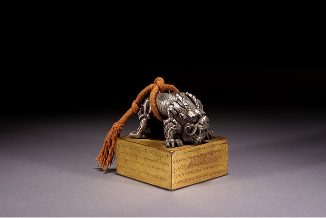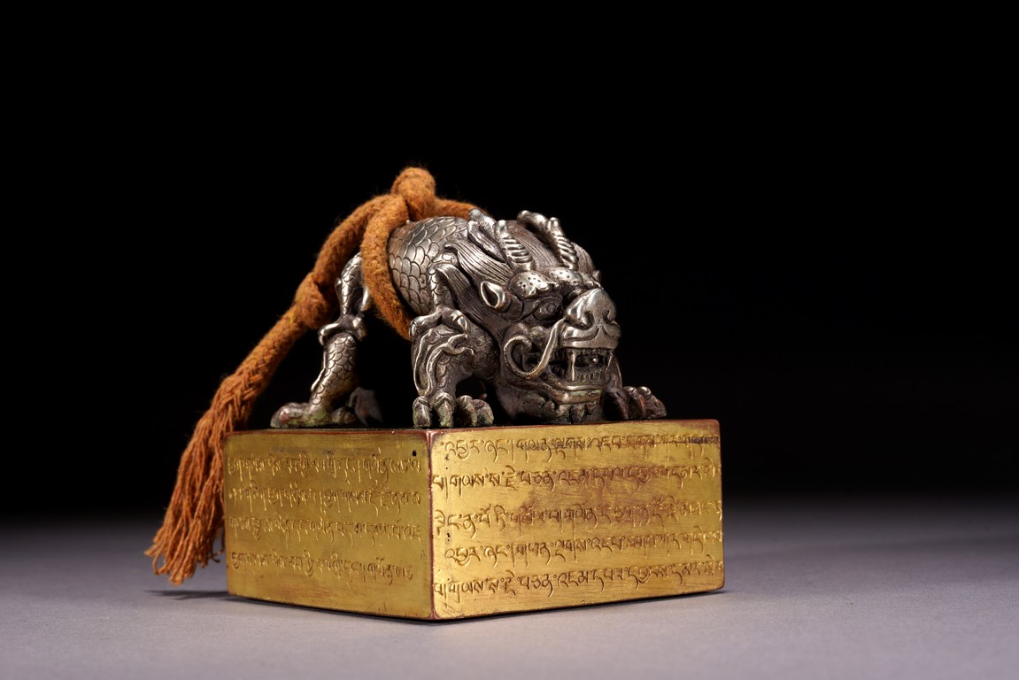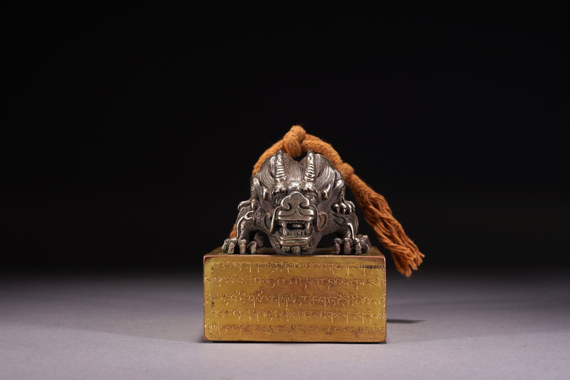 印章純銀鎏金材質,蛟龍鈕,下四方型,藏傳樣式,滿刻經文,氣度非凡。