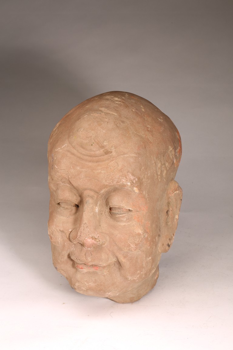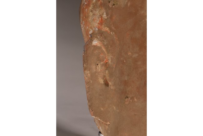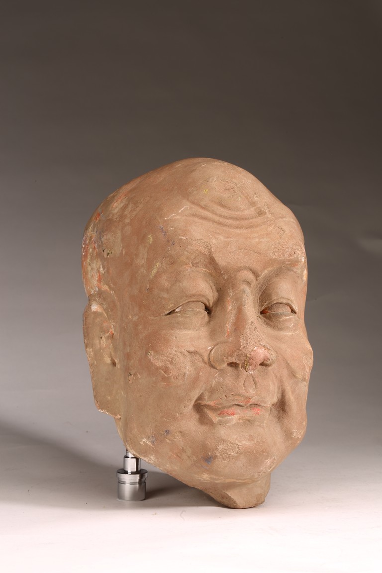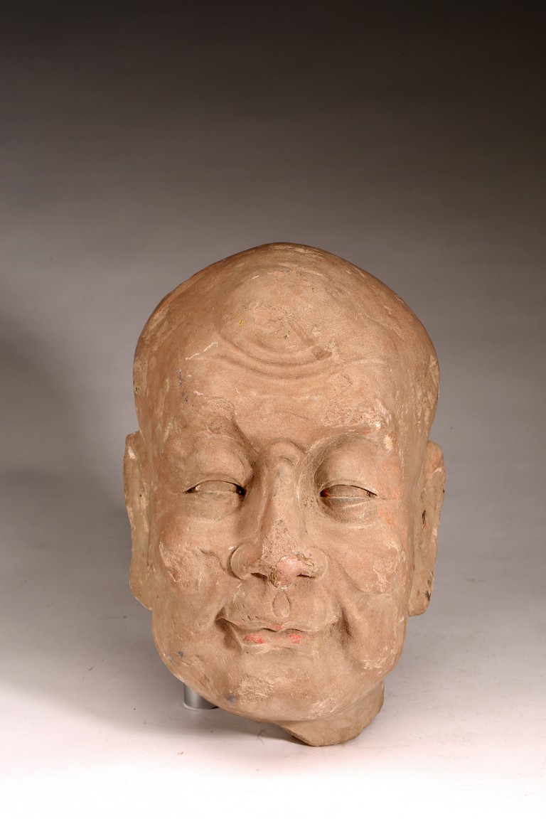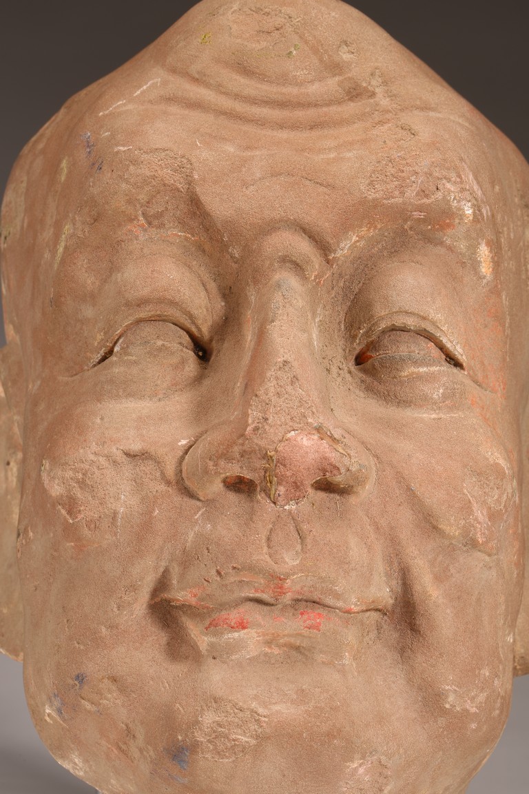 Well-carved in the round, with a serene expression, gently smiling, lips with traces of pigments, his forehead with wrinkles, head bare.