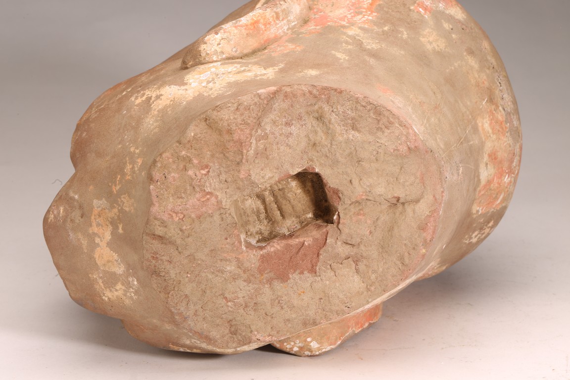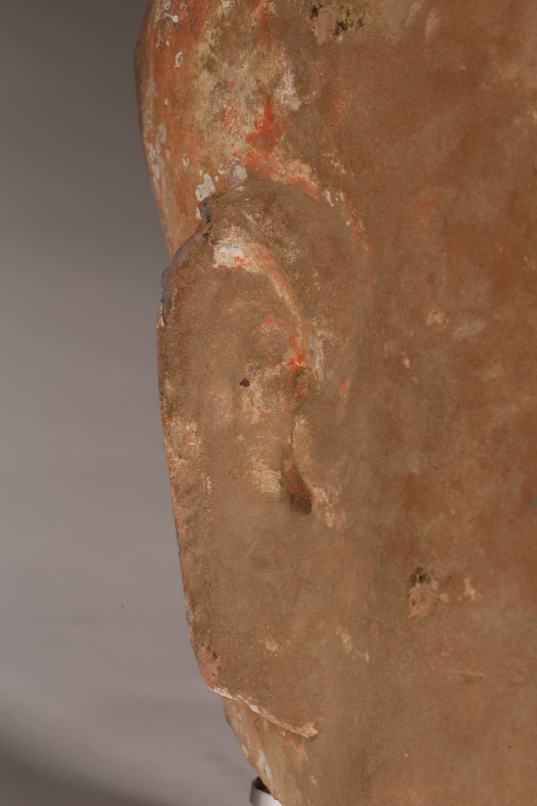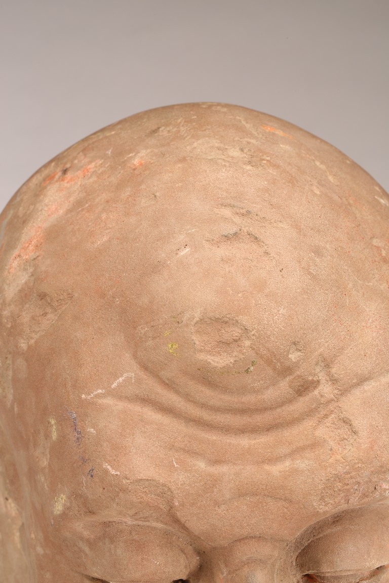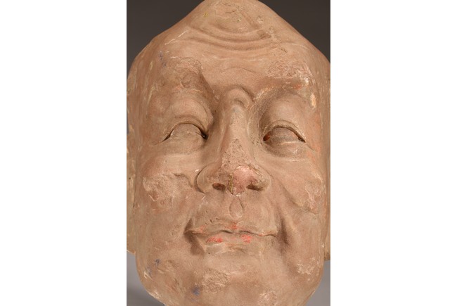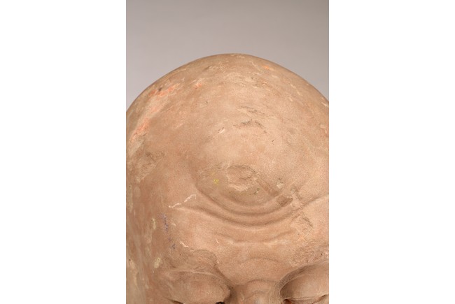 Well-carved in the round, with a serene expression, gently smiling, lips with traces of pigments, his forehead with wrinkles, head bare.