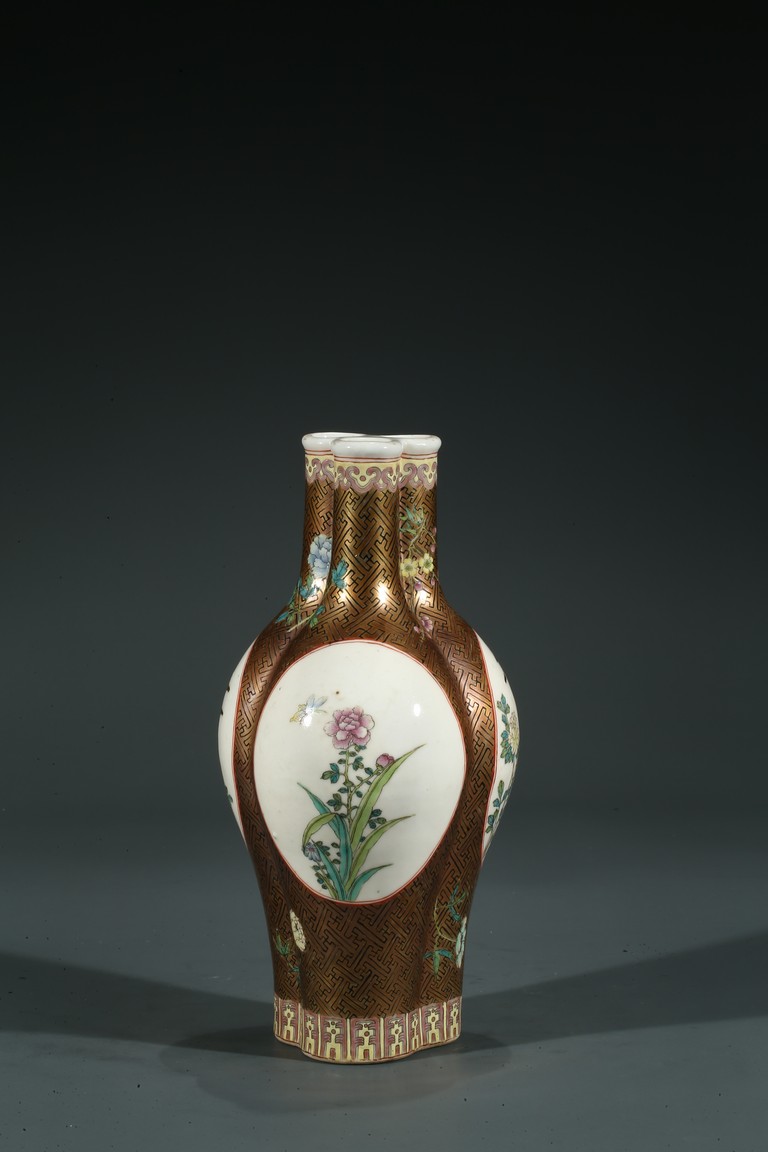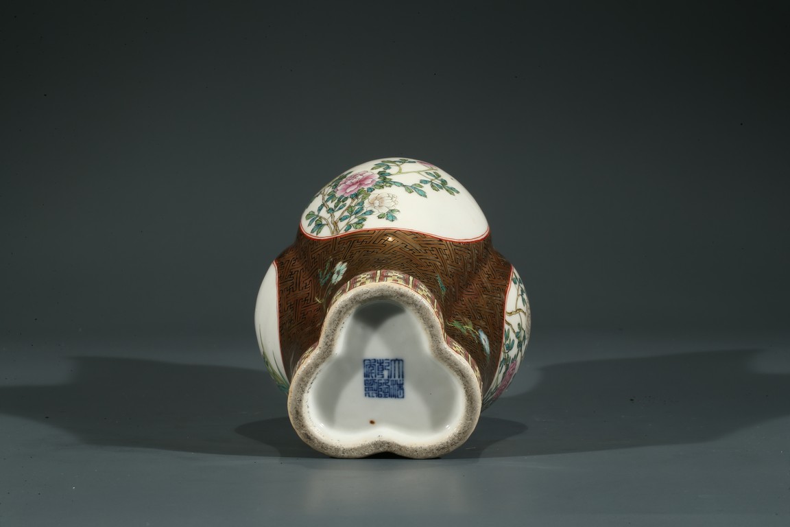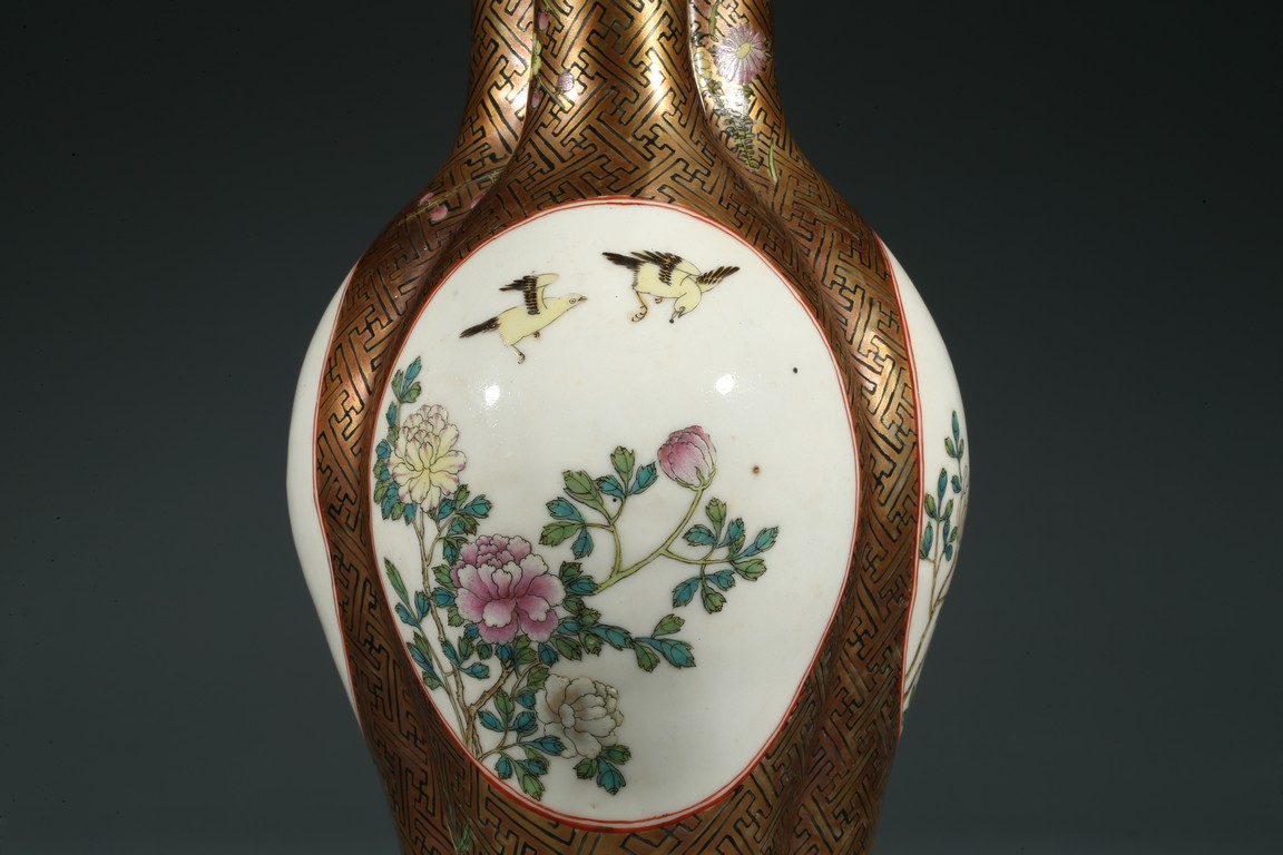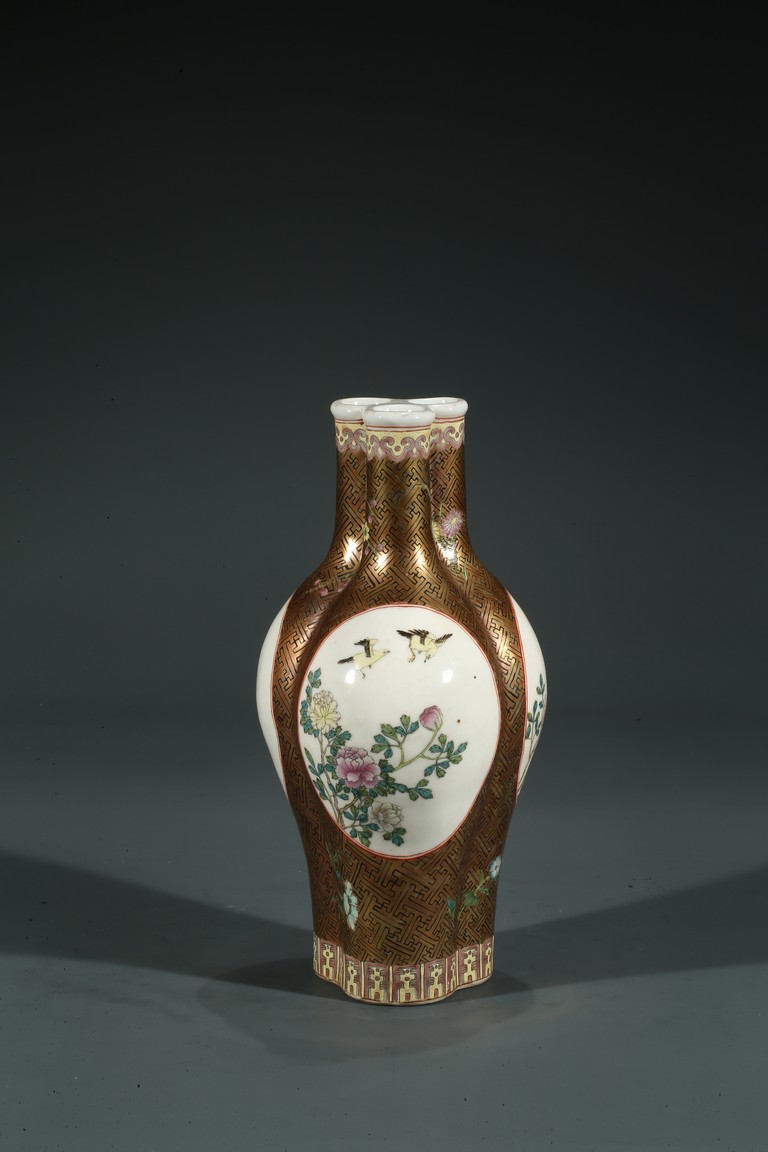 Of finely potted globular tri-lobed form, rising to three slender cylindrical necks with an everted mouth, each lobe painted with a cartouche enclosing the scene of flowers and birds, the base with six character Qianlong mark.