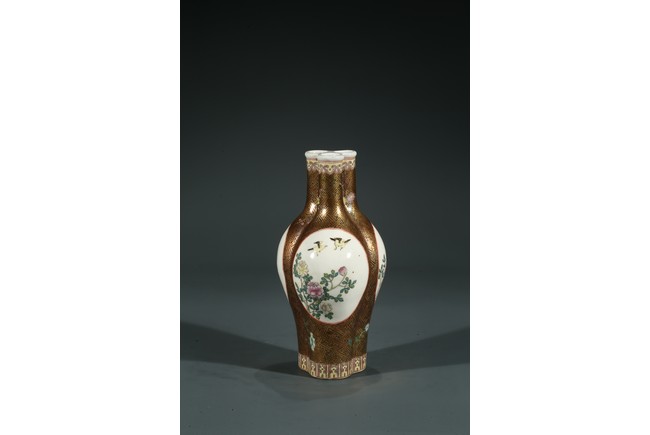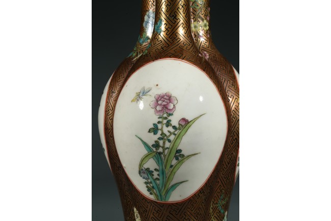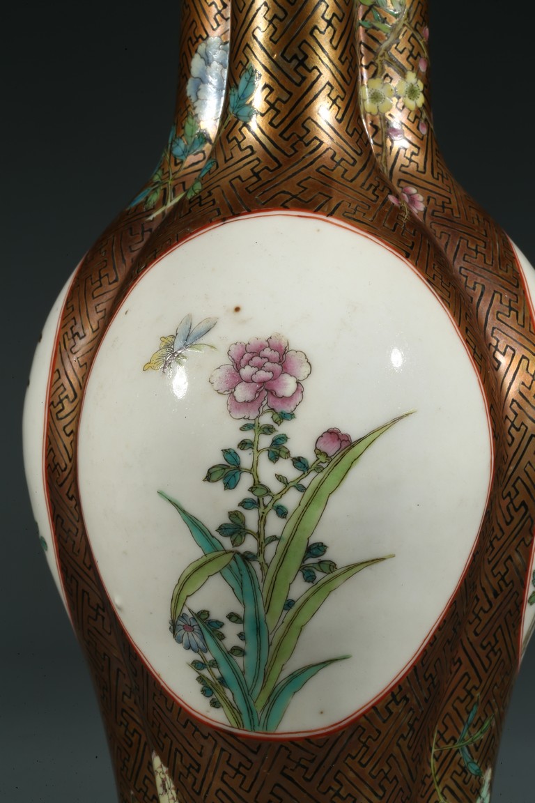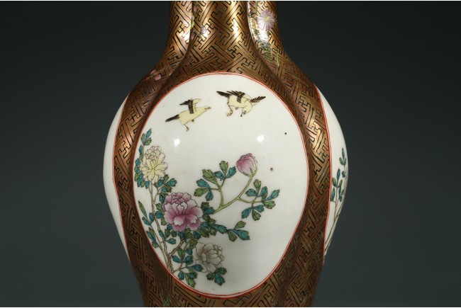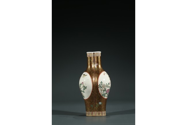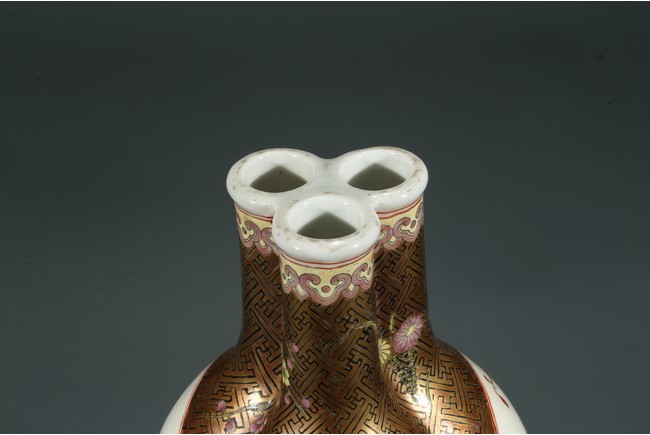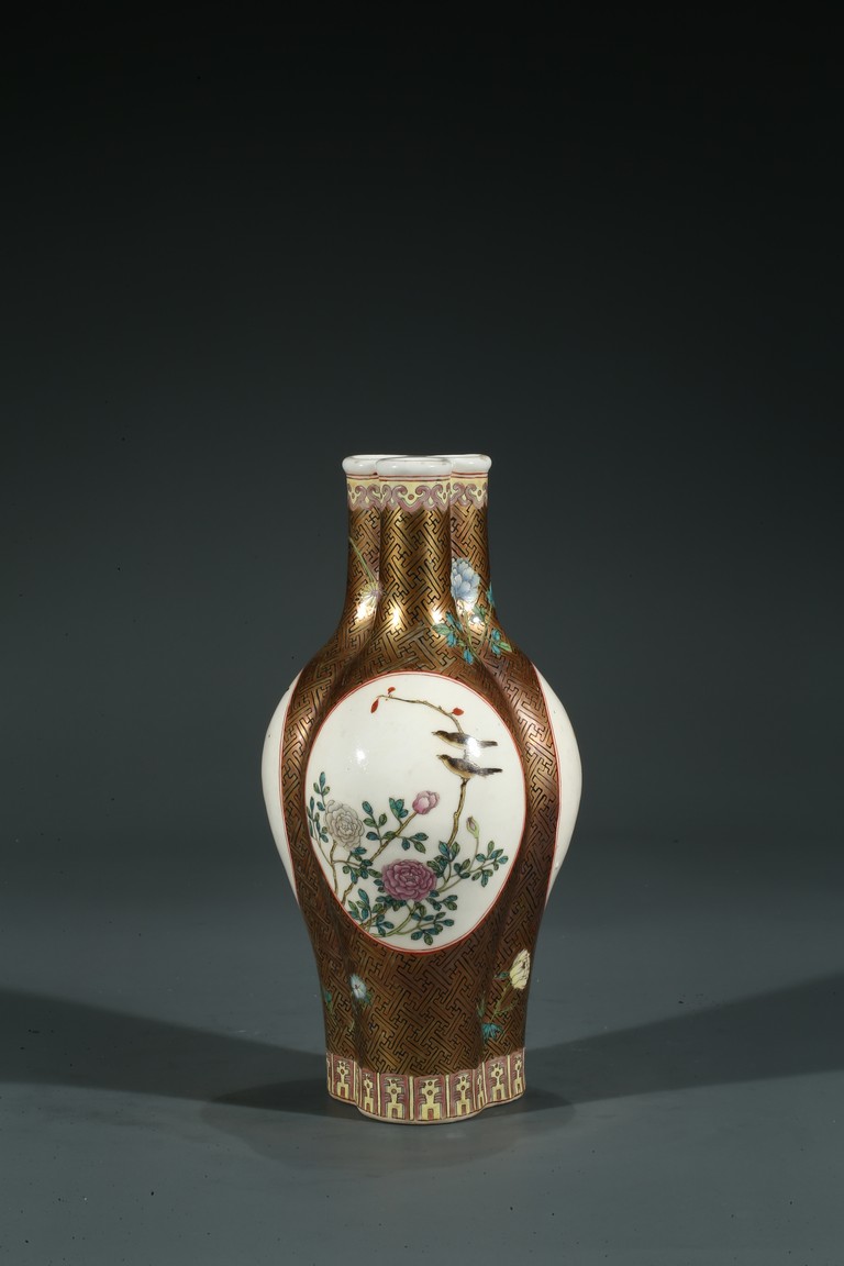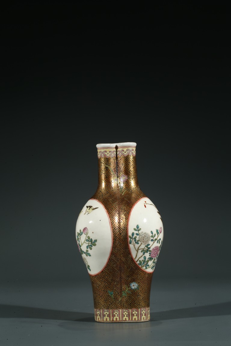 Of finely potted globular tri-lobed form, rising to three slender cylindrical necks with an everted mouth, each lobe painted with a cartouche enclosing the scene of flowers and birds, the base with six character Qianlong mark.
