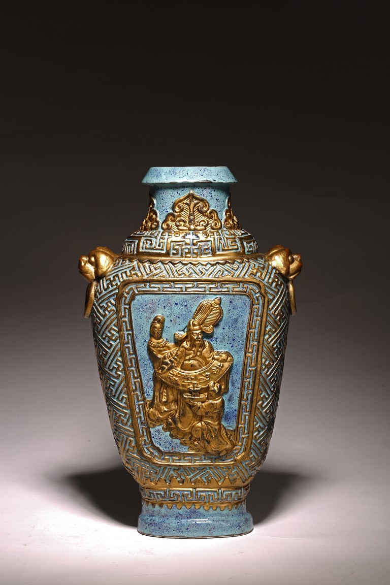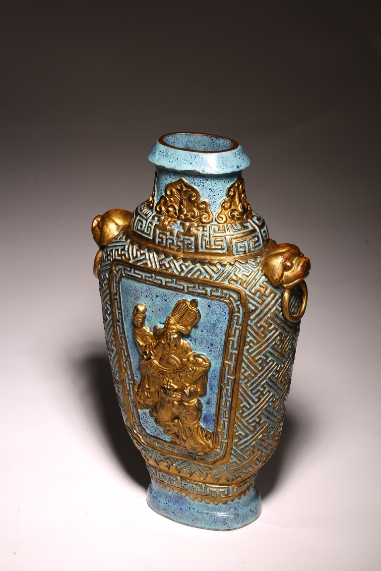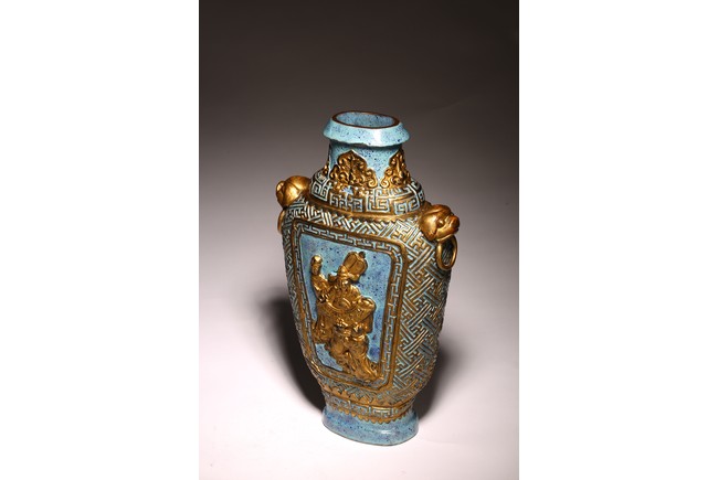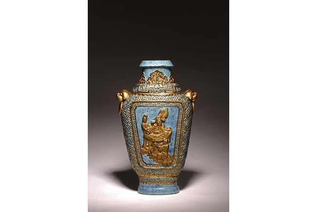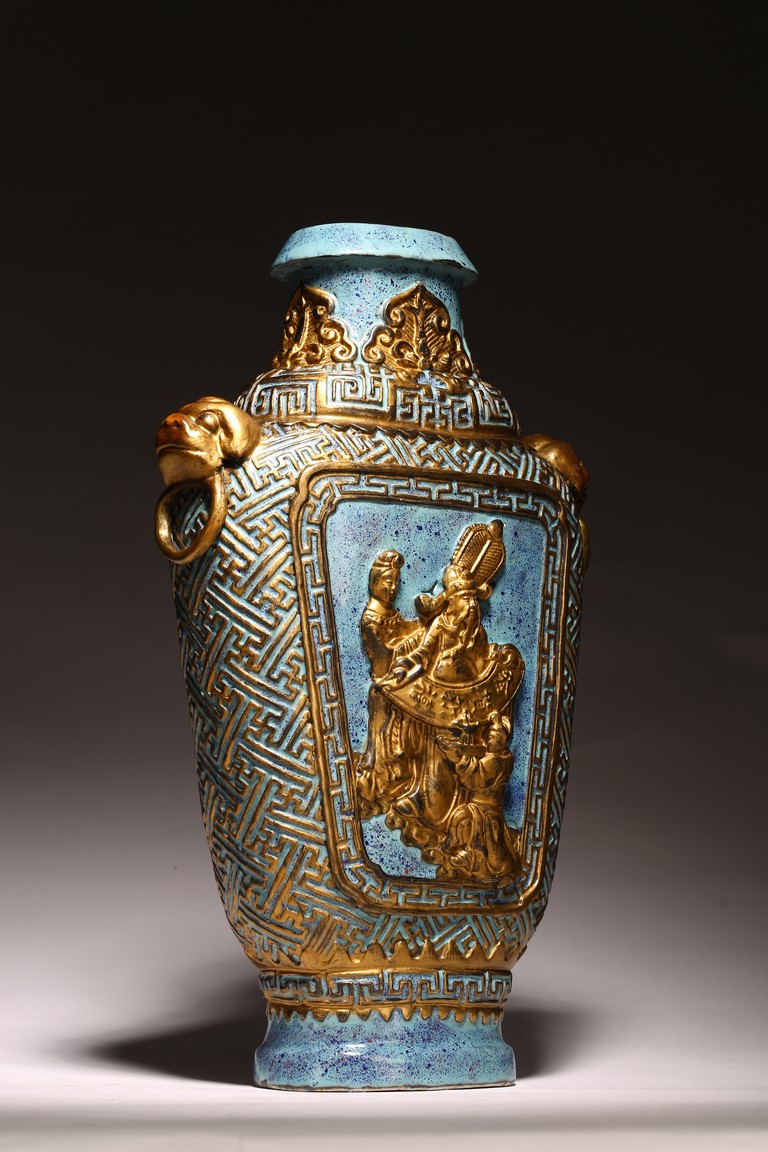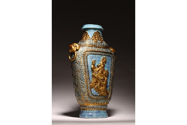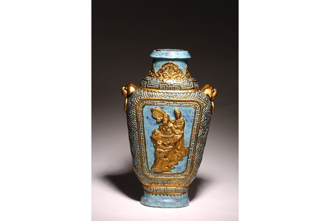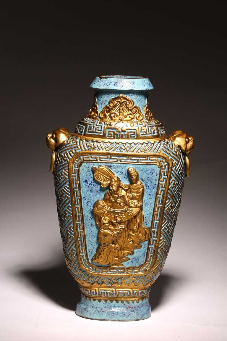 古銅彩是清 乾隆朝裝飾彩特殊品種之一,摹仿古代青銅器色 彩,故稱“古銅彩”。其制作工藝非常考究,所燒制 出青銅器鏽迹斑駁的效果,或用金彩摹繪璀璨的錯金銀紋飾,其質感色彩均于青銅 真品相若。整體力圖顛覆傳統的新意,綜合新與舊之法,即有仿古的 韻味, 又有富麗堂皇之氣。 本器以古銅釉爲地,營造出古銅繡蝕斑駁的質感,金彩繪圖紋, 華麗古雅。方口,直頸,雙獅耳,腹漸下收,高圈足。頸部繪“蕉葉 紋”“夔龍紋”,腹部以“萬字紋”爲地,中心開窗繪“人物故事圖”, 官員手持書卷,仕女手持蕉扇跟隨其後,侍從跪拜其膝前,手捧爵杯。 整器人物刻畫清晰,構圖嚴謹,工藝考究,富麗堂皇。