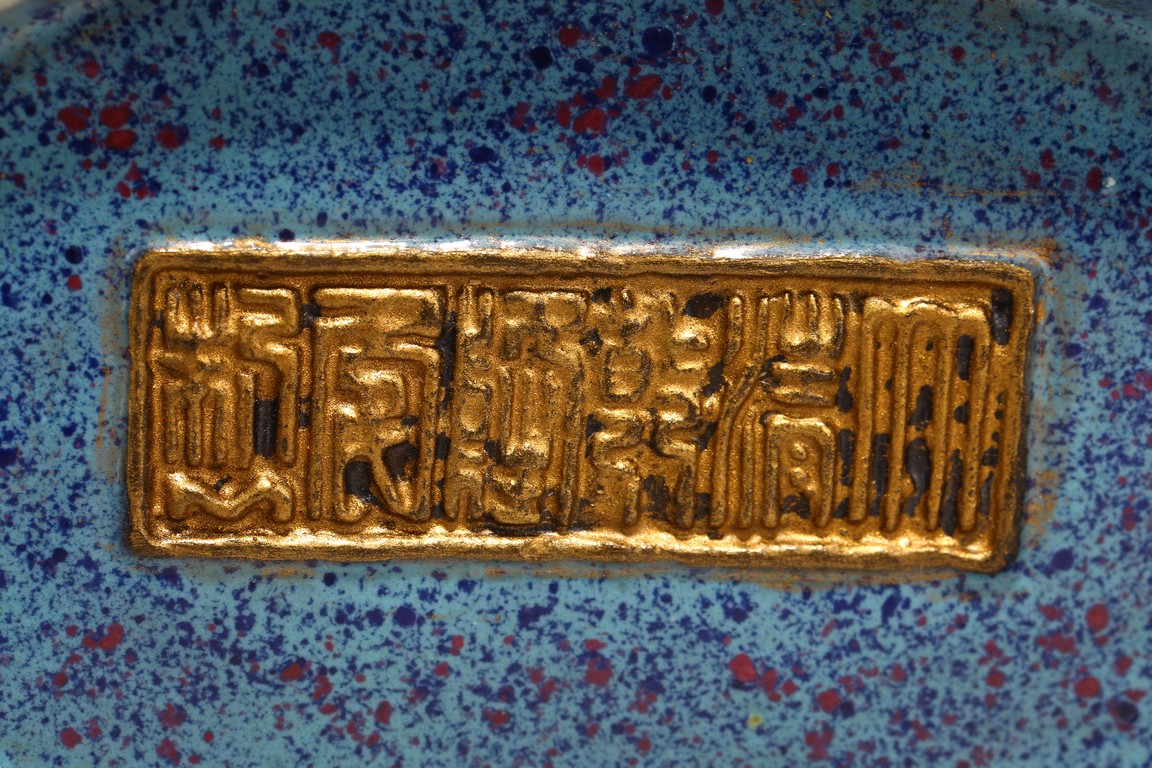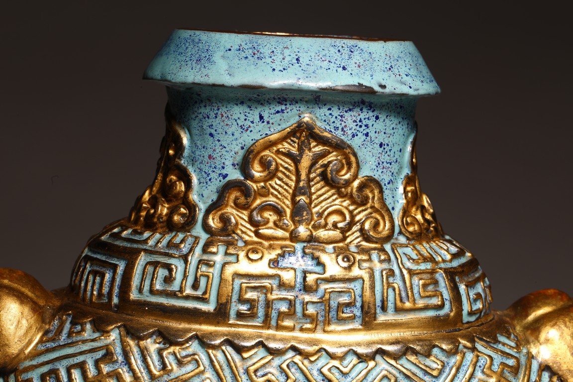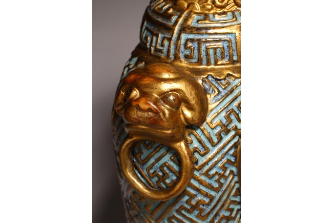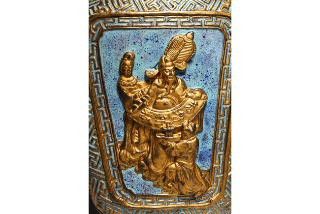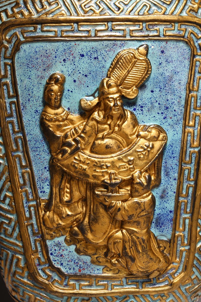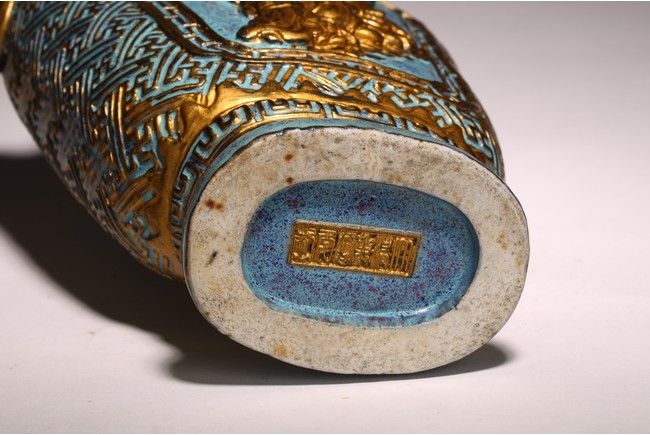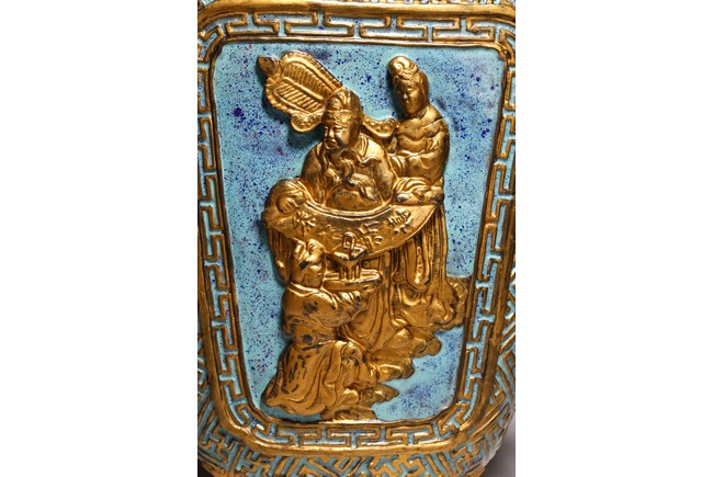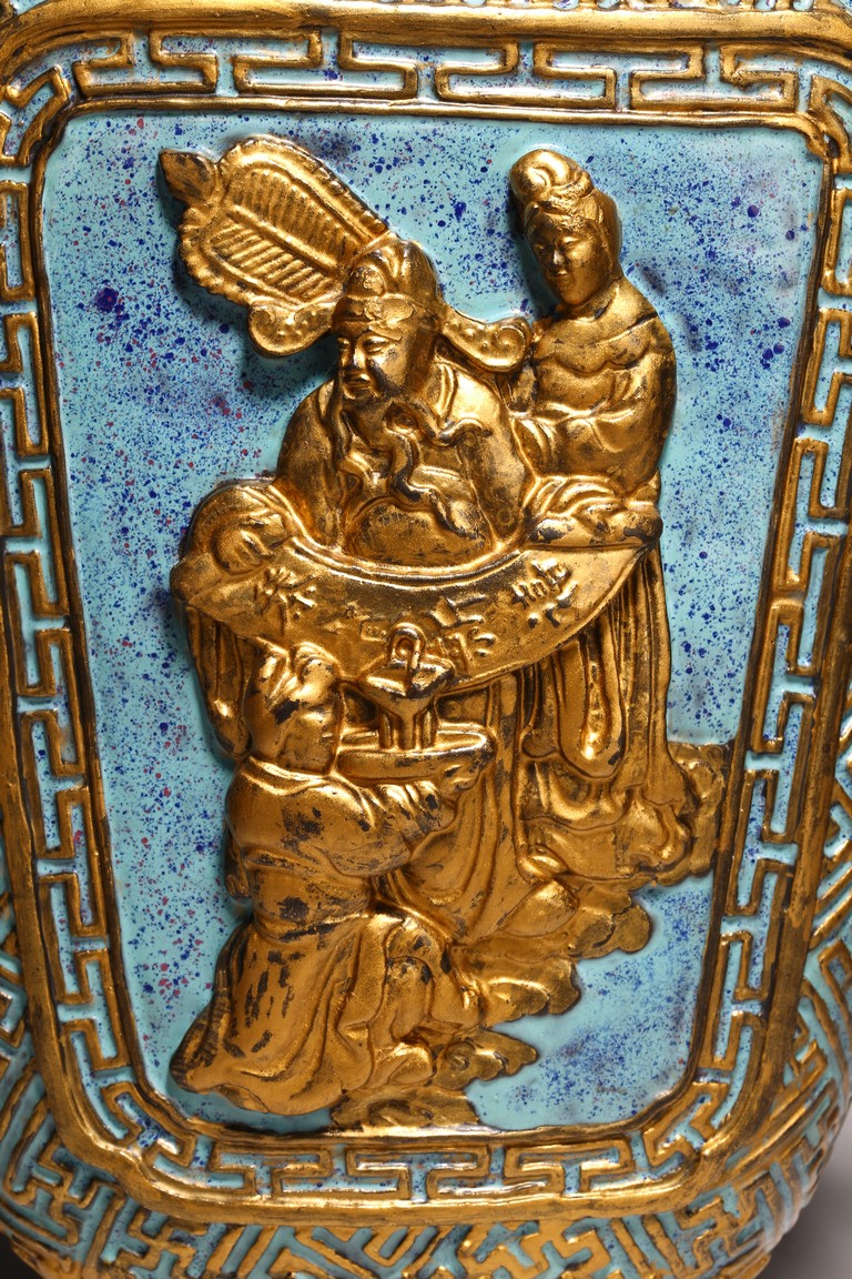 古銅彩是清 乾隆朝裝飾彩特殊品種之一,摹仿古代青銅器色 彩,故稱“古銅彩”。其制作工藝非常考究,所燒制 出青銅器鏽迹斑駁的效果,或用金彩摹繪璀璨的錯金銀紋飾,其質感色彩均于青銅 真品相若。整體力圖顛覆傳統的新意,綜合新與舊之法,即有仿古的 韻味, 又有富麗堂皇之氣。 本器以古銅釉爲地,營造出古銅繡蝕斑駁的質感,金彩繪圖紋, 華麗古雅。方口,直頸,雙獅耳,腹漸下收,高圈足。頸部繪“蕉葉 紋”“夔龍紋”,腹部以“萬字紋”爲地,中心開窗繪“人物故事圖”, 官員手持書卷,仕女手持蕉扇跟隨其後,侍從跪拜其膝前,手捧爵杯。 整器人物刻畫清晰,構圖嚴謹,工藝考究,富麗堂皇。