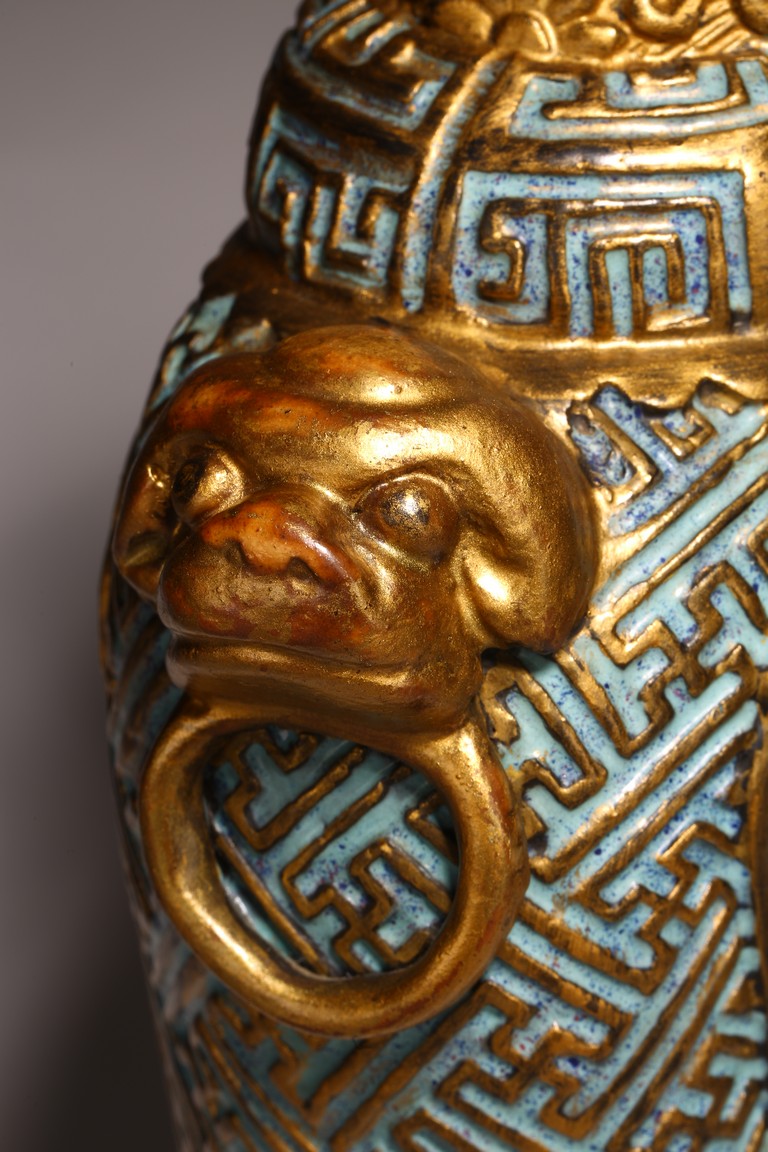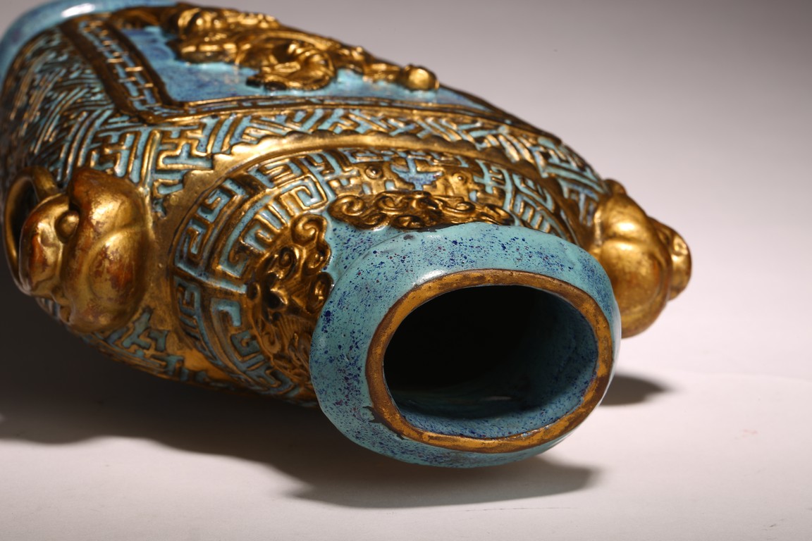 Qing Dynasty period. Of flattened rectangular form, the vase decorated in relief with figures on both sides, the shoulder flanked by pair of relief mythical beast masks, all painted in gilt simulate the patina of gilt bronze, reserved on green enamels ground, the base bears reign mark.
