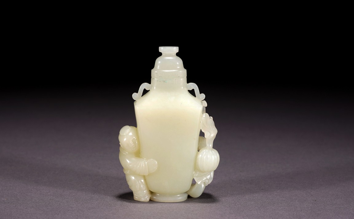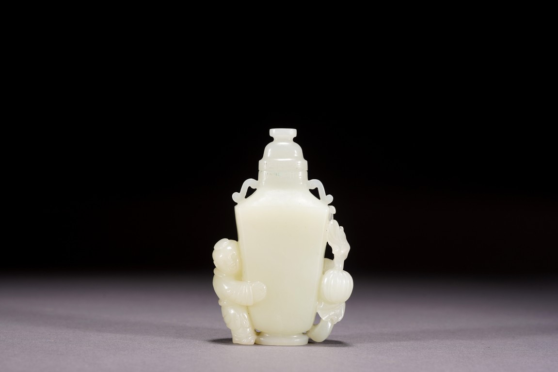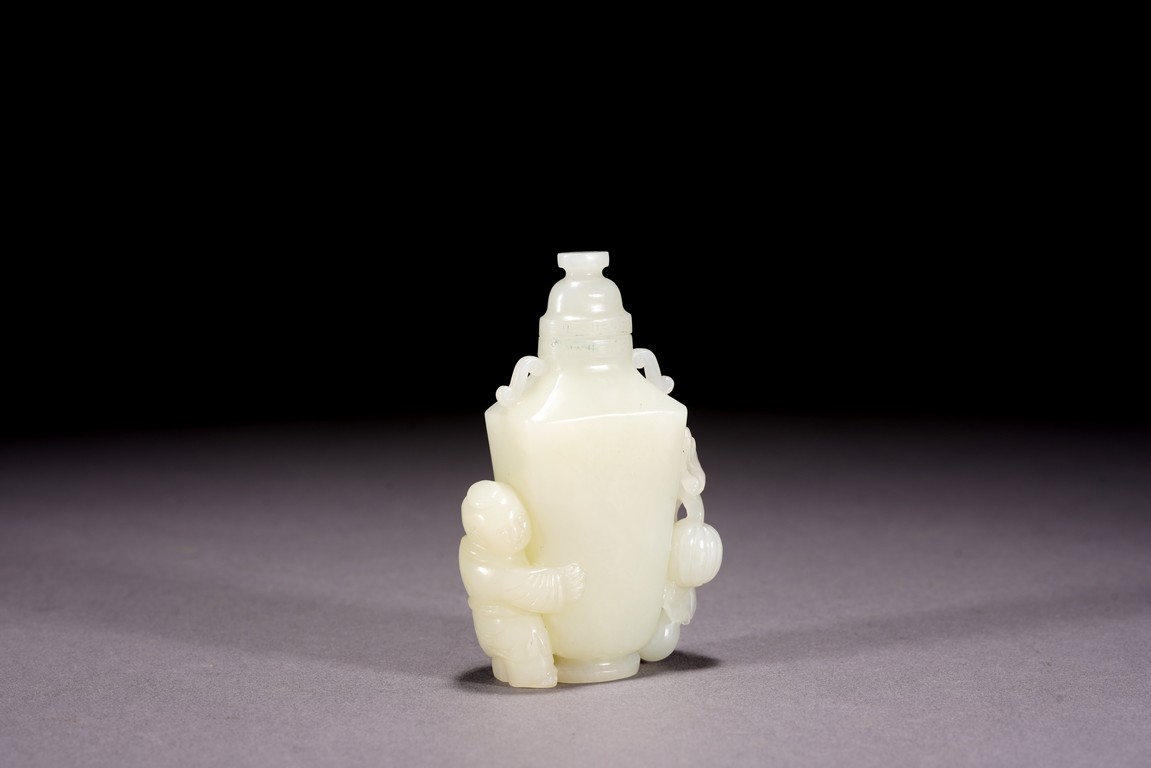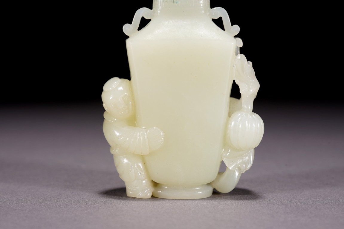 Qing Dynasty period. The flattened vase carved to the exterior with a hugging boy to the side, the other side carved with melon, the stone is of translucent smooth white tone.