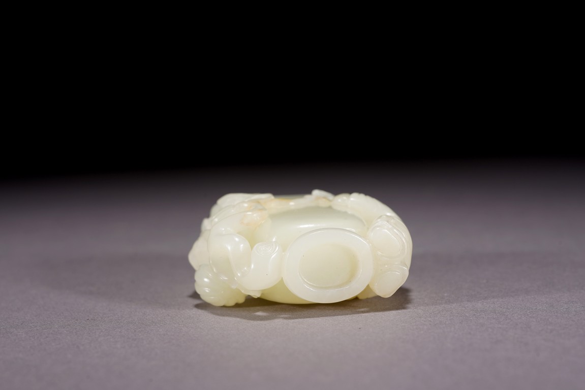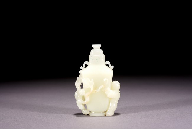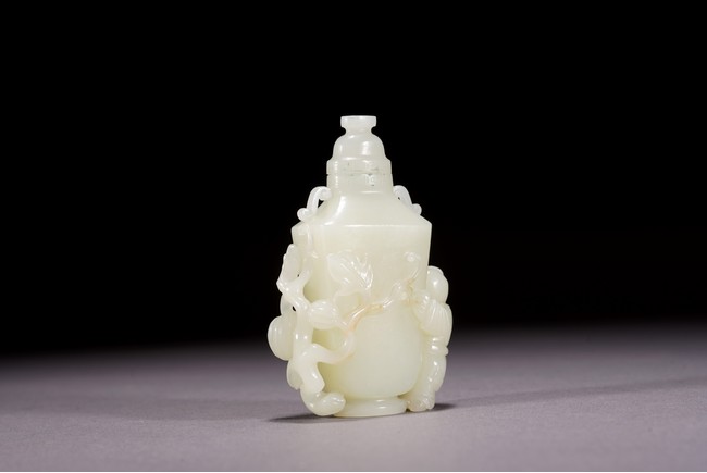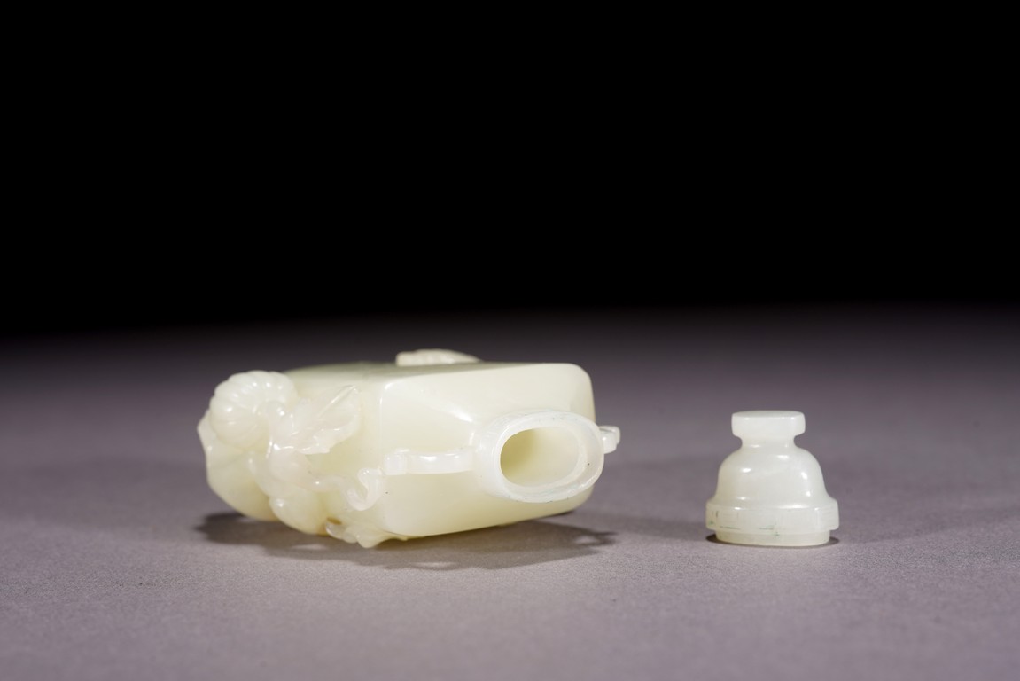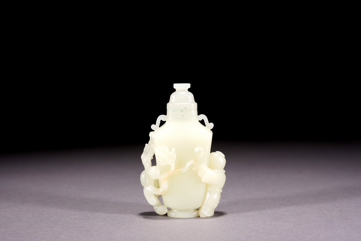 Qing Dynasty period. The flattened vase carved to the exterior with a hugging boy to the side, the other side carved with melon, the stone is of translucent smooth white tone.