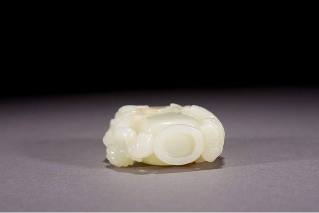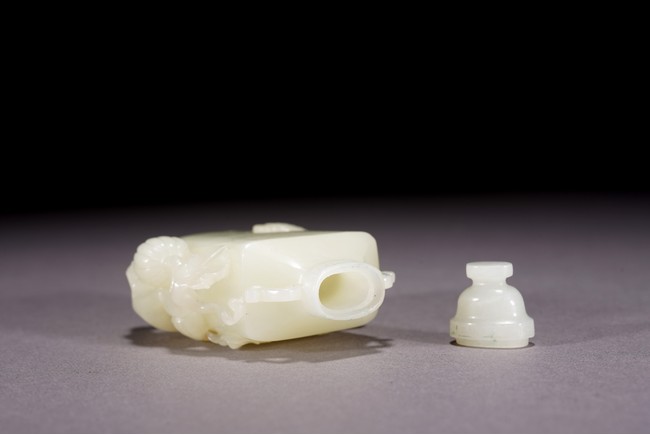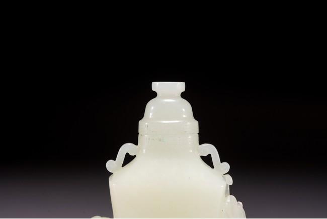 此件賞瓶和田白玉籽料材質,玉質溫潤細膩,略帶皮色,雕琢方瓶,兩側分別有兩位童子,呈獻福獻壽姿態,靈動自然,栩栩如生。