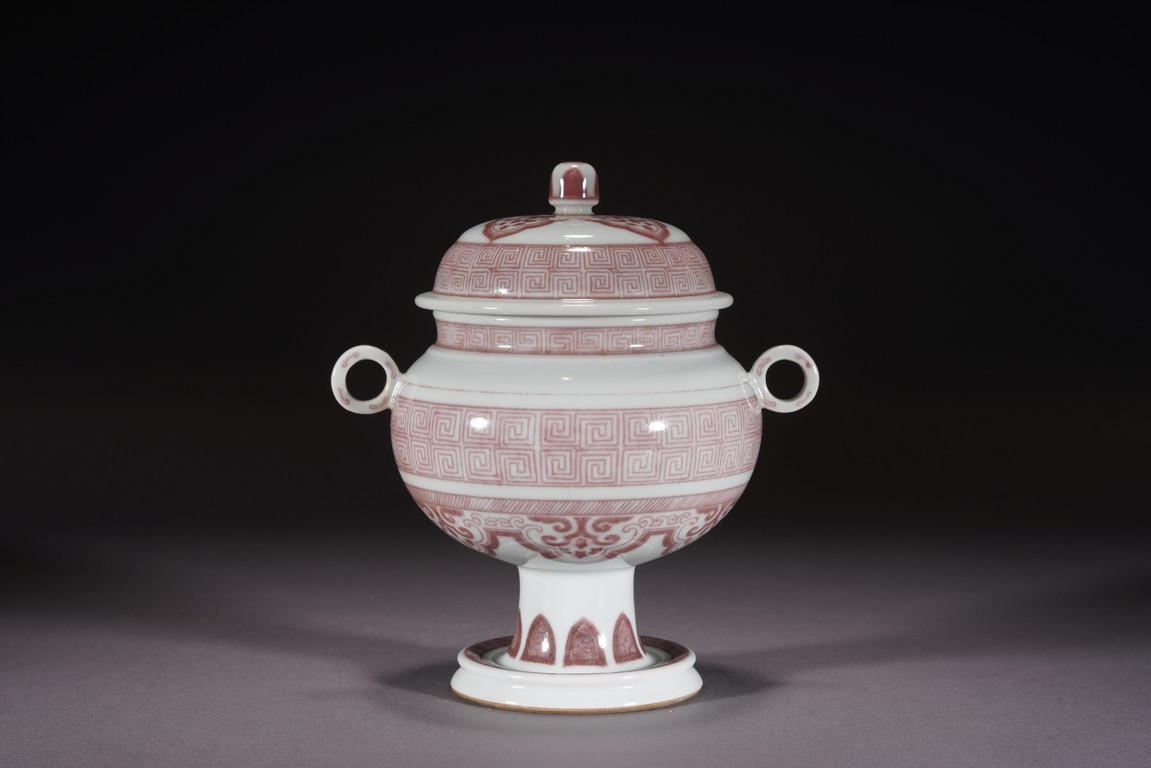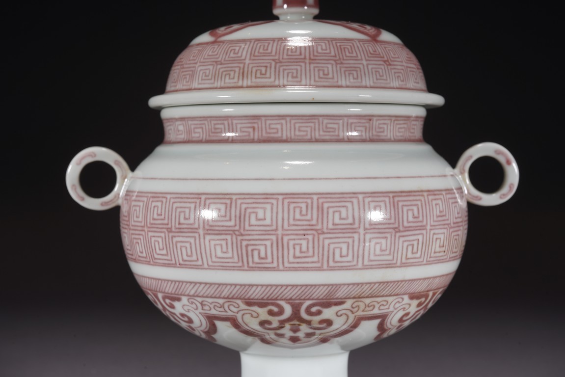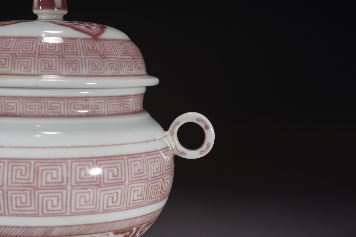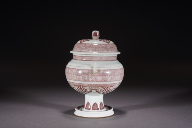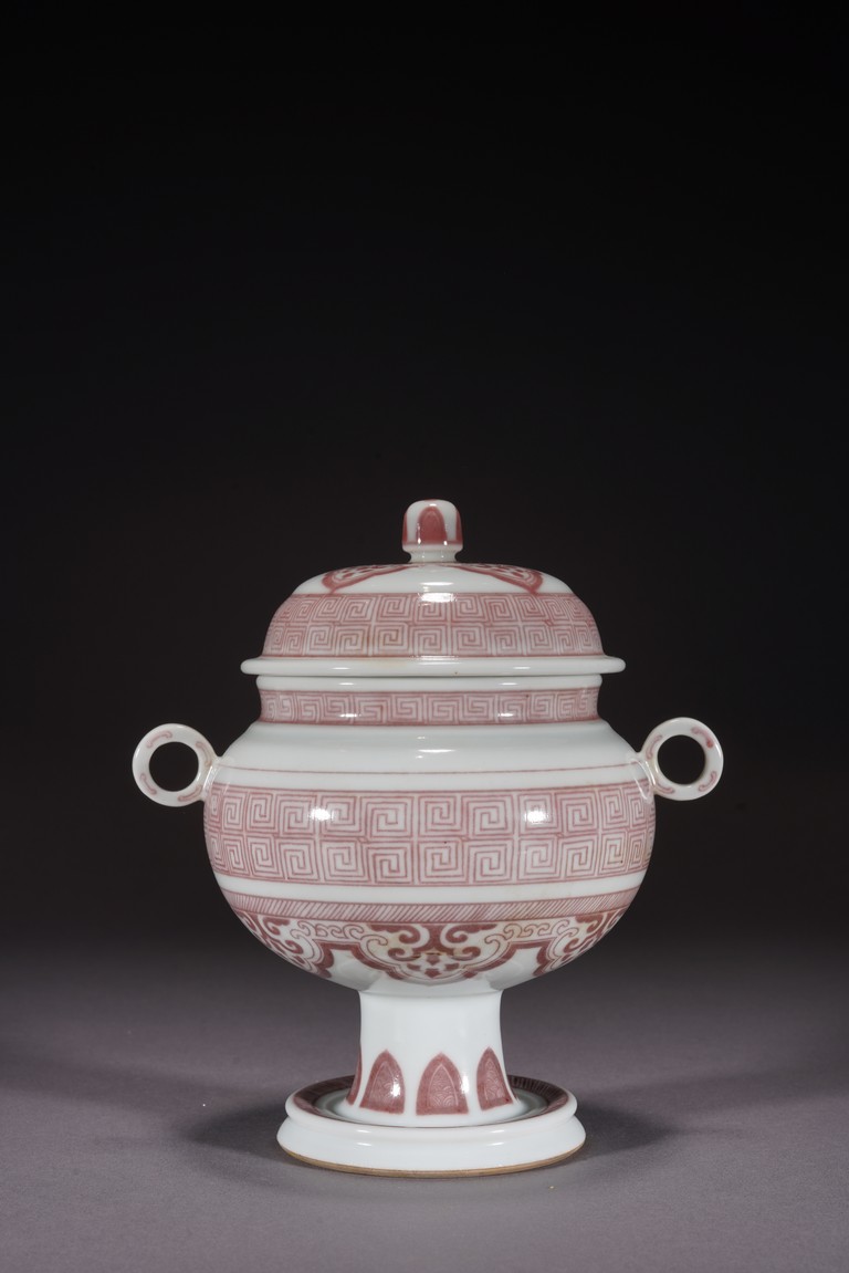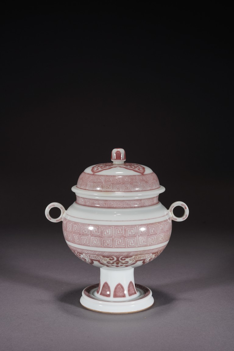 釉裏紅燒造工藝繁複,講究物理變化之妙,由于在燒成過程當中氧化銅離子遊離激烈, 往往 易于聚結,凹凸不平,若大面積塗飾,致使紋飾漫漶不清,遂成瑕疵;若火候氣氛掌握 不 准,其色或是暗沈,或是淺薄,皆不堪入目,影響美觀。 本器造型仿制春秋時期青銅豆,帶蓋,蓋有圓形捉手,子母口,雙環耳,柄較粗而低矮, 胎質細致堅實,胎釉結合致密, 釉面潔白,質地勻淨,釉質肥厚,瑩潤如玉。釉裏紅發色 穩定,明快豔麗,體現出窯工對火候極高的控制能力。“大清乾隆年制”款識。