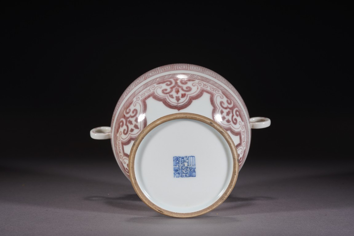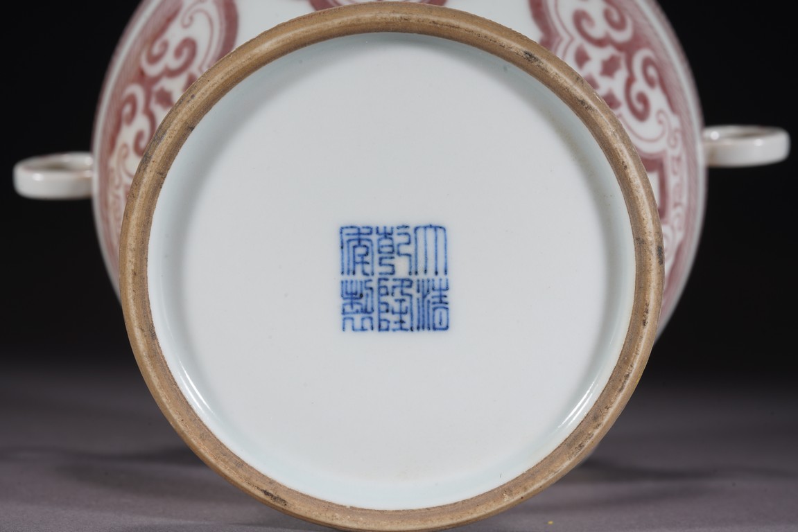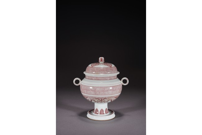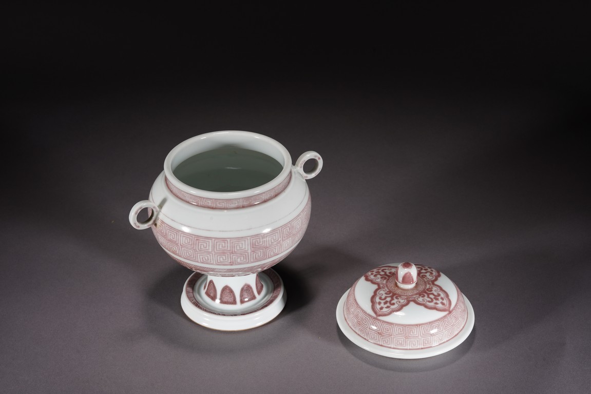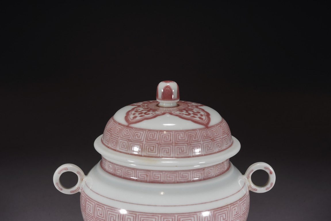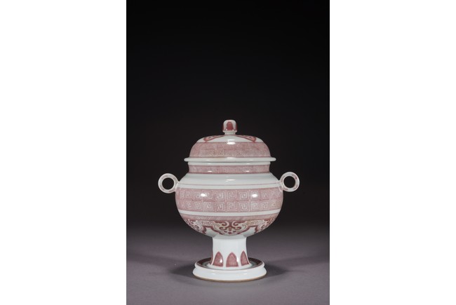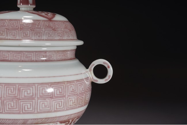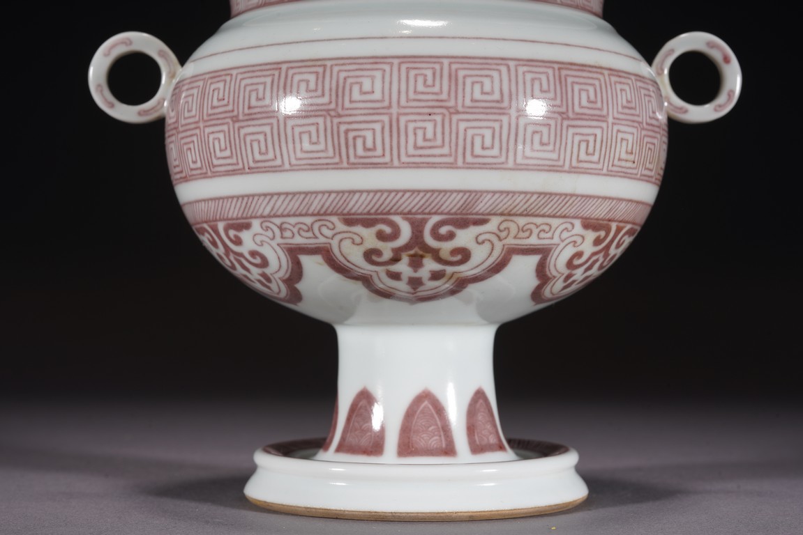 釉裏紅燒造工藝繁複,講究物理變化之妙,由于在燒成過程當中氧化銅離子遊離激烈, 往往 易于聚結,凹凸不平,若大面積塗飾,致使紋飾漫漶不清,遂成瑕疵;若火候氣氛掌握 不 准,其色或是暗沈,或是淺薄,皆不堪入目,影響美觀。 本器造型仿制春秋時期青銅豆,帶蓋,蓋有圓形捉手,子母口,雙環耳,柄較粗而低矮, 胎質細致堅實,胎釉結合致密, 釉面潔白,質地勻淨,釉質肥厚,瑩潤如玉。釉裏紅發色 穩定,明快豔麗,體現出窯工對火候極高的控制能力。“大清乾隆年制”款識。