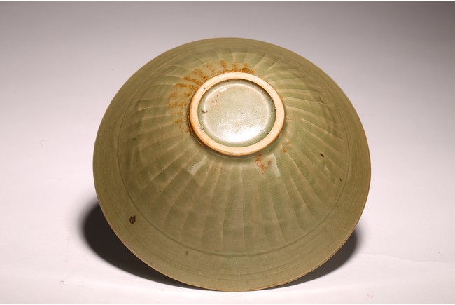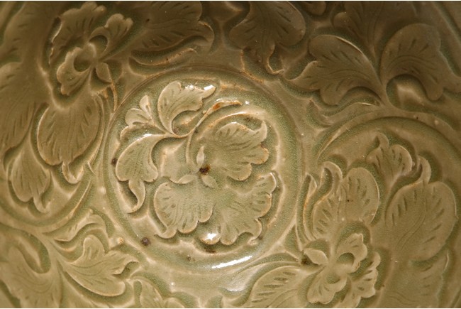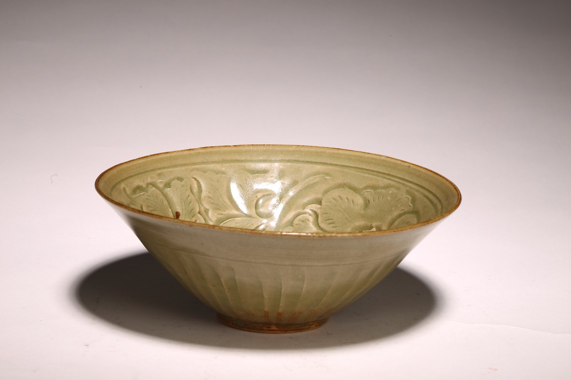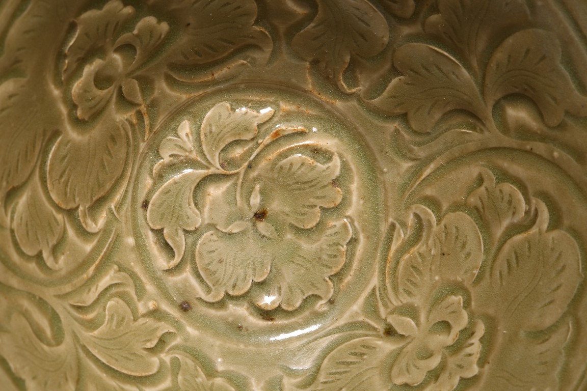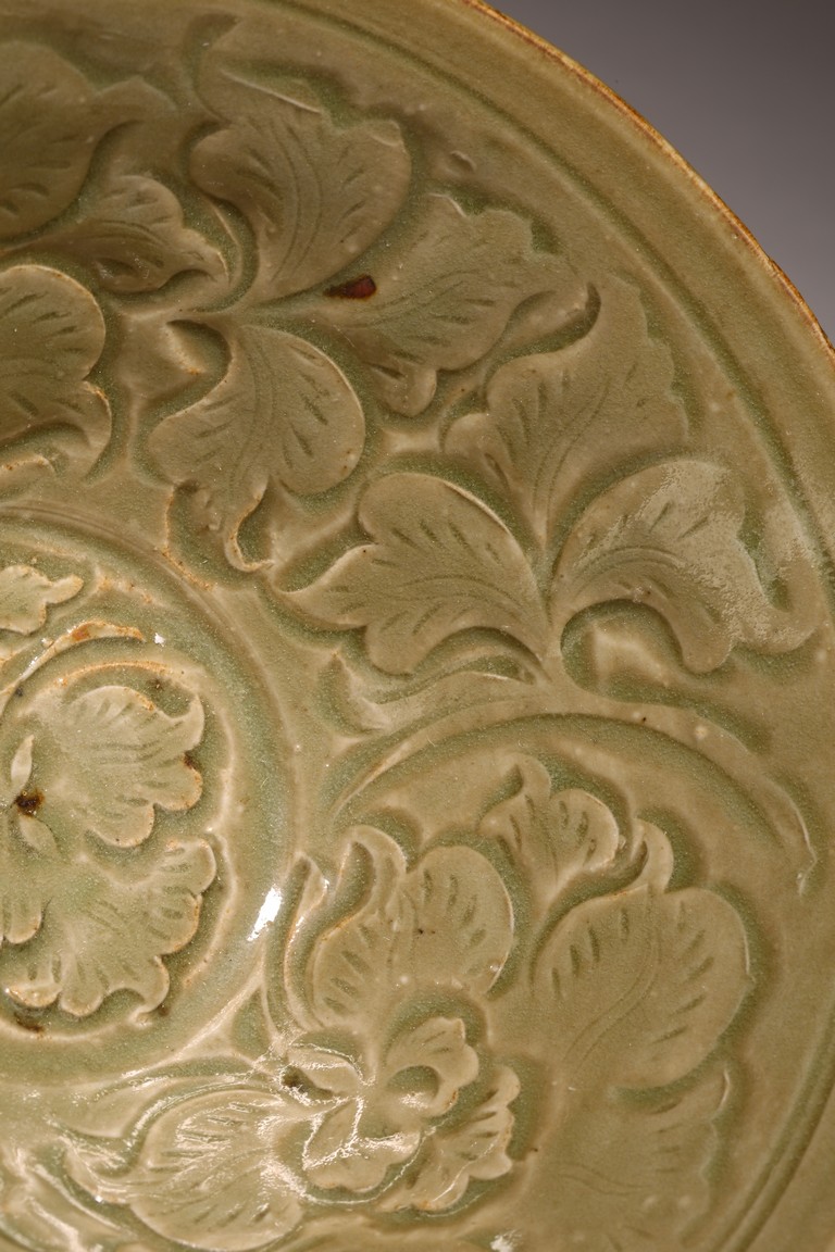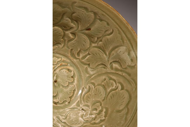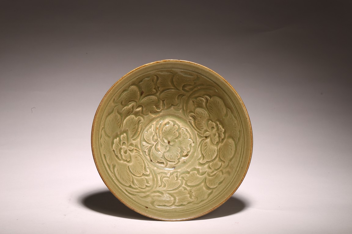 Northern Song Dynasty period. The interior carved two large mirroring peony blooms borne on leafy scrolling stems encircling a central peony spray, the exterior carved with a wide band of lines radiating from footring, applied overall with olive-green glaze.