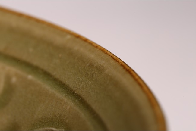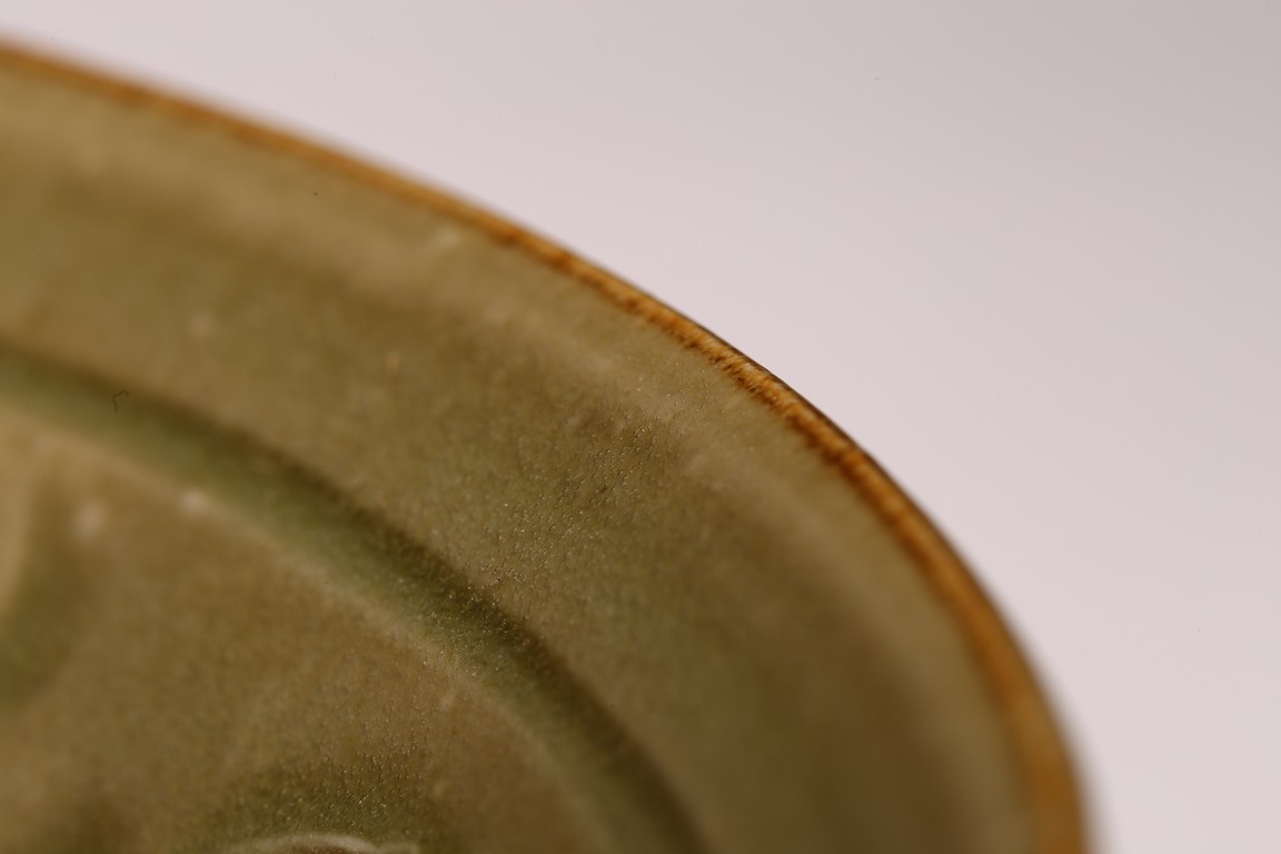 敞口,斜深腹,小圈足,通身施綠釉,盤內刻劃花卉,花瓣肥碩,紋飾布局有序,運刀流暢,線條剛勁有力,花葉具有強烈立體感。整體釉色潤澤,色彩雅致,秀麗大方。