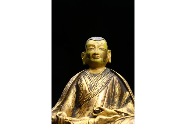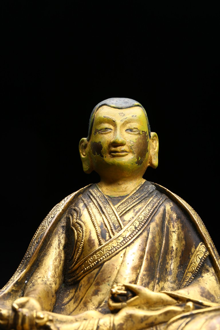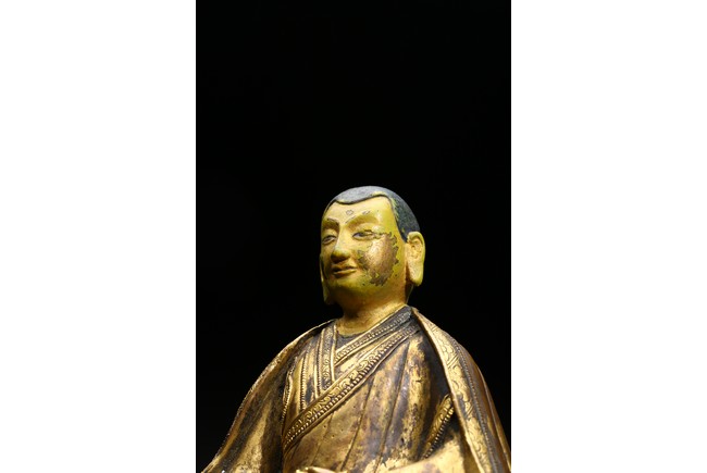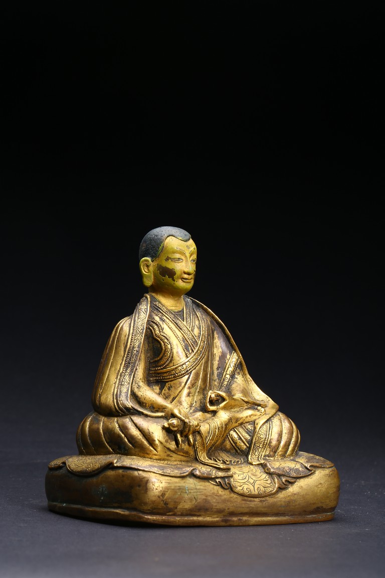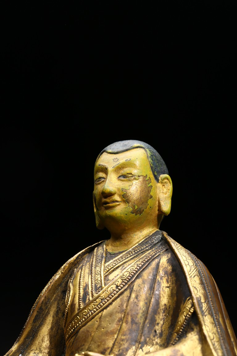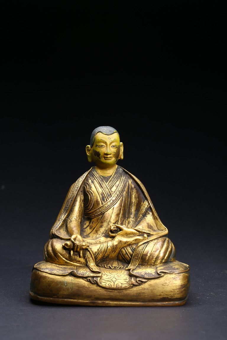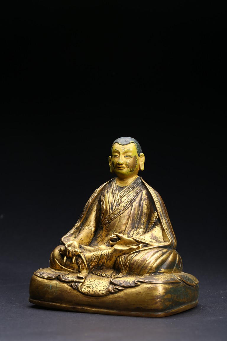 上師是藏傳佛教對具有高德盛行、堪爲世人規範者的尊稱,在藏傳佛教的修行中佔有 重要地位。此尊頭蓄短發,面容方闊,帶有微笑,表現出上師點醒世人靈台覺性時的歡 喜心情。上身軀體勻稱,身姿挺拔。衣紋精細精美,左手持金剛杵,右手持金剛鈴,雙 腿結跏趺坐於蓮花寶座上。整像胎體厚重,鎏金亮麗,造型生動,刻畫細膩,人物面容 的雕刻自然寫實,彷若上師再現世間。