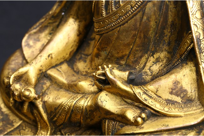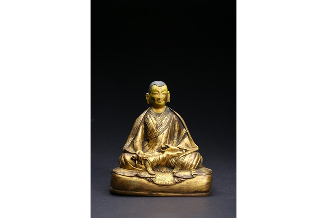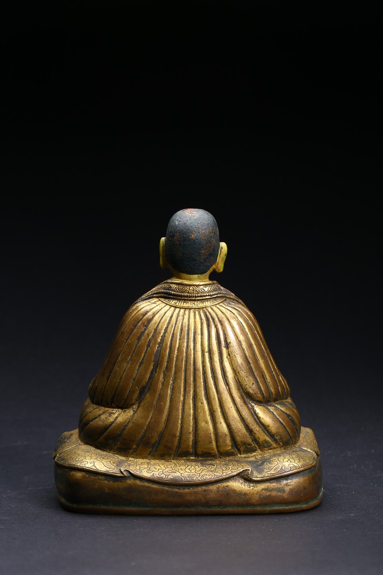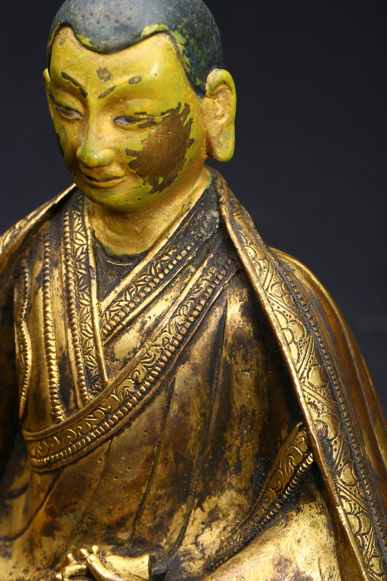 The Lama is seated on cushion, with his right hand resting on his knee holding a vajra, and his left hand rested in front of belly holding vajra. He is clad in heavy robes with foliate-incised hems, and holds his cold-gilt face in a serene expression with steady gaze. Qing Dynasty period.