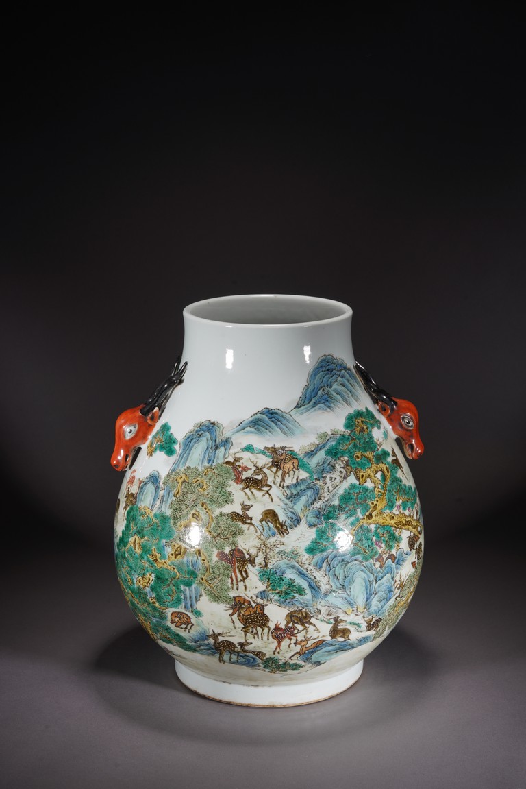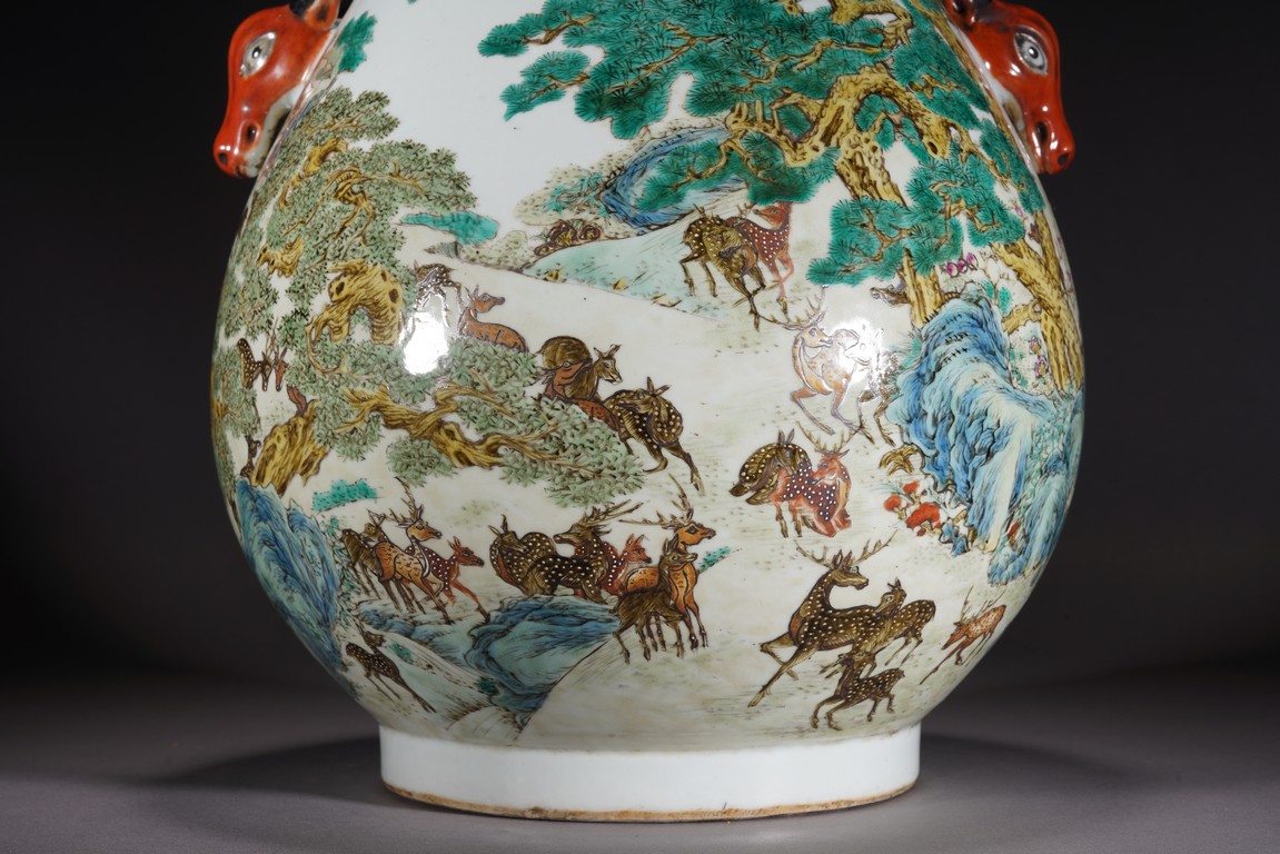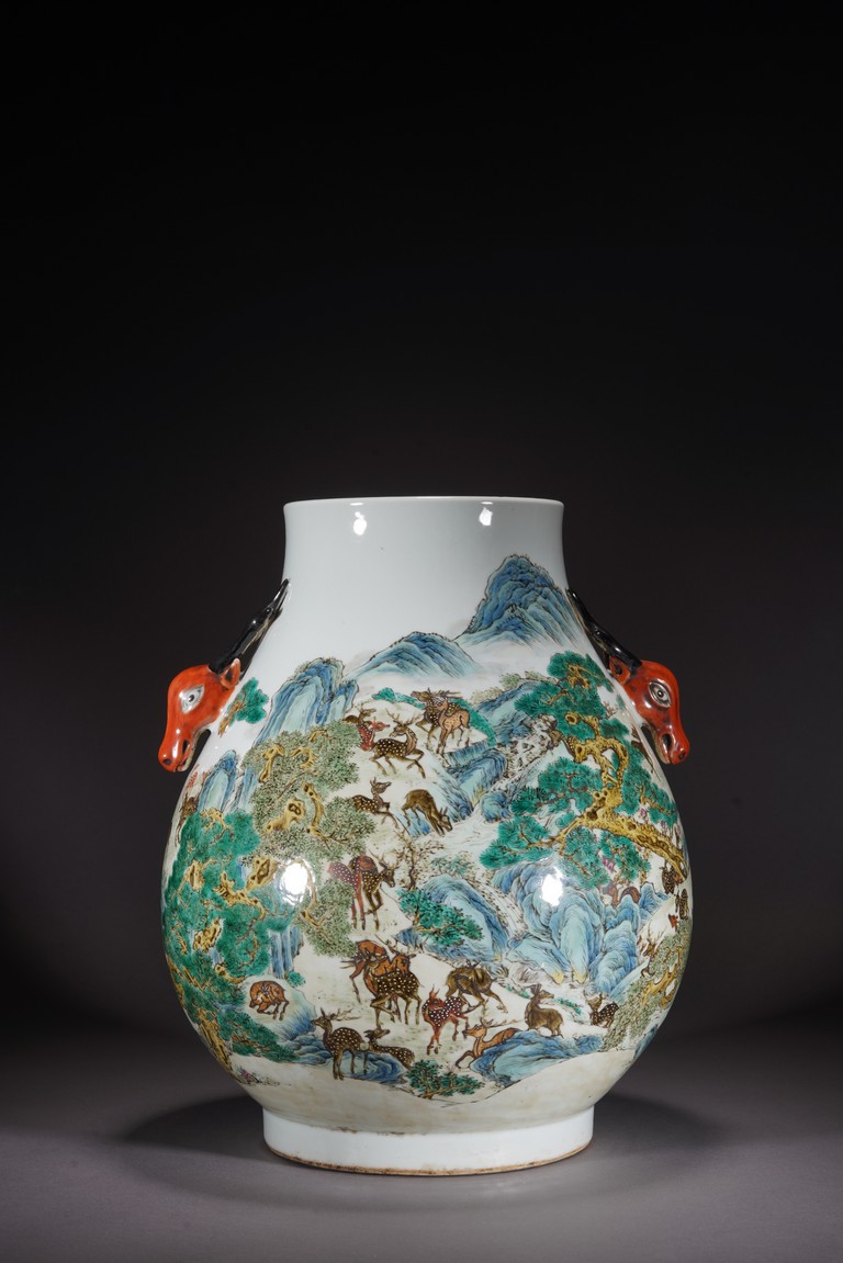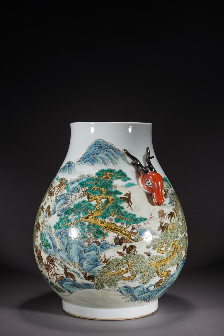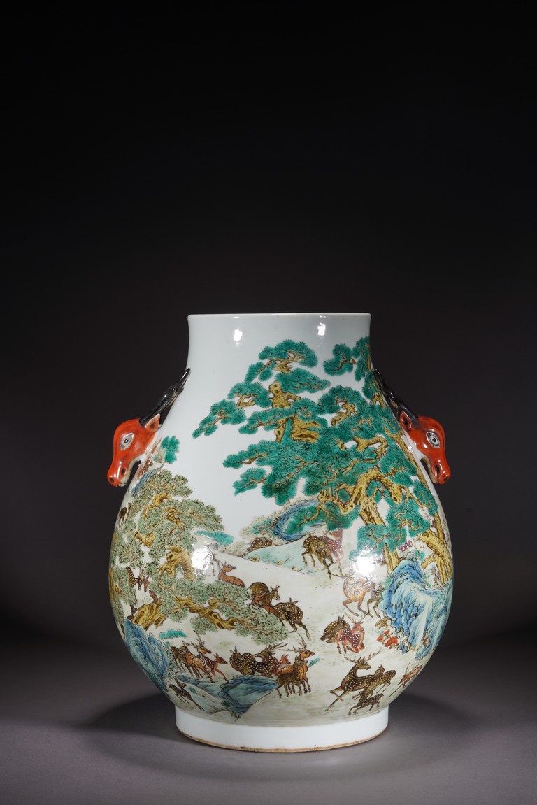 鹿與“祿”諧音,百鹿即“百祿”,取高官厚祿意。故此器又名“百祿”尊。鹿爲仙禽,與 瑞草靈芝、桃、松桐象征長生不老、松鶴延年之意願。 此尊畫面表現了清皇朝重要的狩獵活動木蘭秋狝。木蘭爲滿語,意爲“哨鹿”,秋狝指秋 天打獵。這是自康熙二十二年起幾乎每年秋天都舉辦的大典,這並非爲了狩獵娛樂,而是具 有重大的政治、軍事意義。康熙皇帝爲鍛煉軍隊,在承德以北開辟狩獵場,每年秋季狩獵時 用八旗兵頭戴鹿頭,在樹林裏口學鹿啼叫,引誘異性,鹿出之則合圍獵殺。乾隆皇帝對此祖 制甚爲重視,還命宮廷畫師把實況記錄下來,工匠就照著這些畫卷,把此重要的活動重現于 百鹿尊,也是帝王銘德之器。 本品敞口,口下漸廣,垂腹,圈足。肩兩側對稱飾礬紅仿生鹿頭爲耳,腹通景繪百鹿圖, 山林中松桐映掩,溪水淙淙,靈芝、花草叢生,壽石相叠,有嶙峋峥嵘之貌,其側蒼松相依 傍,枝幹遒勁,松蓋如傘,蒼松下梅花鹿三五成群,或奔跑,或憩息,或相偎,或嬉戲,或 覓食,姿態各異,一派祥和靜逸、生機勃勃的景象。“大清乾隆年制”款識。 來源:佛羅里達州邁阿密藏家提供 Provenance: Property from a private collection in Miami, Florida