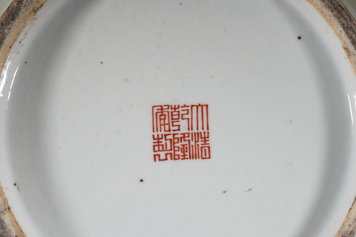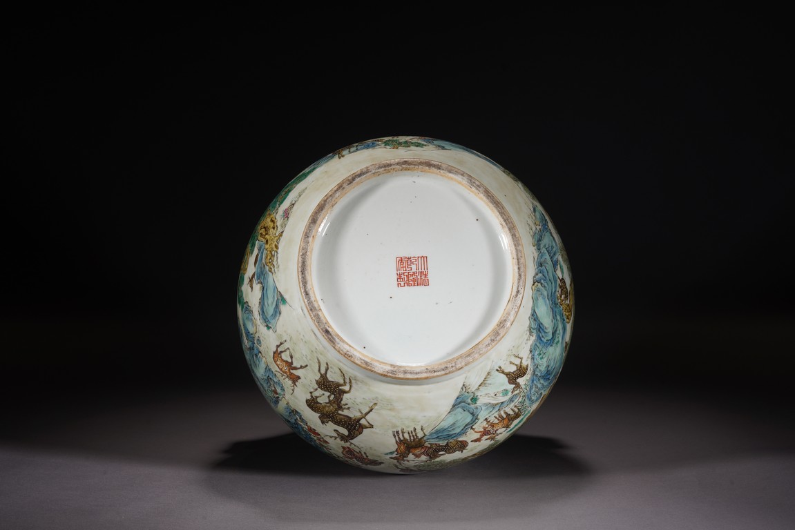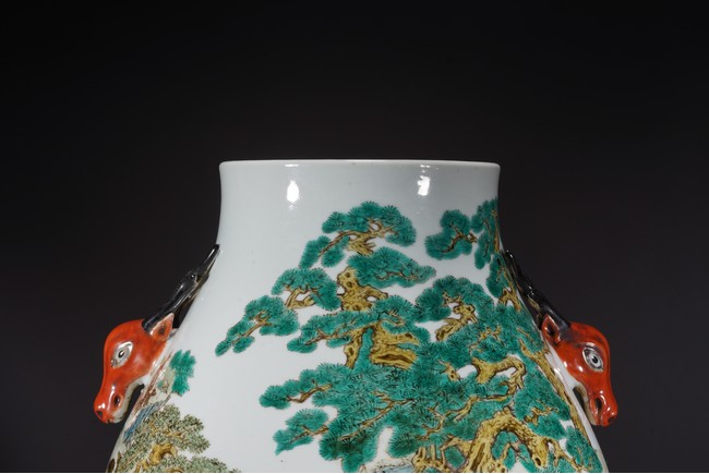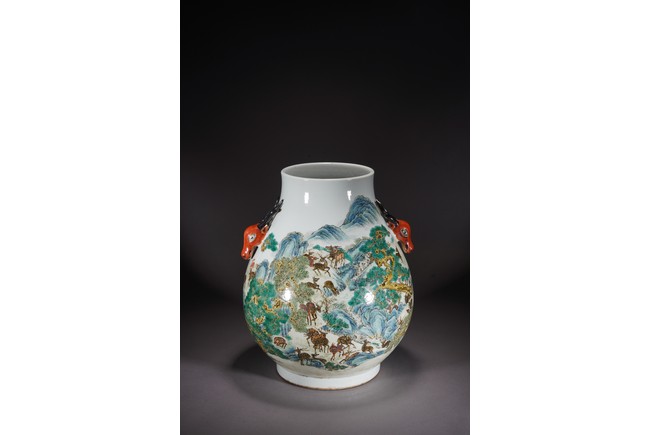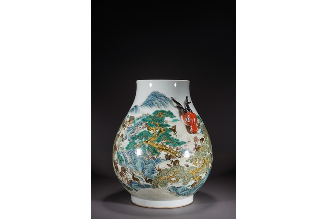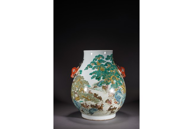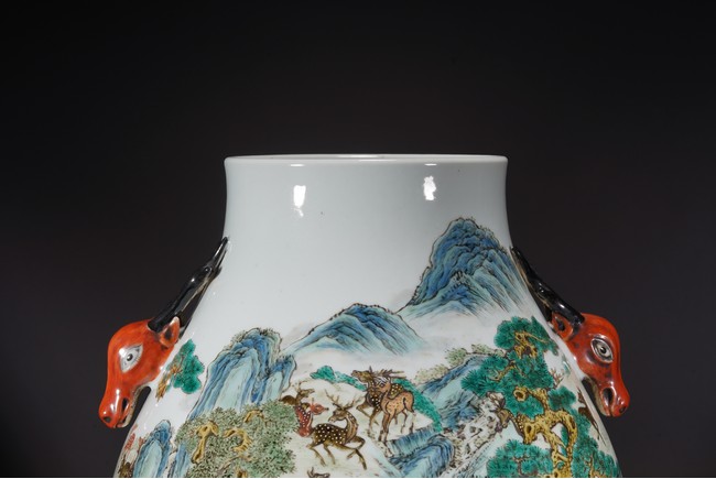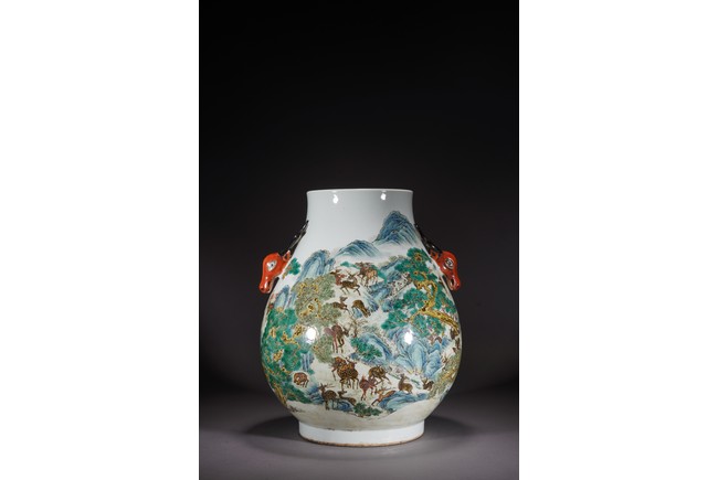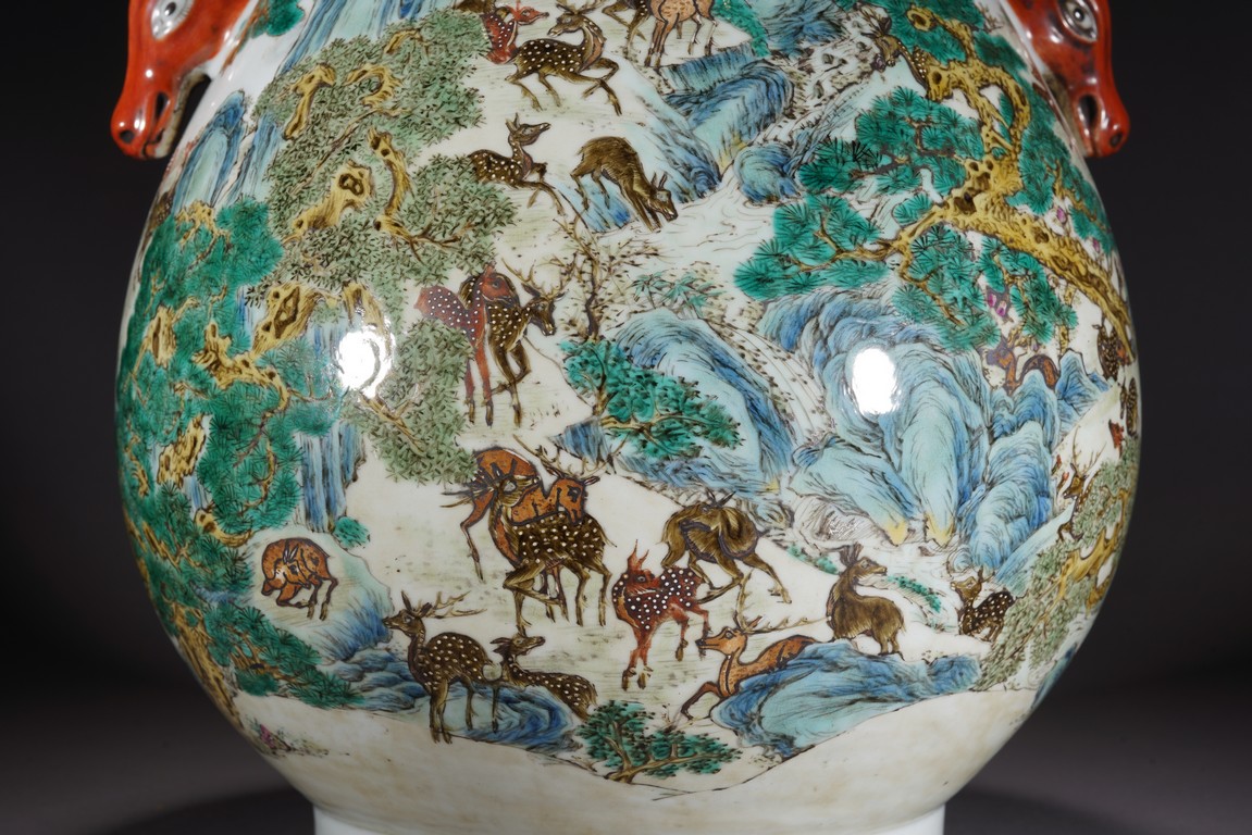 鹿與“祿”諧音,百鹿即“百祿”,取高官厚祿意。故此器又名“百祿”尊。鹿爲仙禽,與 瑞草靈芝、桃、松桐象征長生不老、松鶴延年之意願。 此尊畫面表現了清皇朝重要的狩獵活動木蘭秋狝。木蘭爲滿語,意爲“哨鹿”,秋狝指秋 天打獵。這是自康熙二十二年起幾乎每年秋天都舉辦的大典,這並非爲了狩獵娛樂,而是具 有重大的政治、軍事意義。康熙皇帝爲鍛煉軍隊,在承德以北開辟狩獵場,每年秋季狩獵時 用八旗兵頭戴鹿頭,在樹林裏口學鹿啼叫,引誘異性,鹿出之則合圍獵殺。乾隆皇帝對此祖 制甚爲重視,還命宮廷畫師把實況記錄下來,工匠就照著這些畫卷,把此重要的活動重現于 百鹿尊,也是帝王銘德之器。 本品敞口,口下漸廣,垂腹,圈足。肩兩側對稱飾礬紅仿生鹿頭爲耳,腹通景繪百鹿圖, 山林中松桐映掩,溪水淙淙,靈芝、花草叢生,壽石相叠,有嶙峋峥嵘之貌,其側蒼松相依 傍,枝幹遒勁,松蓋如傘,蒼松下梅花鹿三五成群,或奔跑,或憩息,或相偎,或嬉戲,或 覓食,姿態各異,一派祥和靜逸、生機勃勃的景象。“大清乾隆年制”款識。 來源:佛羅里達州邁阿密藏家提供 Provenance: Property from a private collection in Miami, Florida