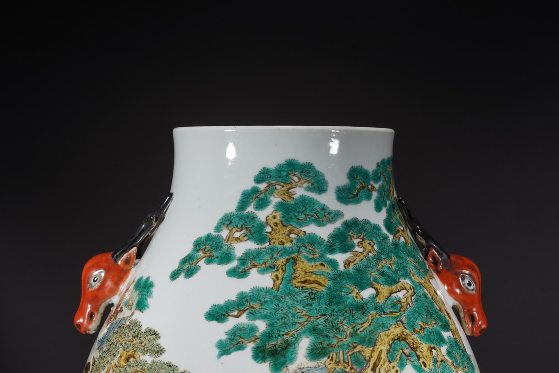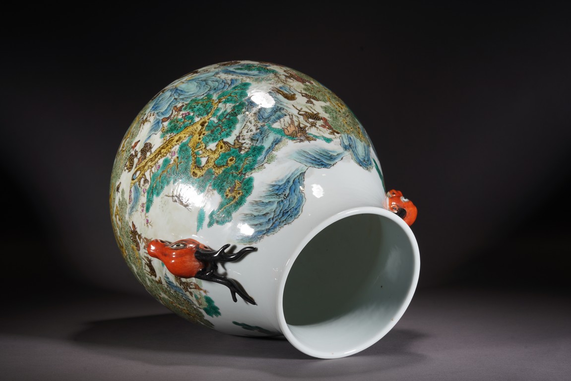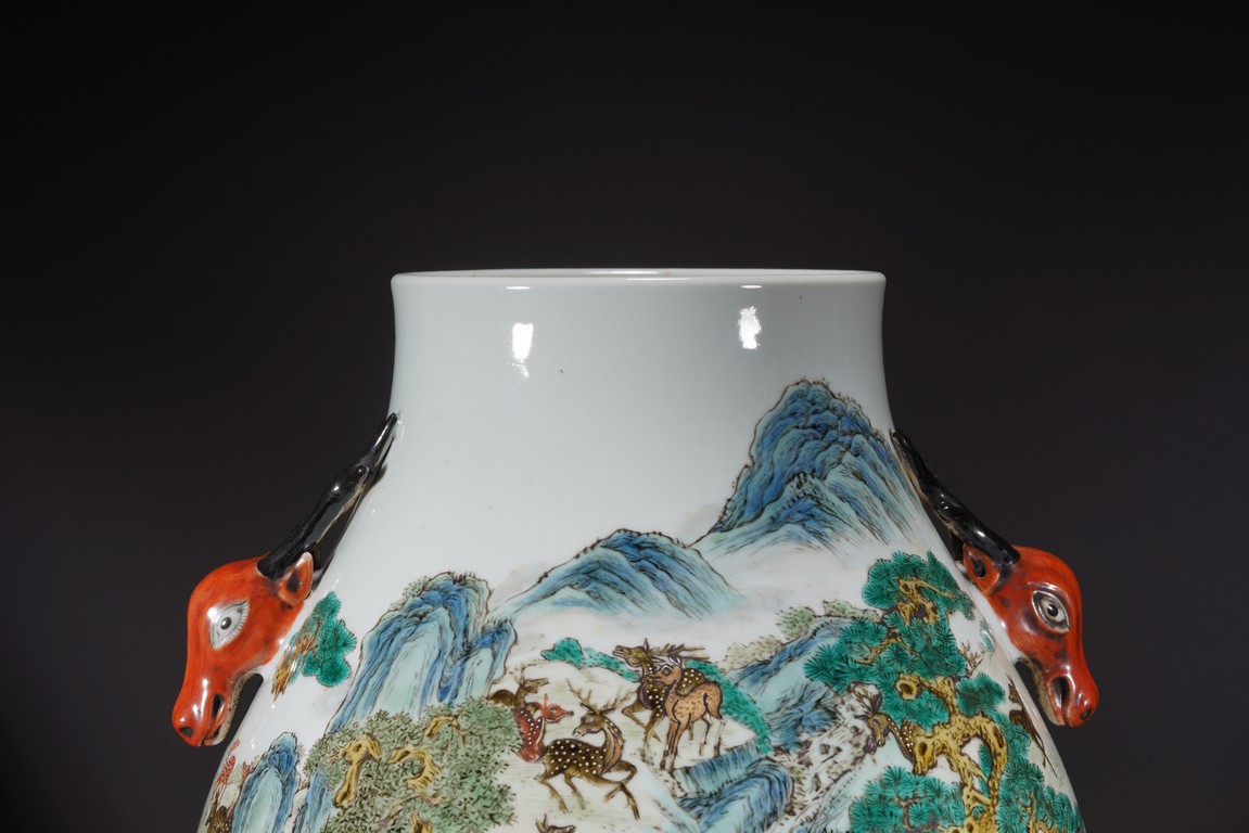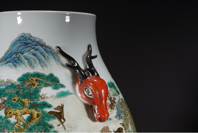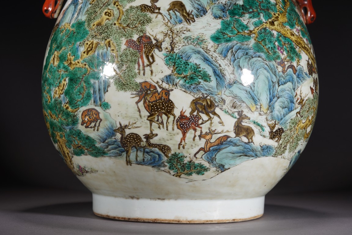 Republic period. Of archaistic hu-shape, the rounded side vividly enameled with a lively continuous scene of deer resting, grazing, playing and even combatting all amidst a verdant setting of lush grass, towering evergreens and fruiting peach trees punctuated with blue and green-shaded rock formations, the stags, does and fawns depicted as dappled or spotted in brown, iron-red or white, the shoulder flanked with a pair of stag-head handles, the base with an apocryphal Qianlong mark
