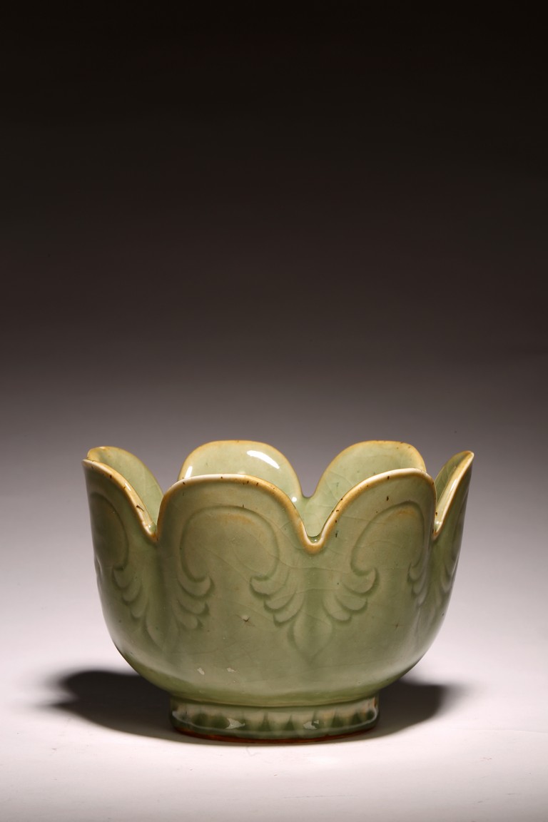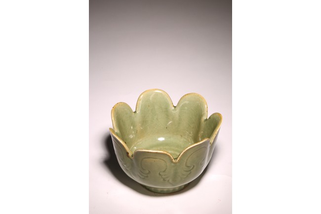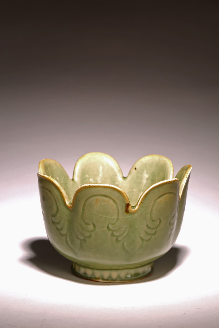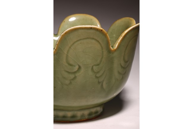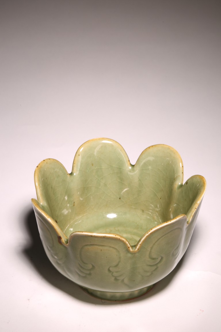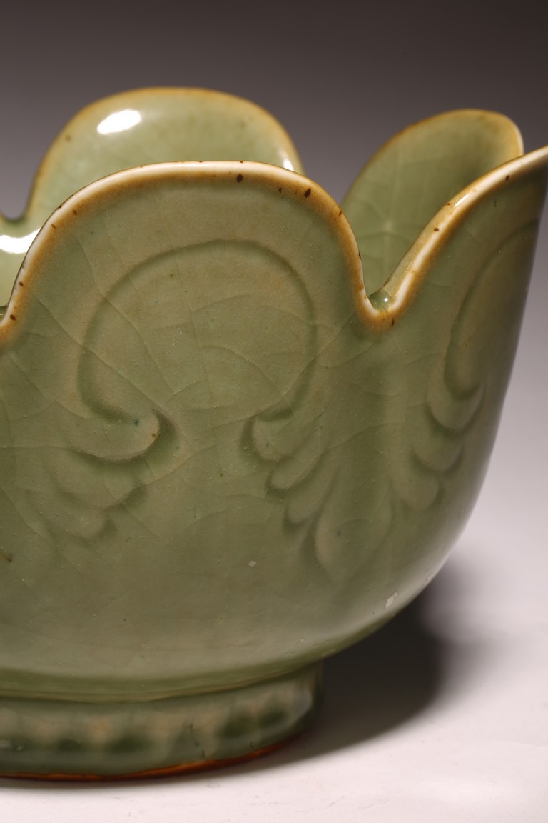 花瓣型口,斜腹,矮圈足。通體滿施龍泉青釉,釉面凝潤,色澤清新素雅,造型俊秀優美。