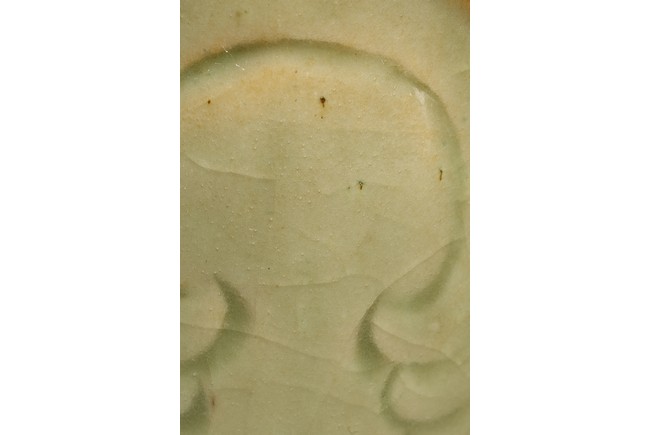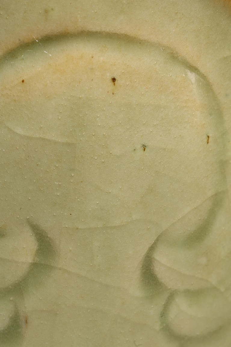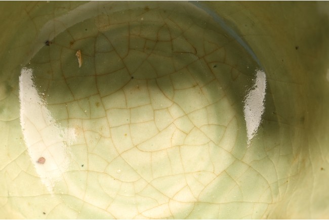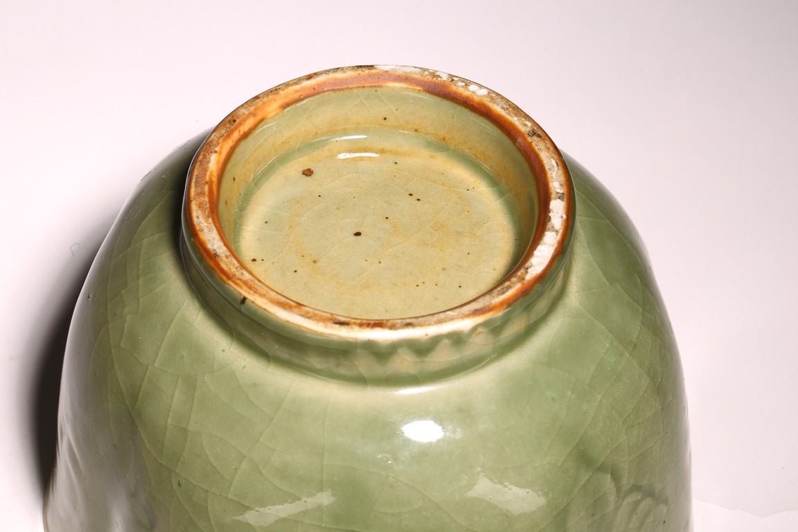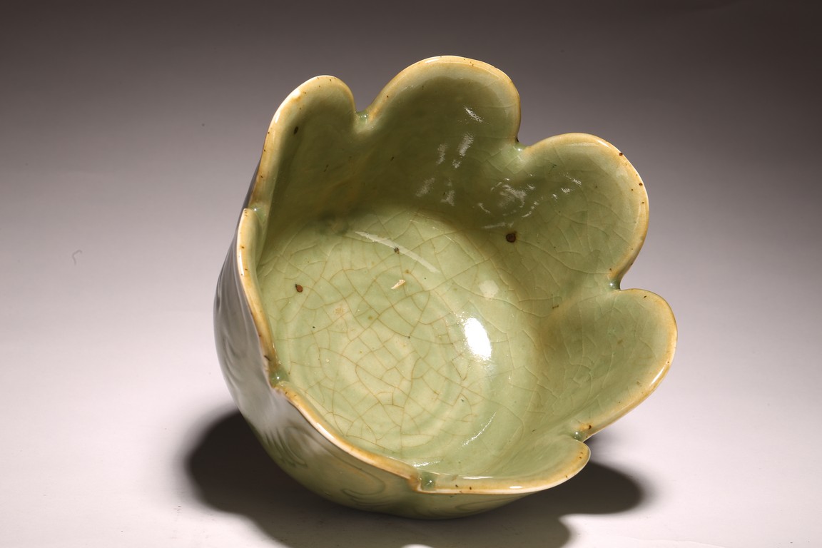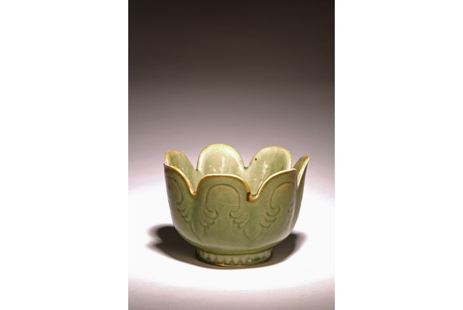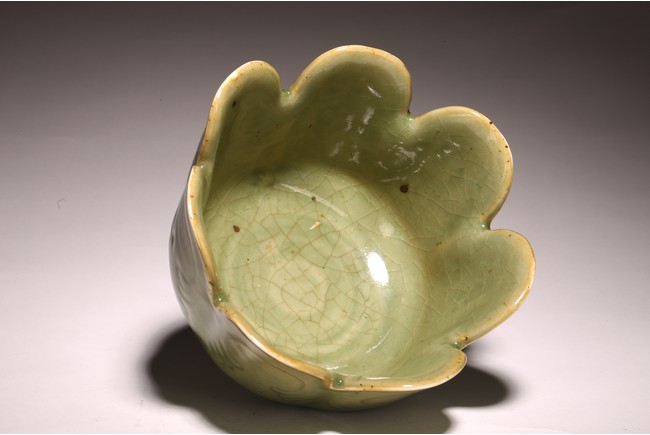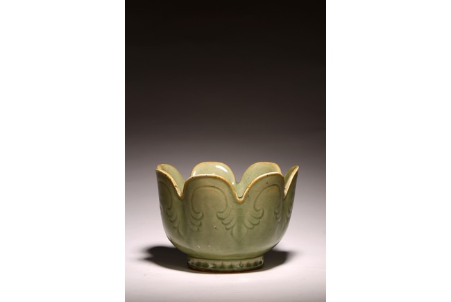 花瓣型口,斜腹,矮圈足。通體滿施龍泉青釉,釉面凝潤,色澤清新素雅,造型俊秀優美。