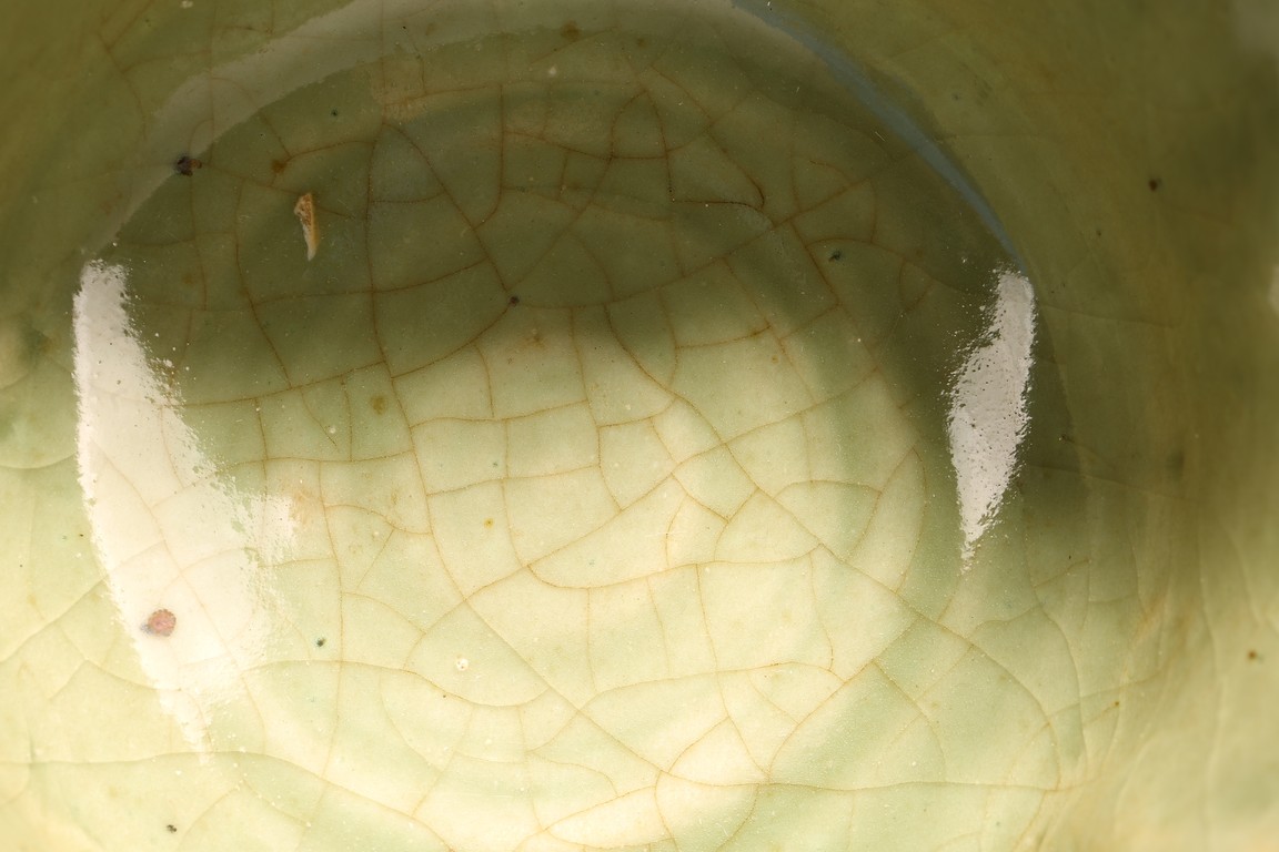 The bowl modelled in the form of lotus flower with petal rim, overall suffused in celadon olive green glaze