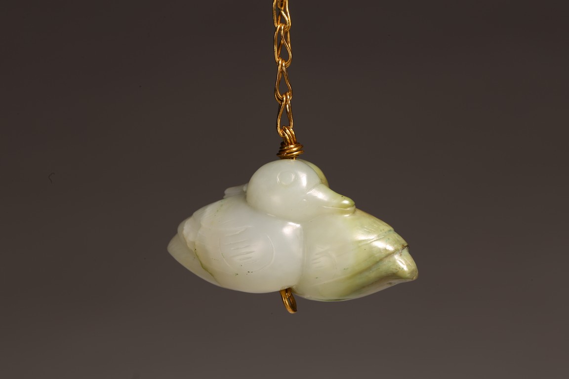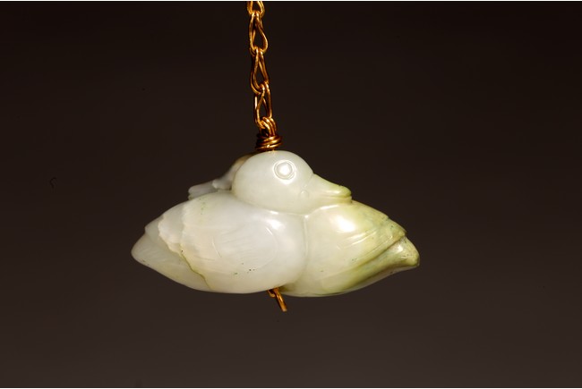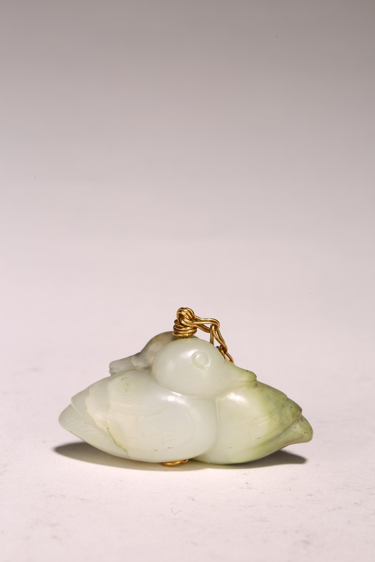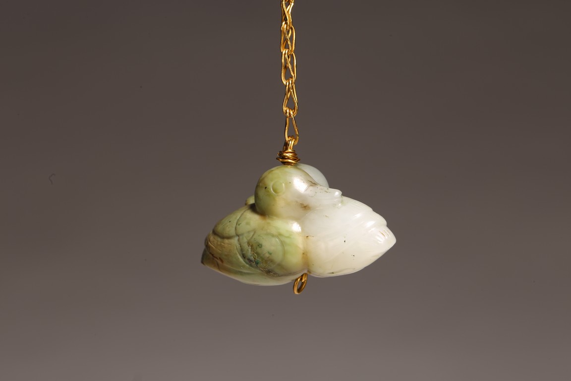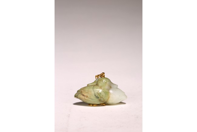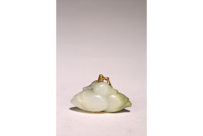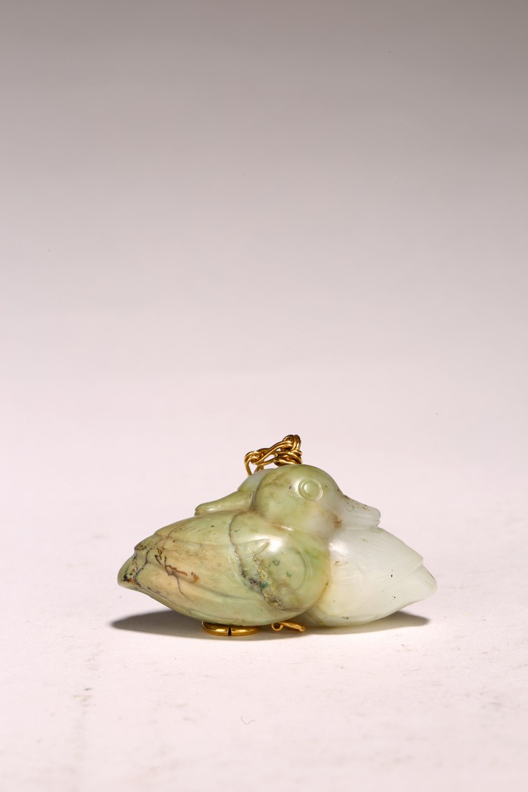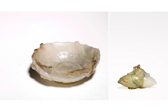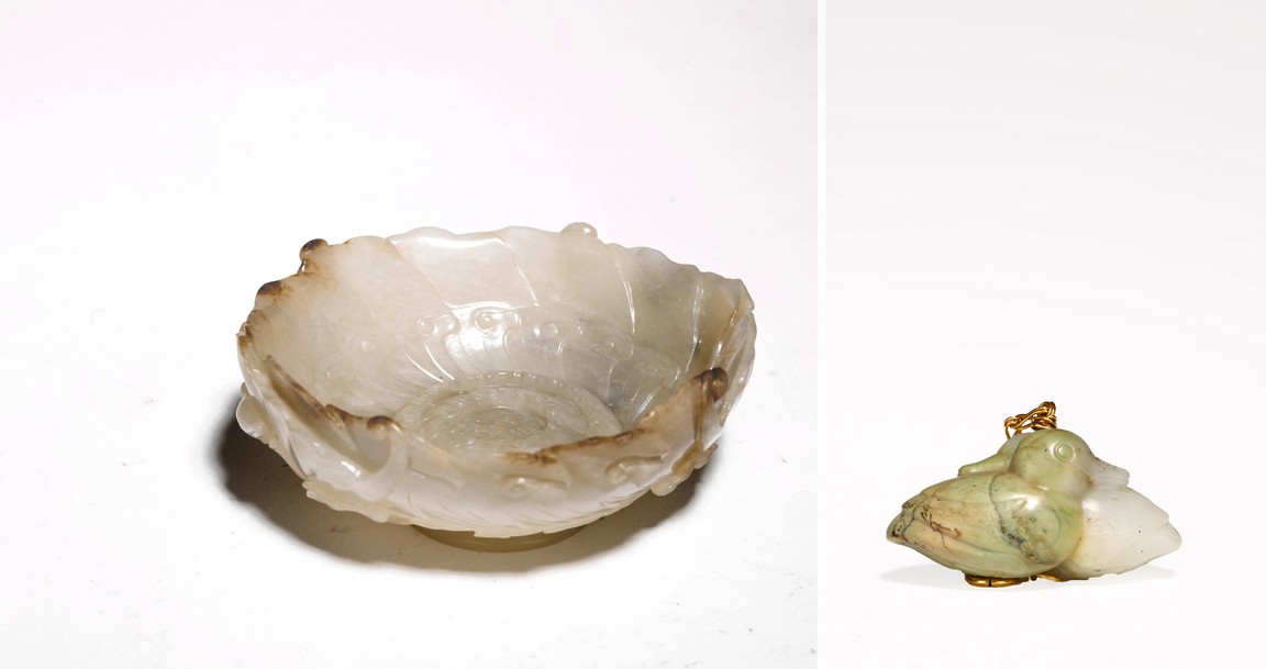 1) Ming Dynasty period. The stone carved in the form of a pair of mandarin ducks with head resting on each other's back, one duck dyed pale green, the other duck left white. 2) Ming Dynasty period. Of mallow petal form, the interior center carved with a stylized shou character, the exterior carved in relief with two bats above lotus flower.