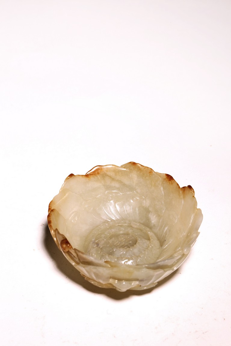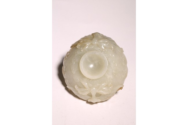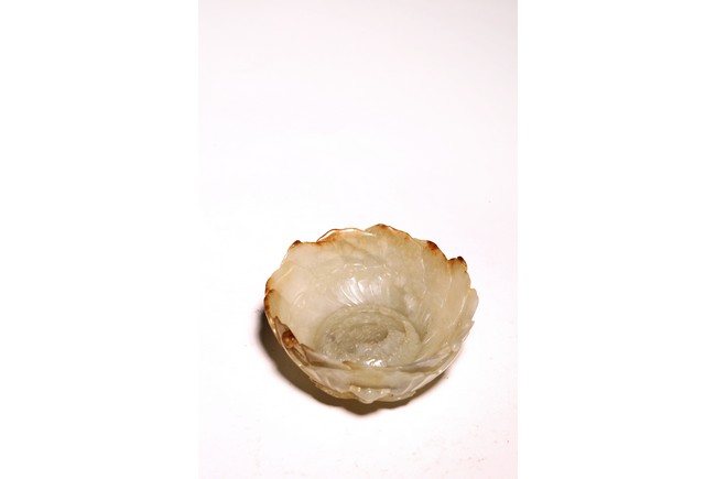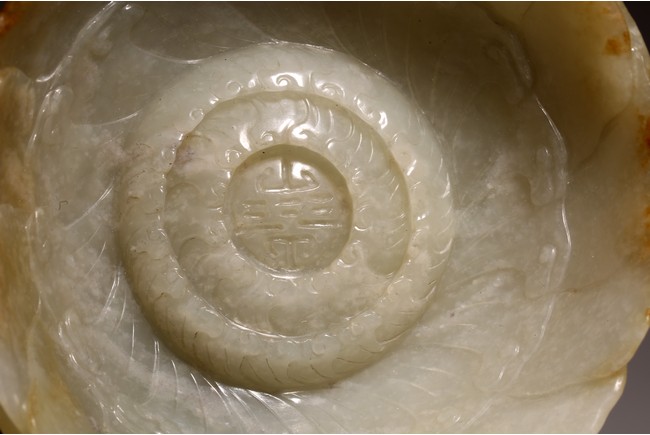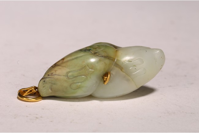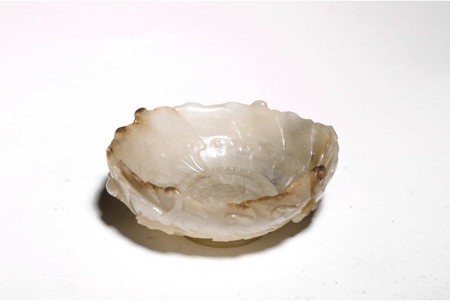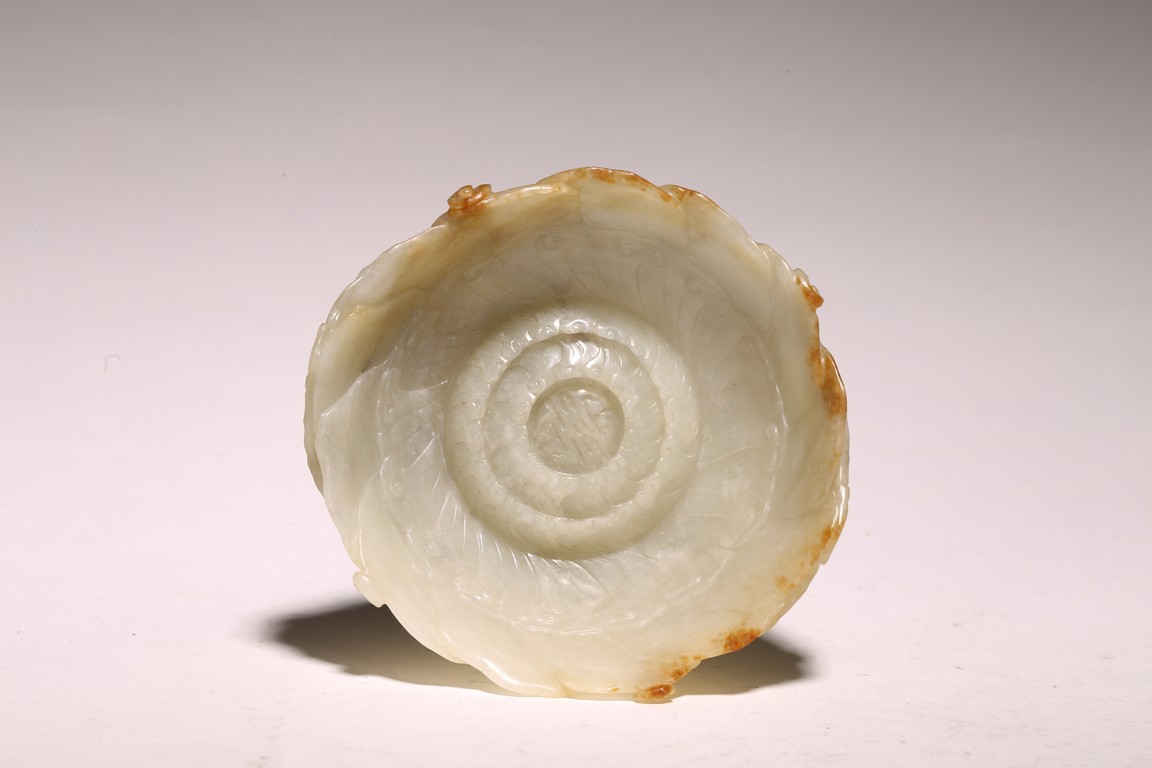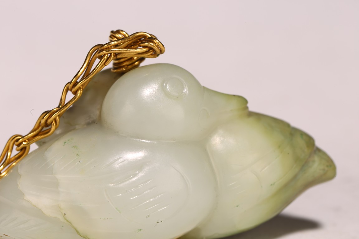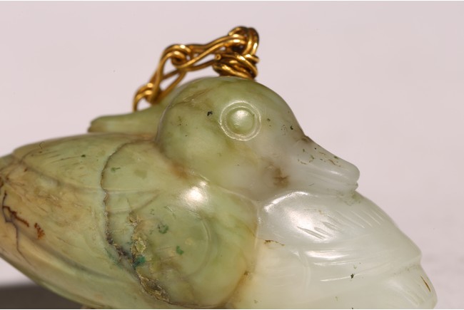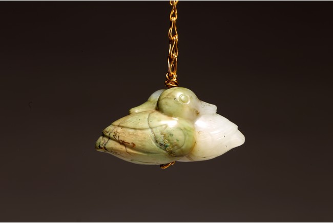 1) Ming Dynasty period. The stone carved in the form of a pair of mandarin ducks with head resting on each other's back, one duck dyed pale green, the other duck left white. 2) Ming Dynasty period. Of mallow petal form, the interior center carved with a stylized shou character, the exterior carved in relief with two bats above lotus flower.
