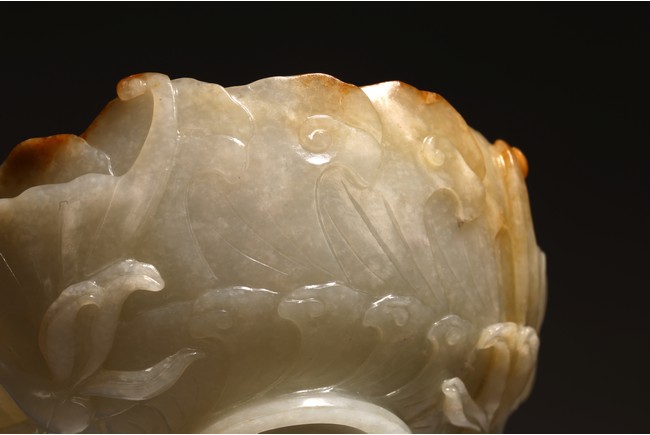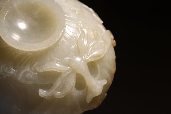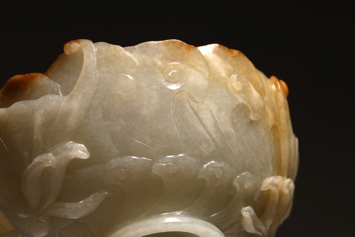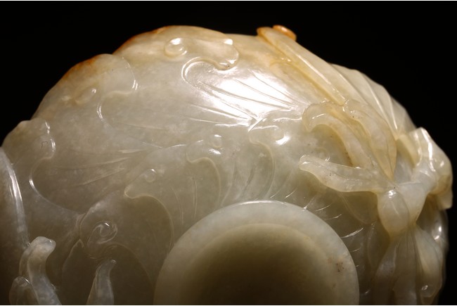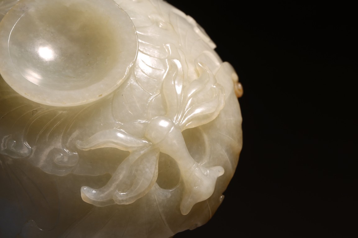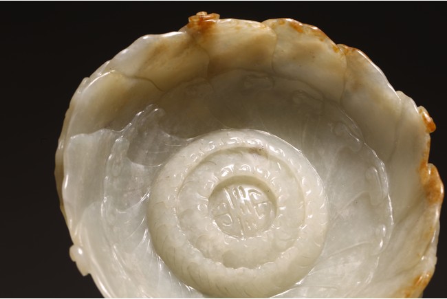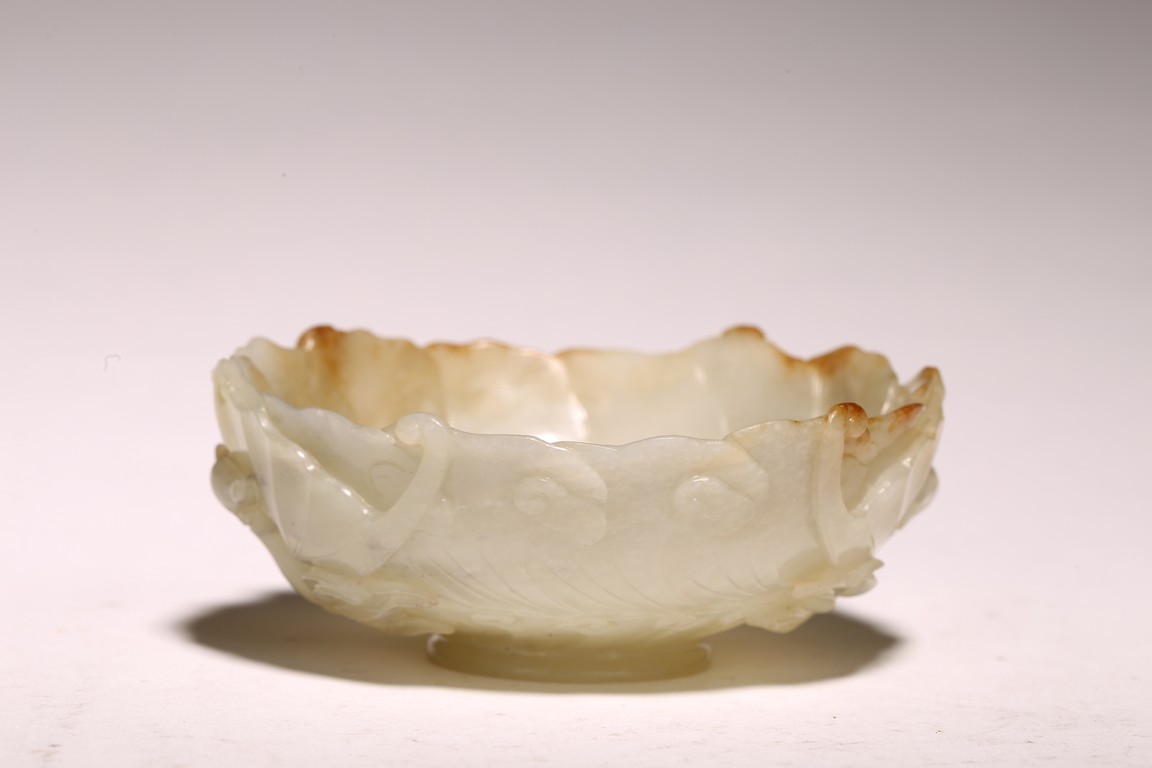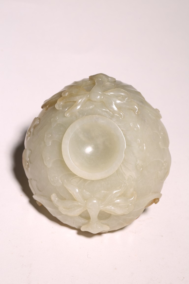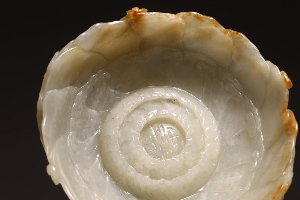 1) Ming Dynasty period. The stone carved in the form of a pair of mandarin ducks with head resting on each other's back, one duck dyed pale green, the other duck left white. 2) Ming Dynasty period. Of mallow petal form, the interior center carved with a stylized shou character, the exterior carved in relief with two bats above lotus flower.