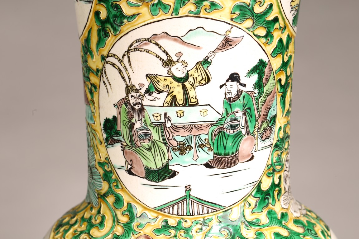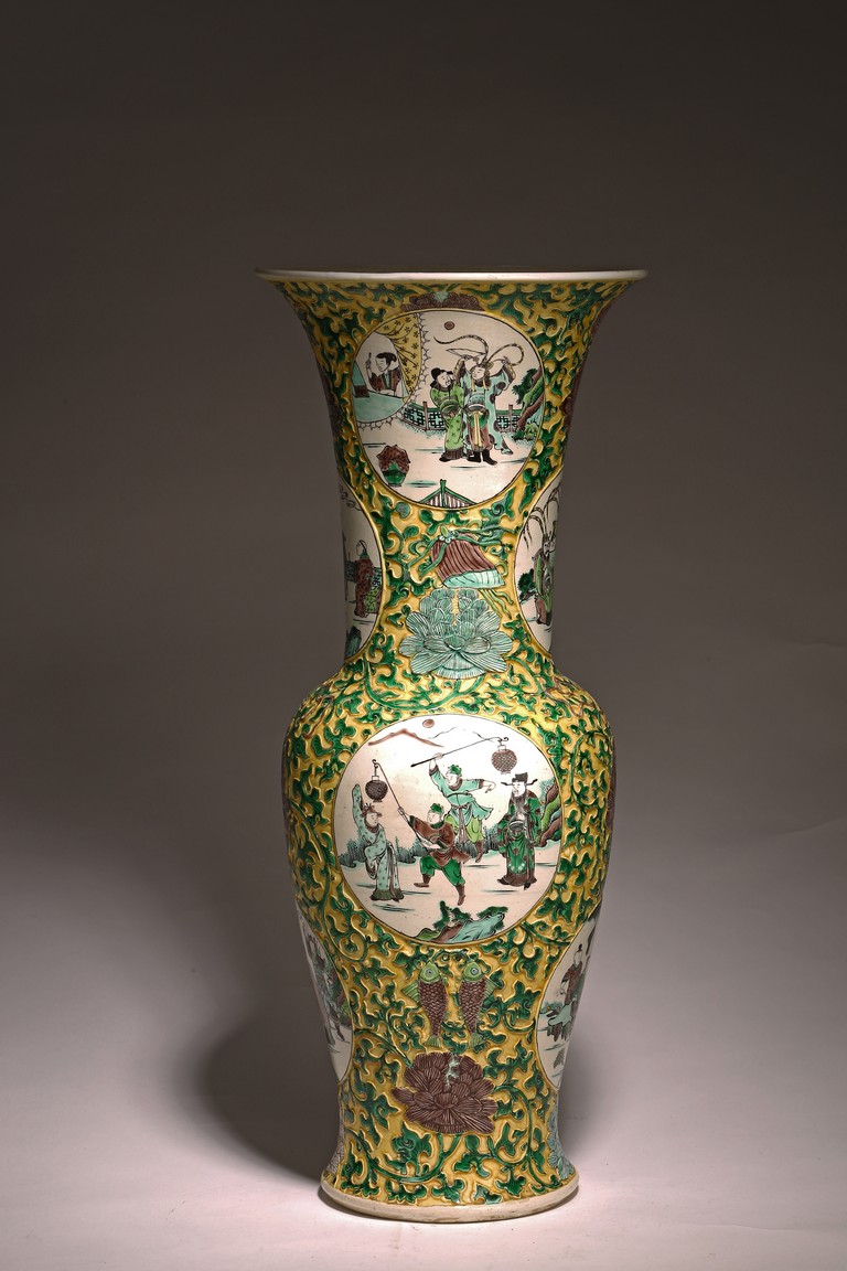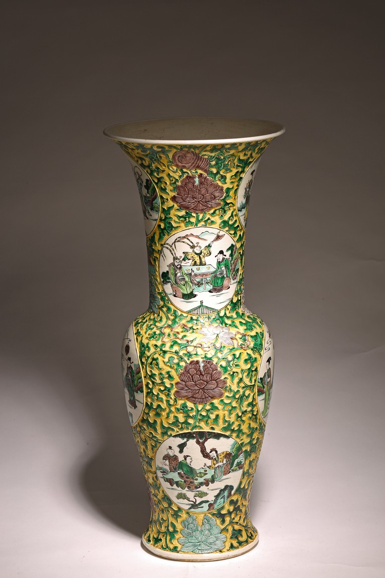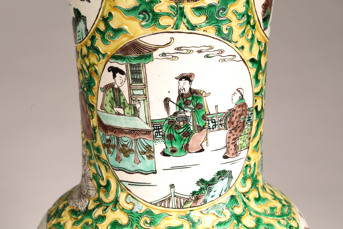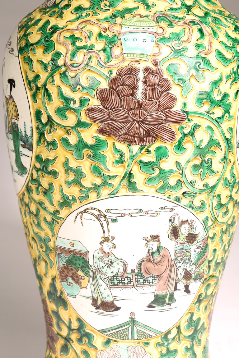 Qing Dynasty period. The globular body rising from a flared foot to a wasted neck terminating in a wide trumpet mouth, painted within circular cartouches enclosing various figural story scenes, reserved on relief carved meandering lotus scroll, lotus blooms, and auspicious objects, all reserved on yellow ground.