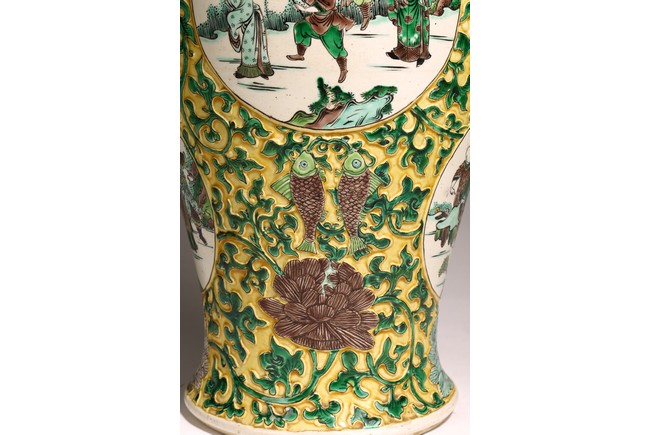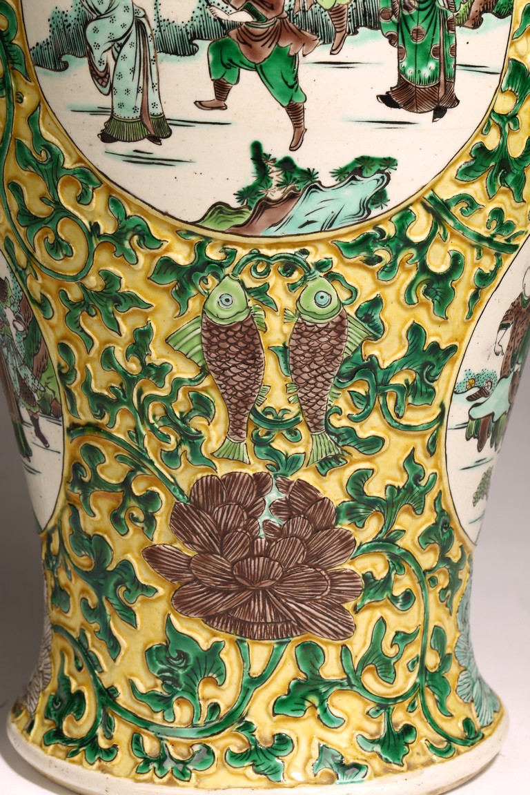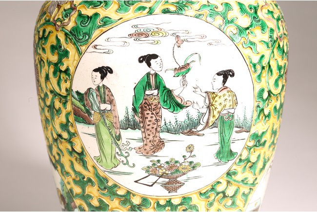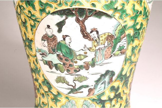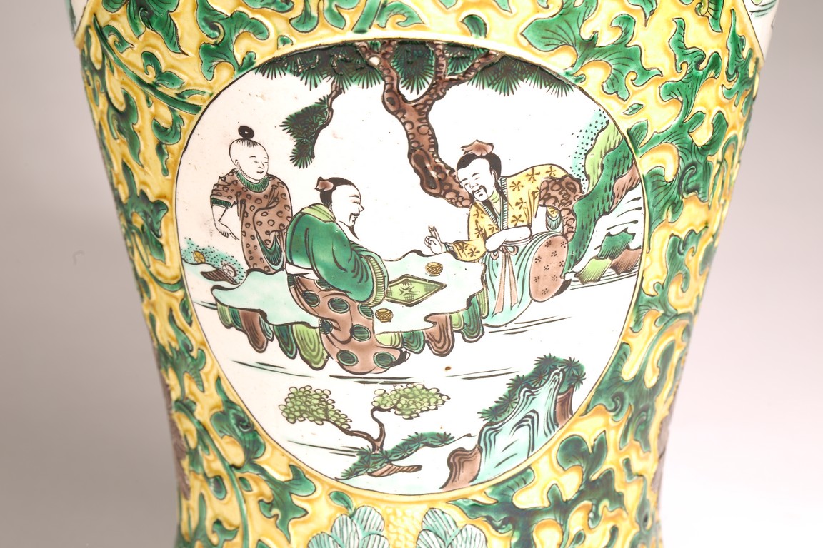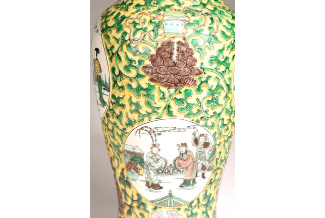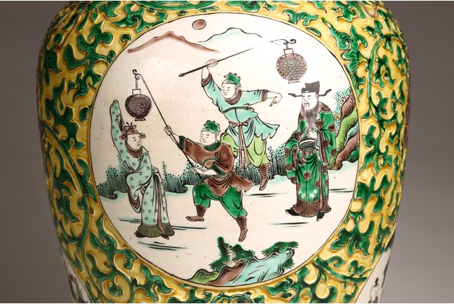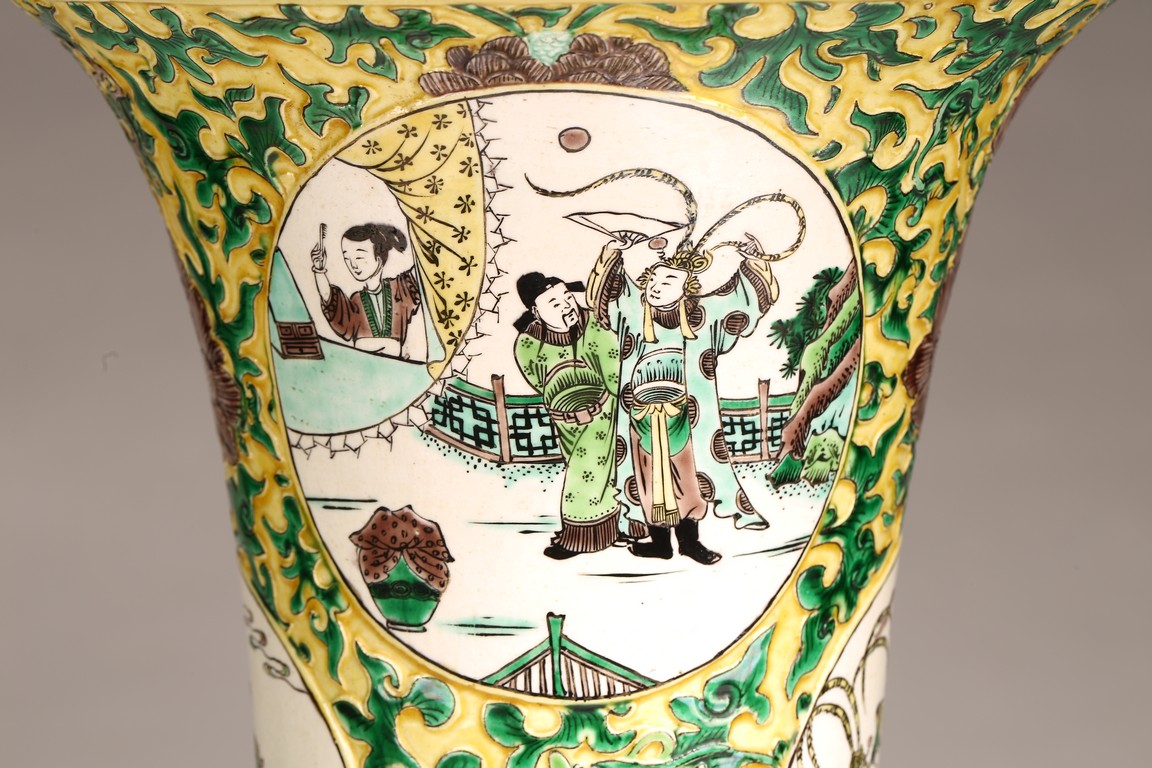 Qing Dynasty period. The globular body rising from a flared foot to a wasted neck terminating in a wide trumpet mouth, painted within circular cartouches enclosing various figural story scenes, reserved on relief carved meandering lotus scroll, lotus blooms, and auspicious objects, all reserved on yellow ground.