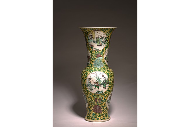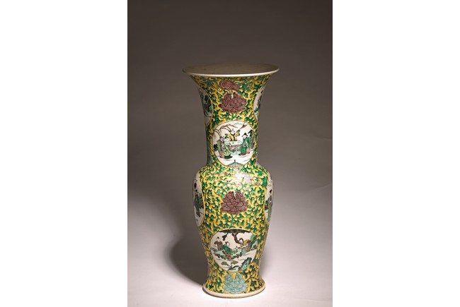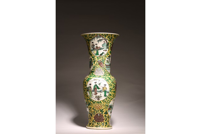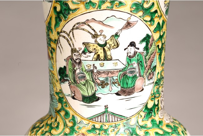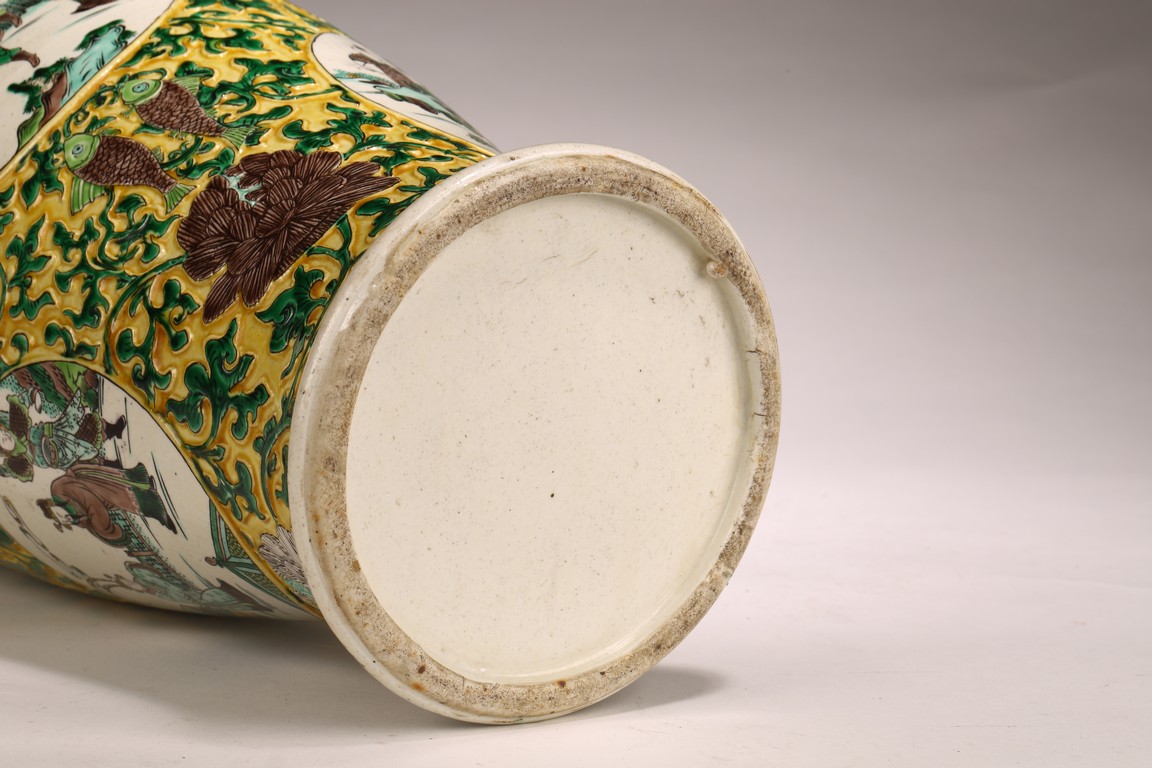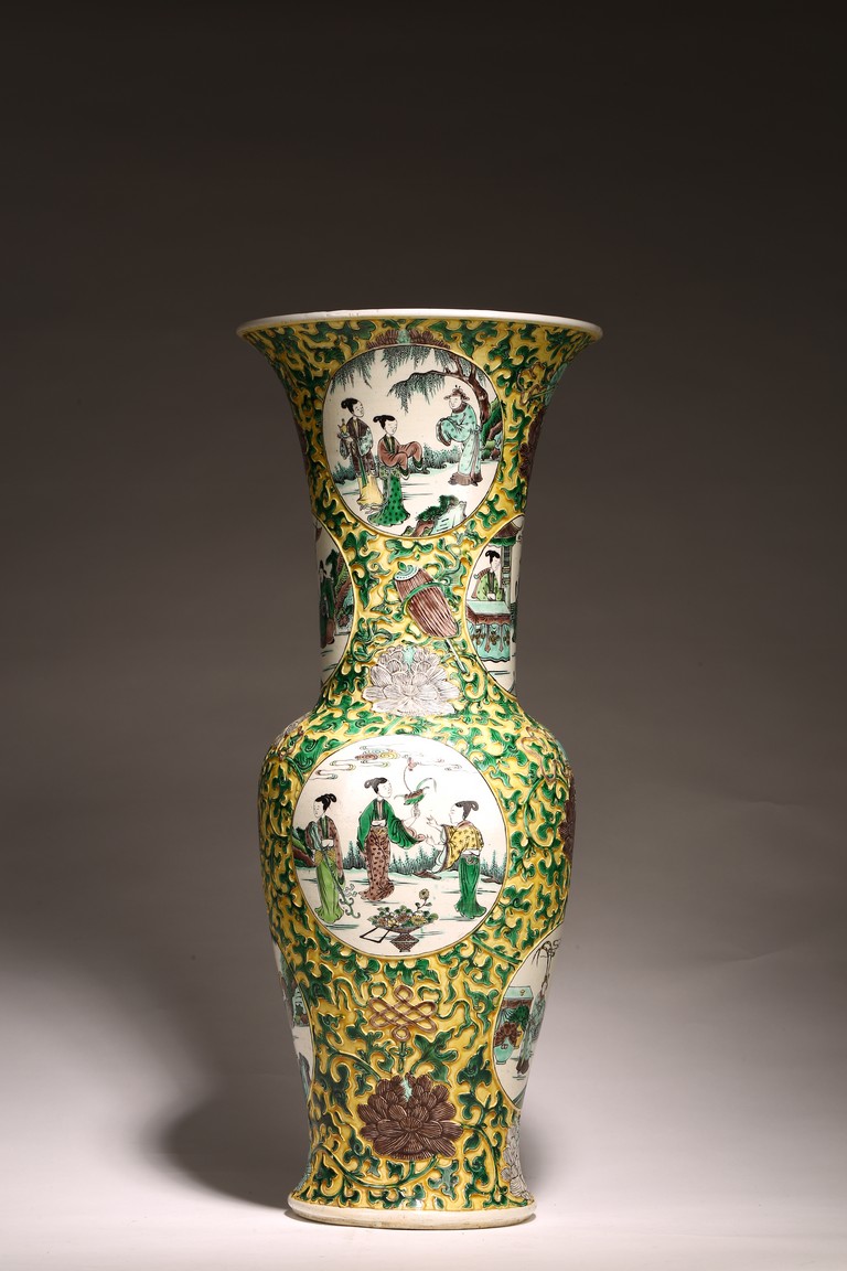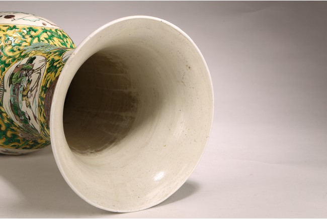 素三彩是明清景德鎮生産的彩瓷品種之一,以黃、綠、紫三色 裝飾彩料爲主,有時還加少許白彩和黑彩,因無紅彩,色調冷豔、 素雅,故稱爲“素三彩”。 喇叭口,長頸,鼓腹,束腰,矮圈足。外壁通體施素三彩以“纏 枝花卉紋”“八寶紋”爲地繪人物故事圖,仕女形態優美,高束發, 柳葉眉,高鼻,小嘴,身著長袍,四周爲山石、樹木、卷雲,整體 器型碩大,造型規整,胎質細膩,畫工精湛,構圖清晰,畫面整體 豐富。