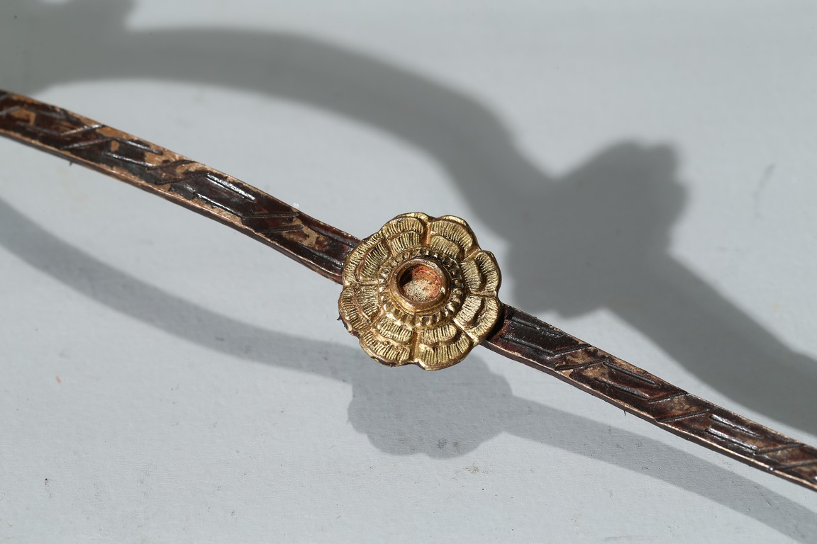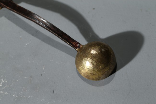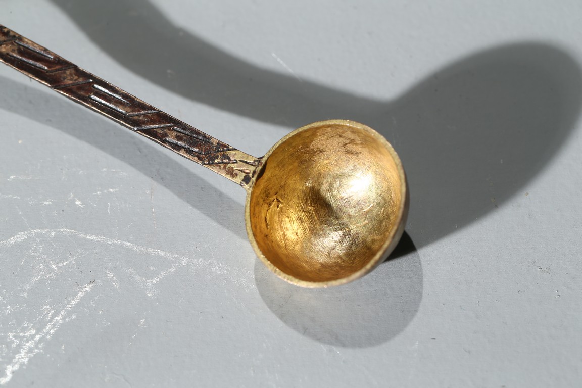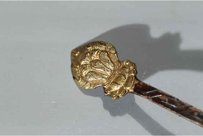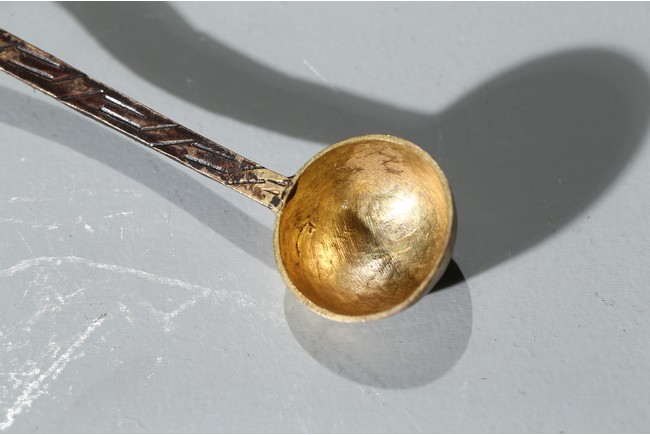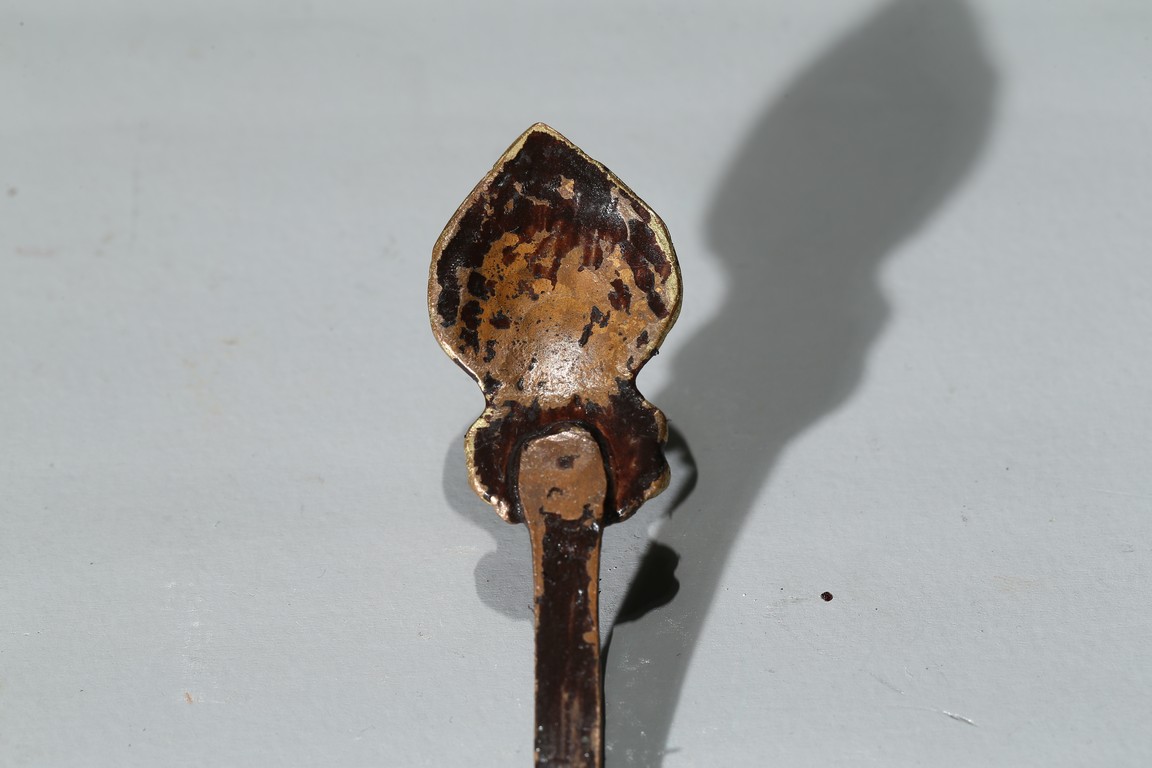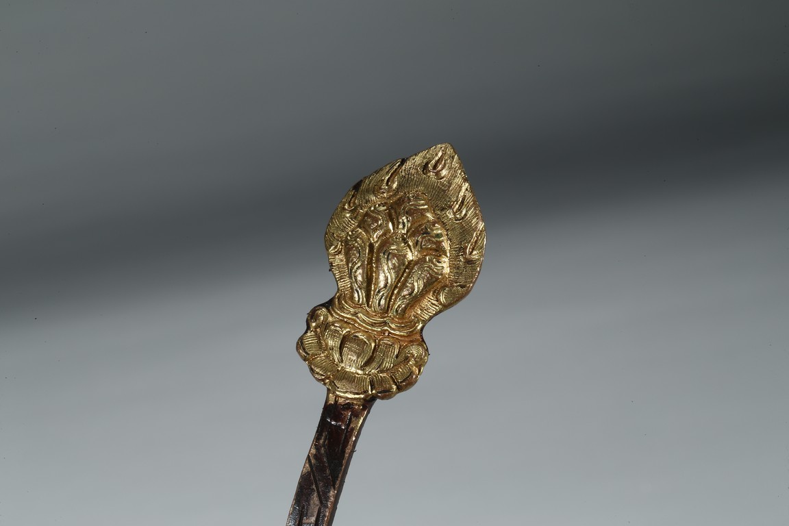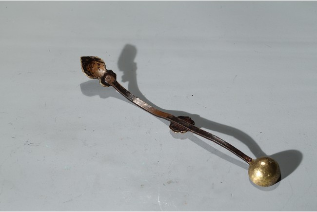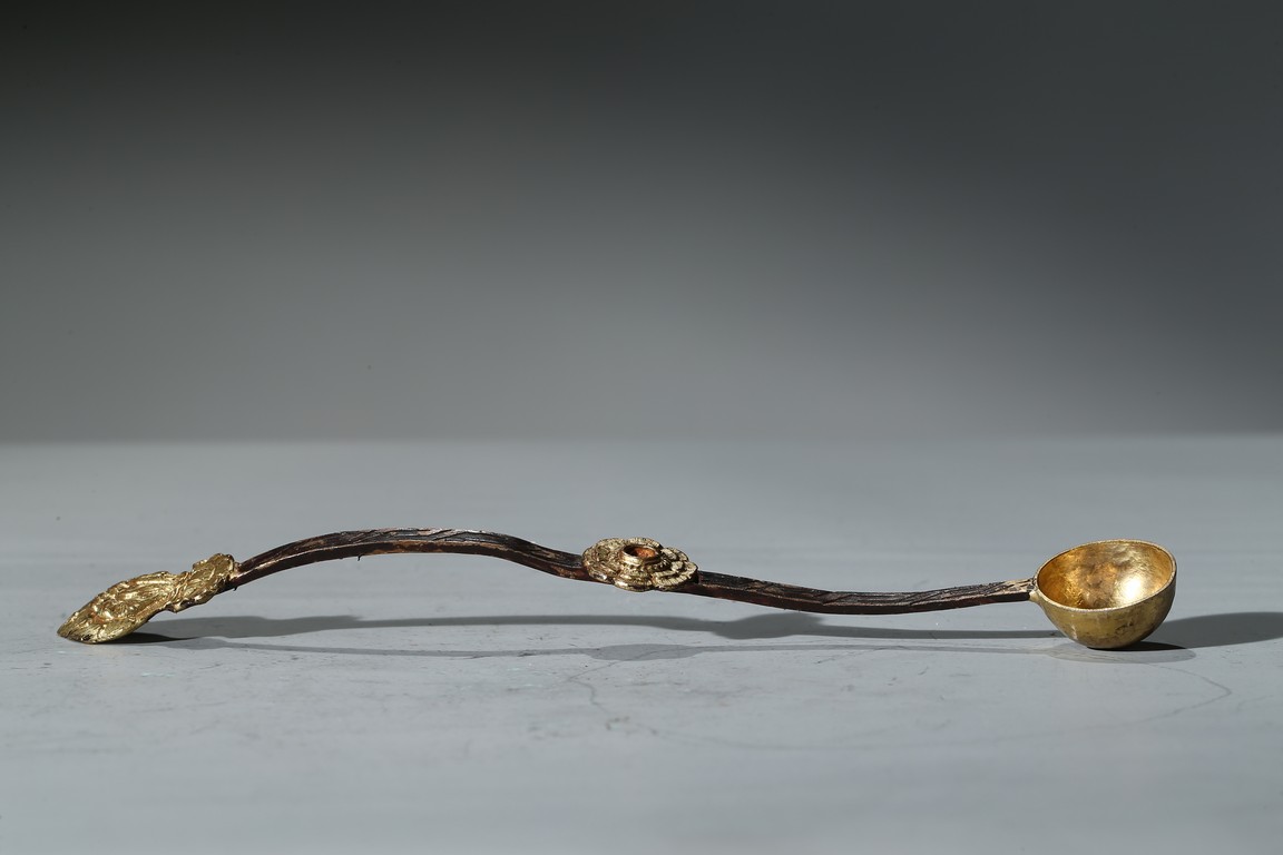勺首爲圓形,長柄,中部刻花朵,花開爛漫,給人以靈動悅目之感,整器線條簡潔流 暢,略有曲折,鎏金更顯富麗堂皇。
