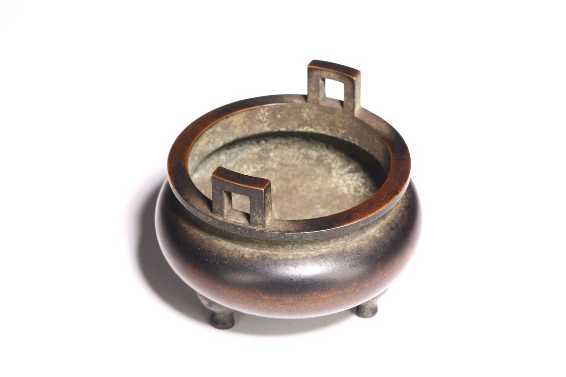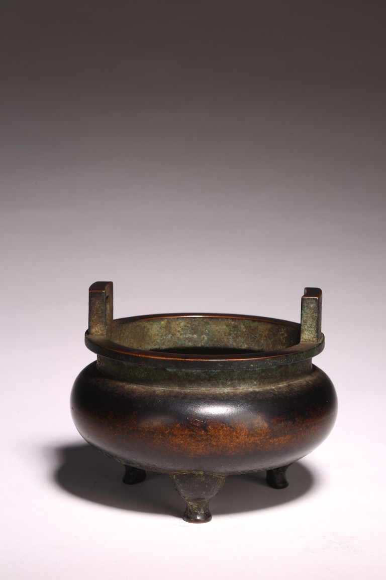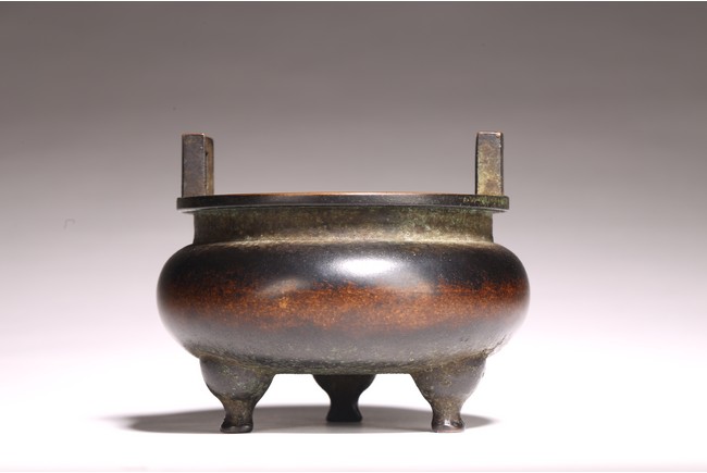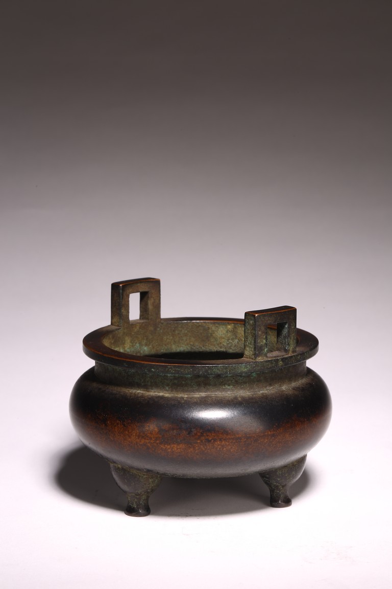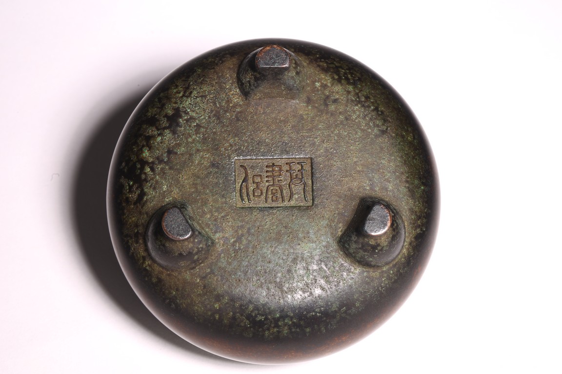 形體飽滿,雙耳峻峭,耳孔爲長方形,雙衝天耳,束頸鼓腹,下承三足,足 端外撇。皮色呈黑漆色,寶光溢彩,底部書“ 琴書侶”款識,筆力遒勁,其銅 質細膩精煉,入手沈墜,陳設于室可賞其形,品香論道可取其神,堪稱神形兼備。
